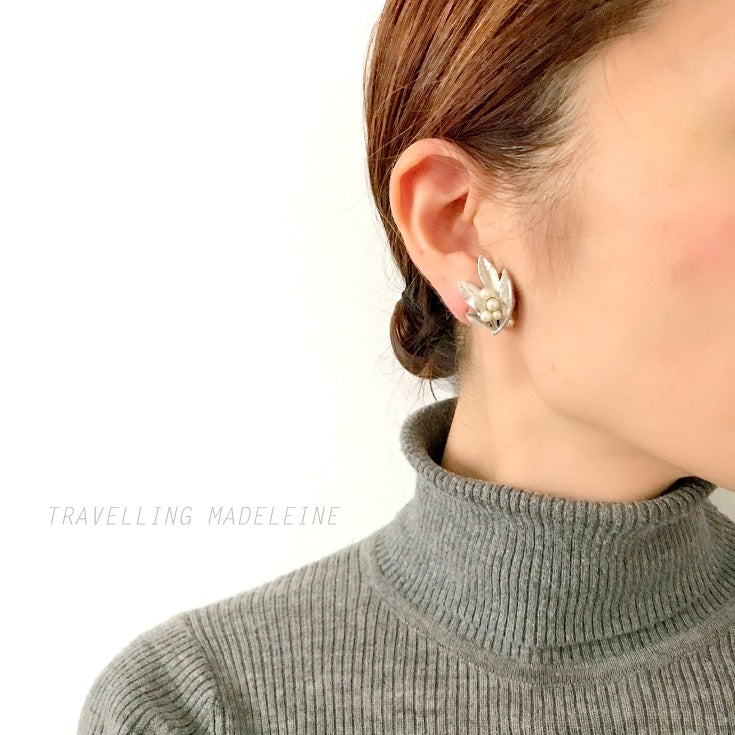 輝くシルバートーンリーフに、パールが実のようについたトリファリのクリップイヤリング。