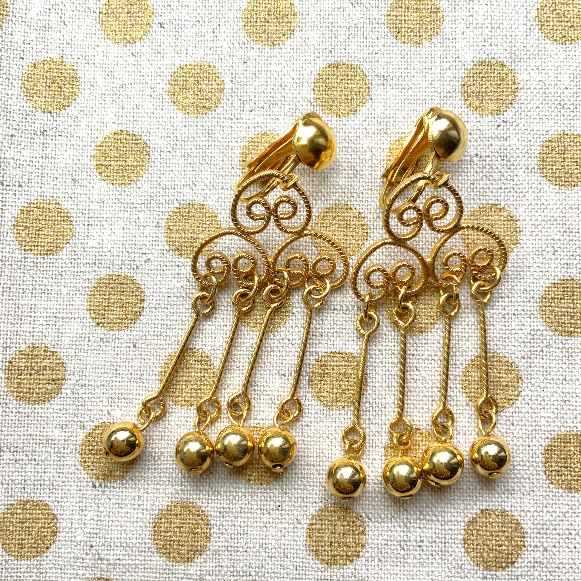 Clip earrings with a swirling gold-tone wire pattern and small ball fringes.