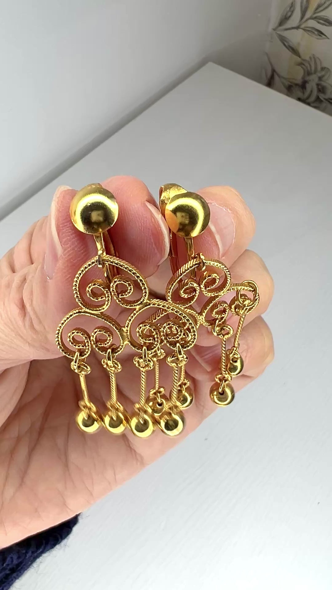 ゴールドトーンのワイヤーのスウィール模様に、小さなボールのフリンジが揺れるクリップイヤリング。