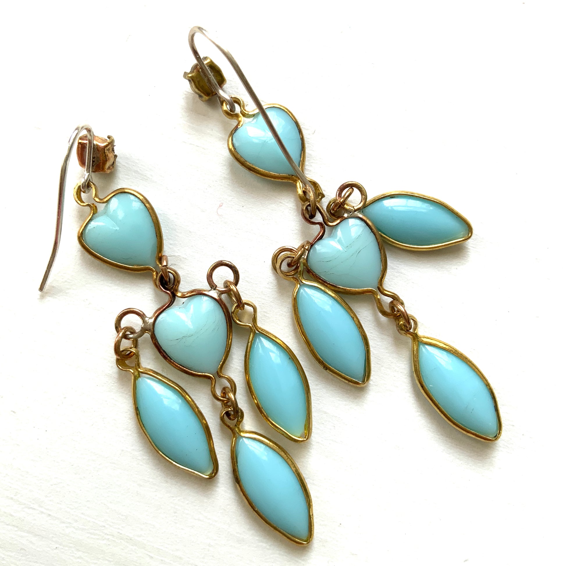 VINTAGE 1920s Turquoise Heart Glass Fringe Pierced Earrings