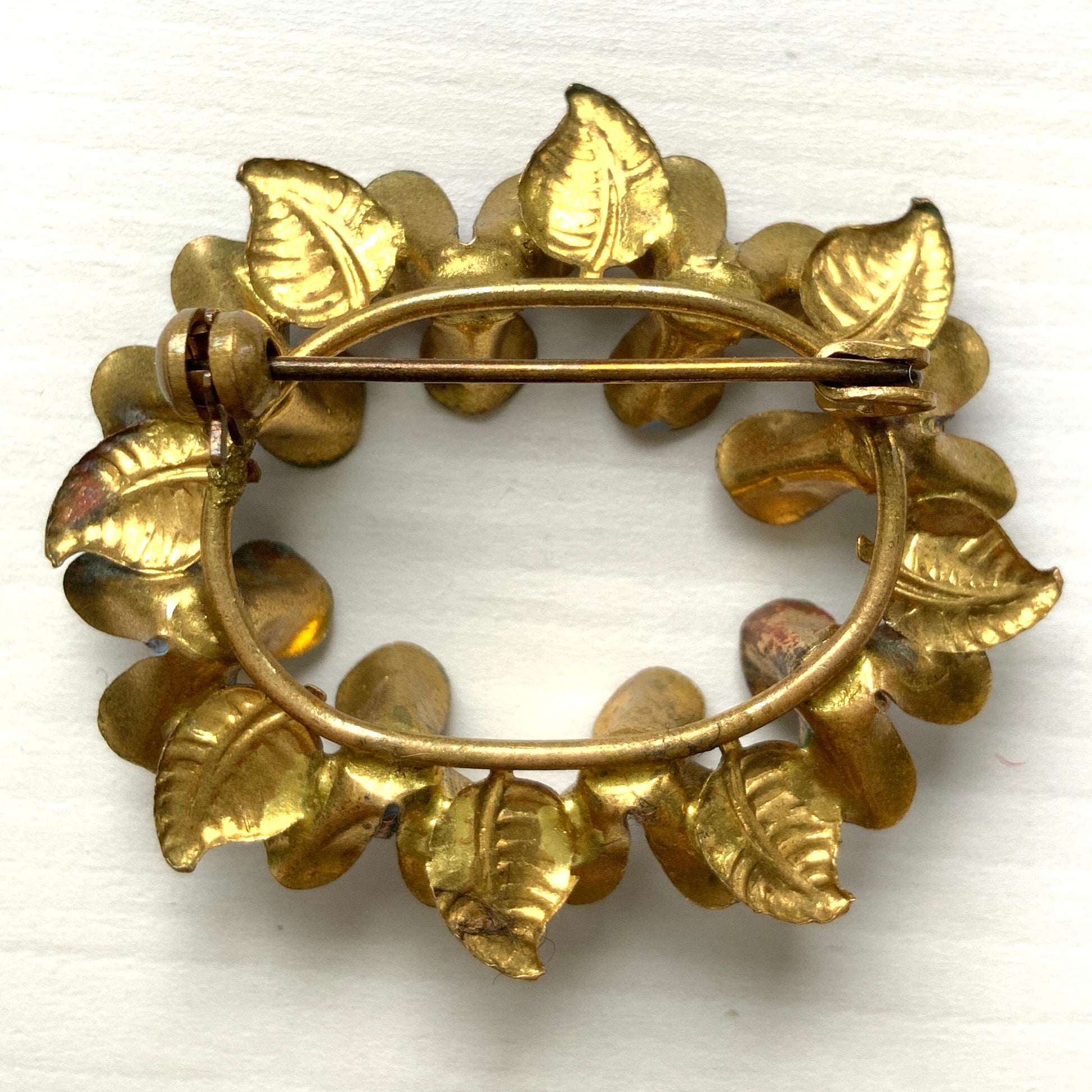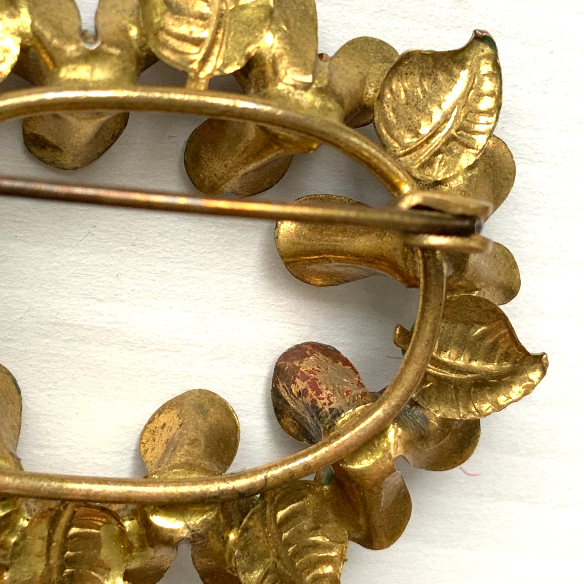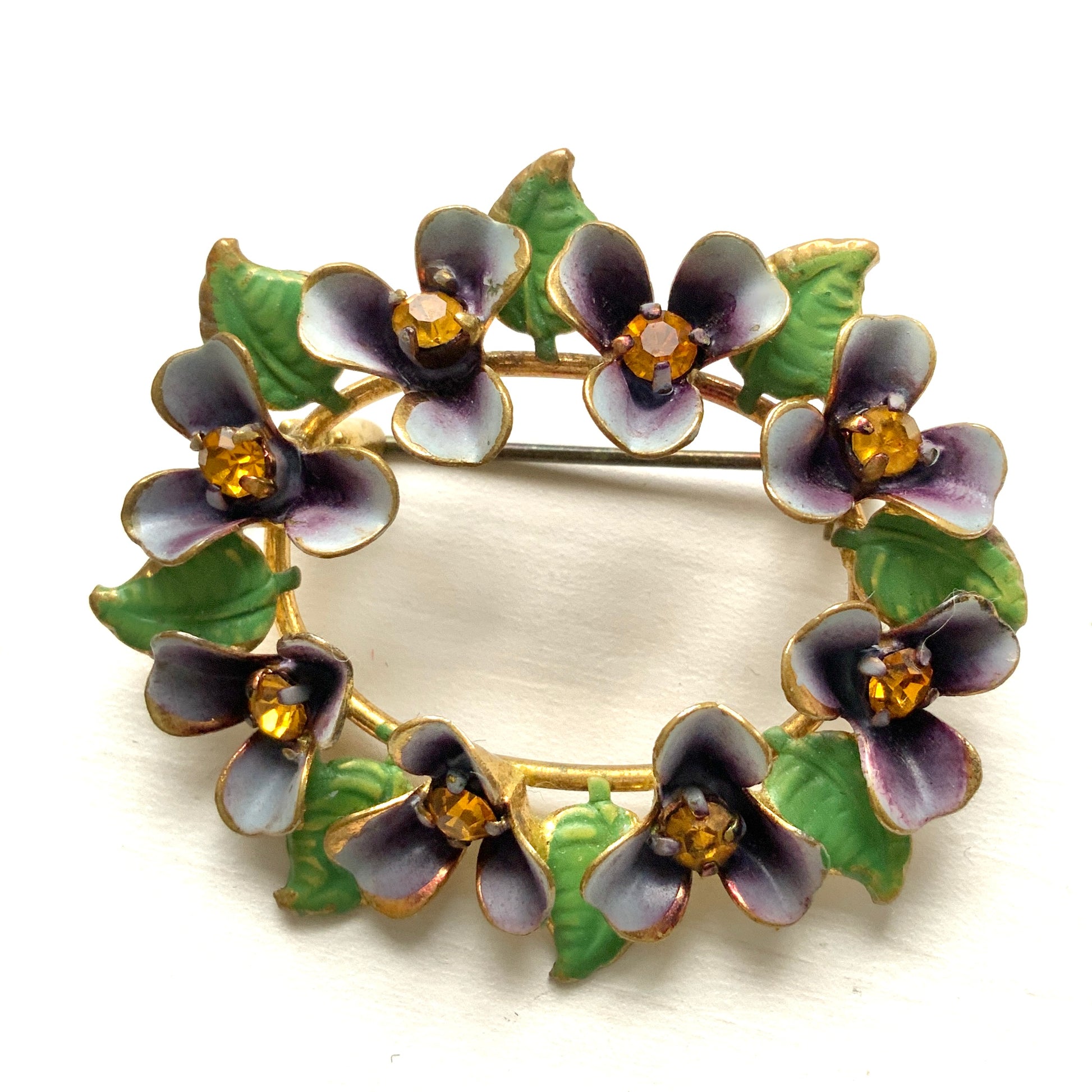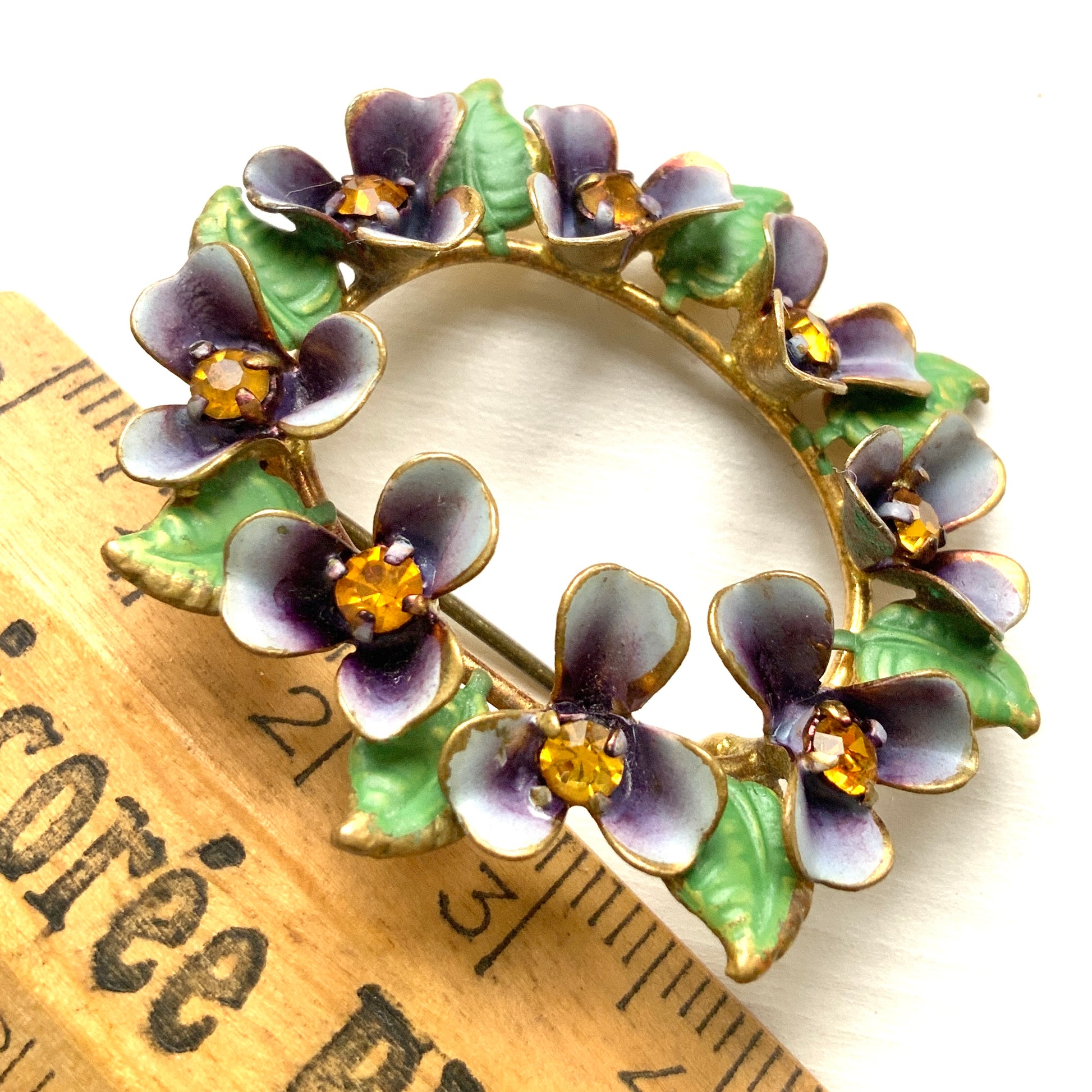 VINTAGE 1940-50's Enamel Violet & Yellow Rhinestone Wreath Brooch