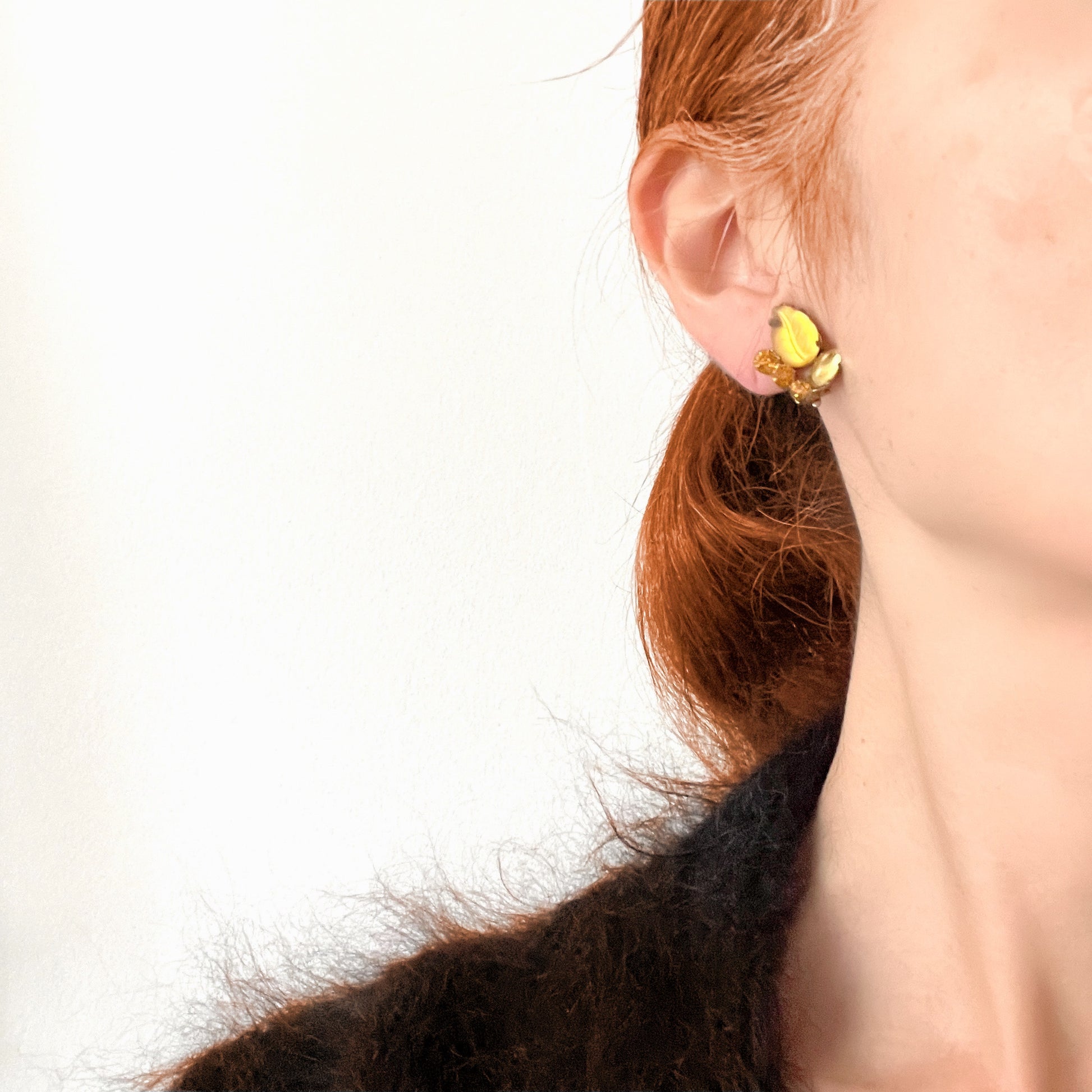 オレンジ/アンバーカラーの、フロストリーフグラスのクリップイヤリング。