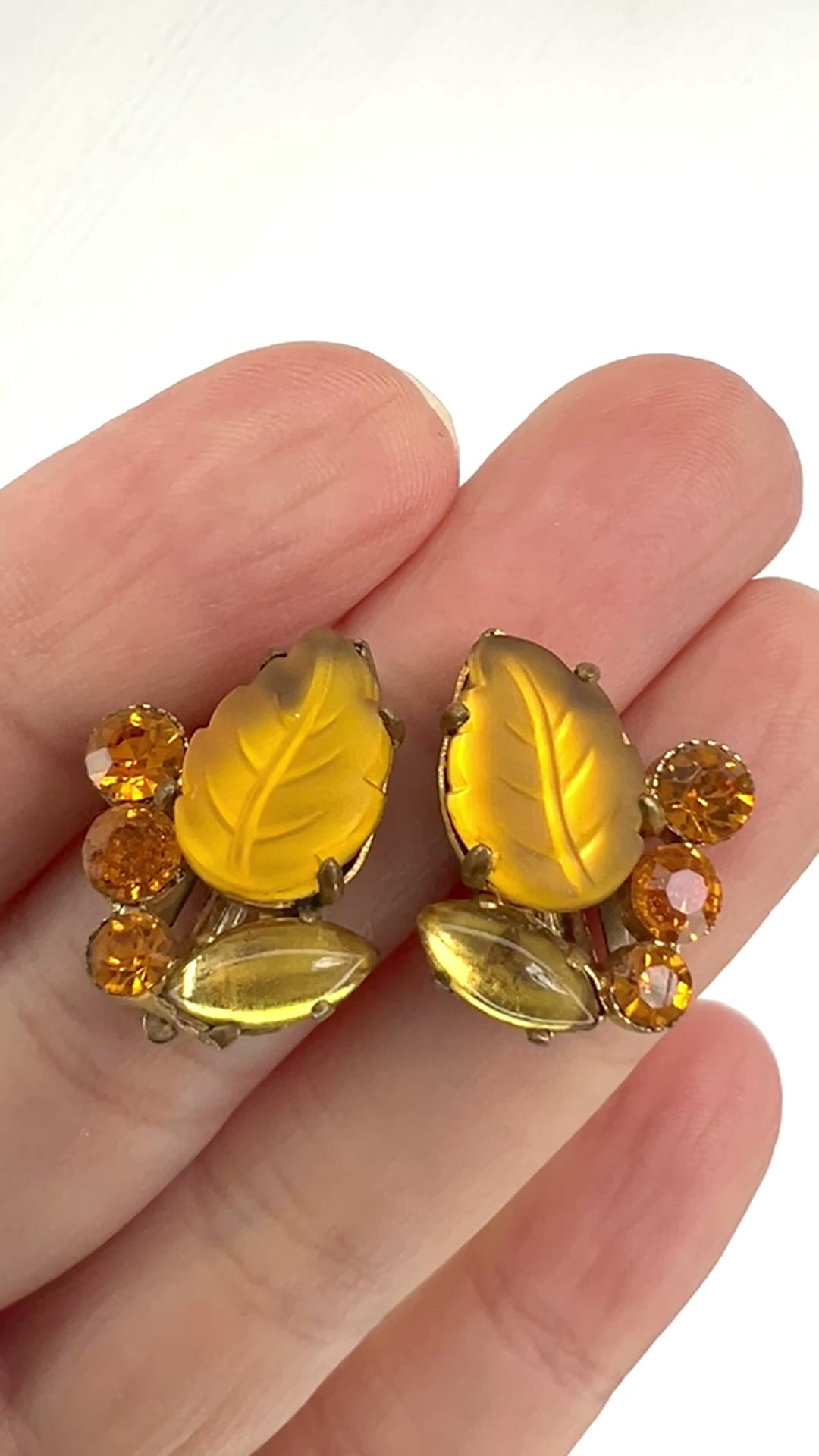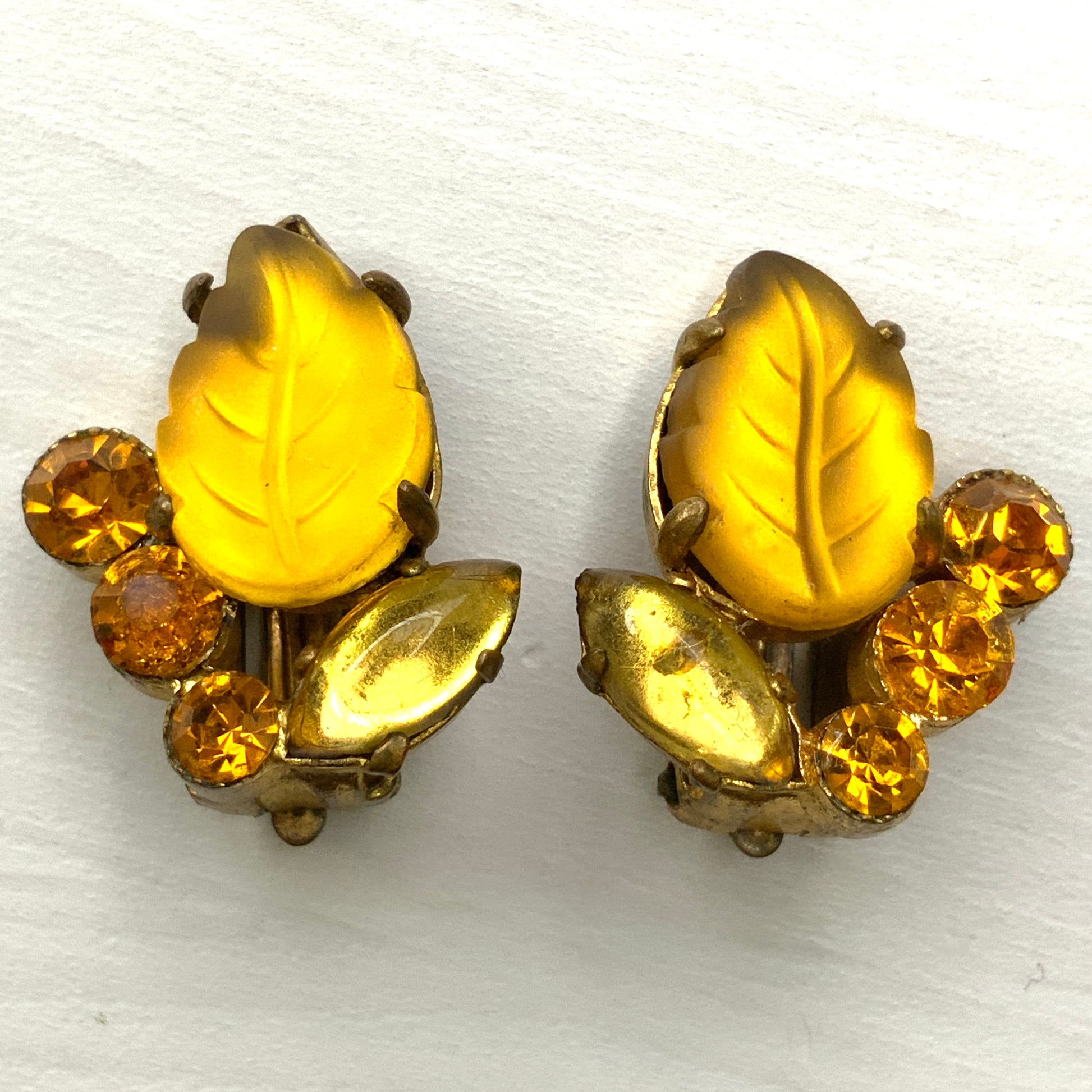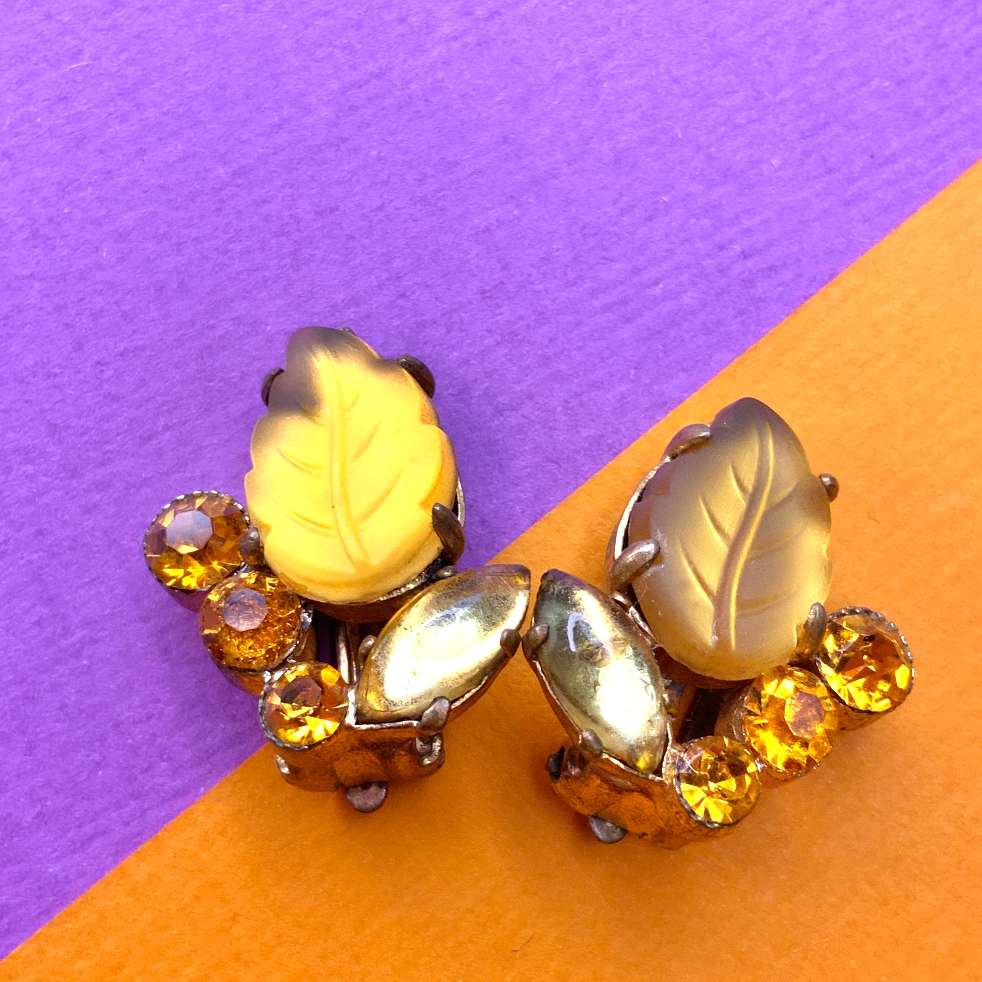VINTAGE 1950's Orange/Amber Frosted Leaf Glass Clip Earrings