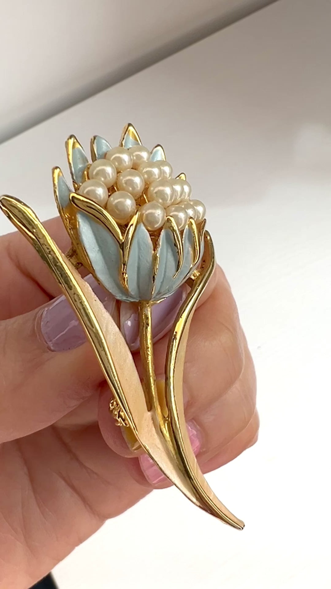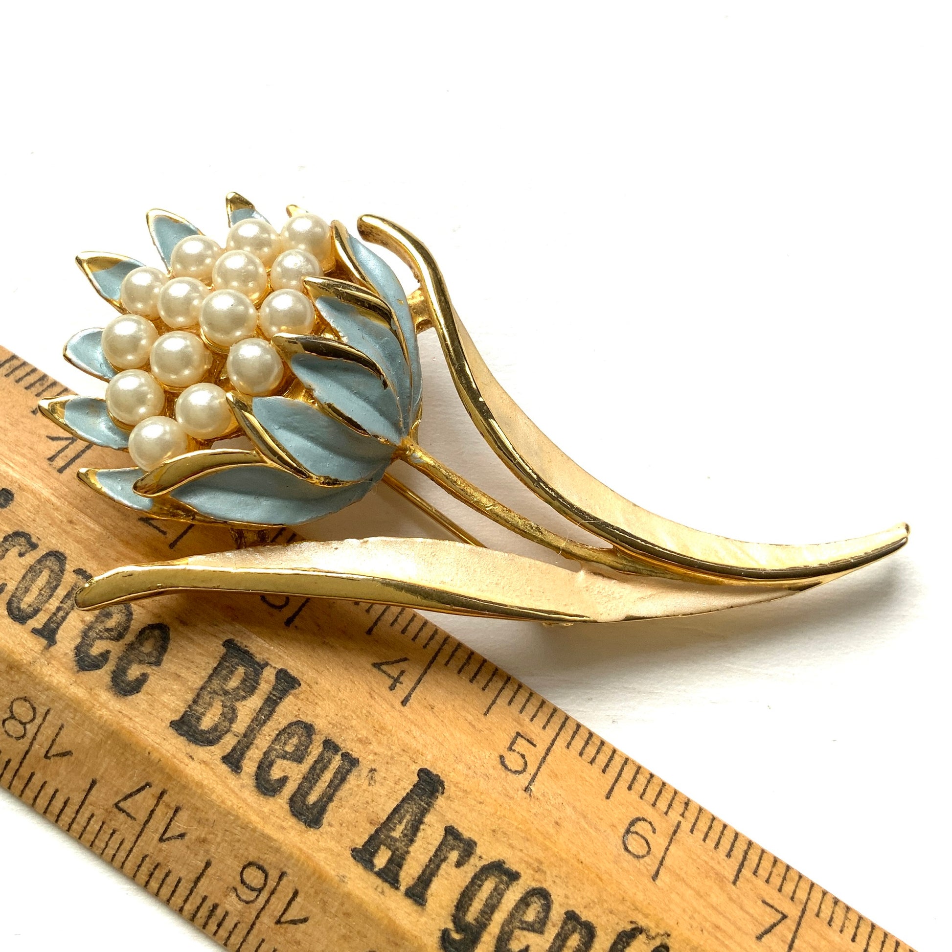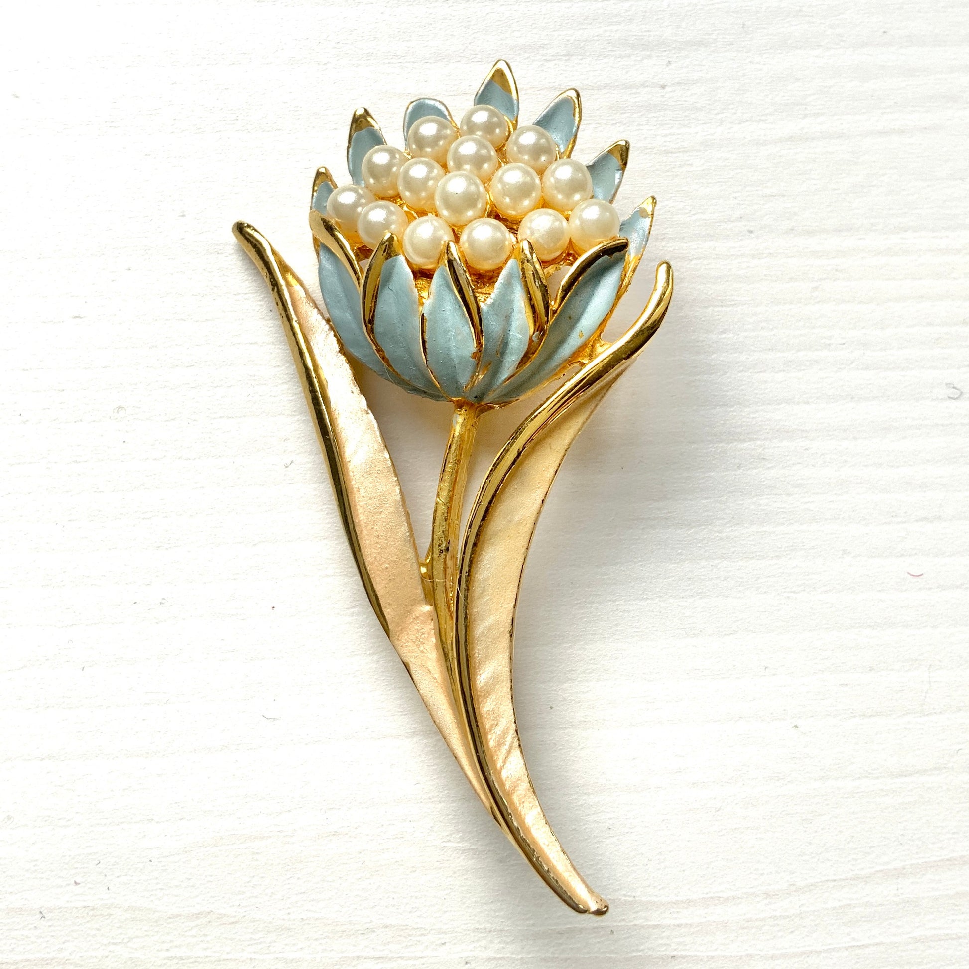 ゴールドトーンメタルのベースに、花びらはベビーブルー、葉はアイボリーのペイントが施されています。