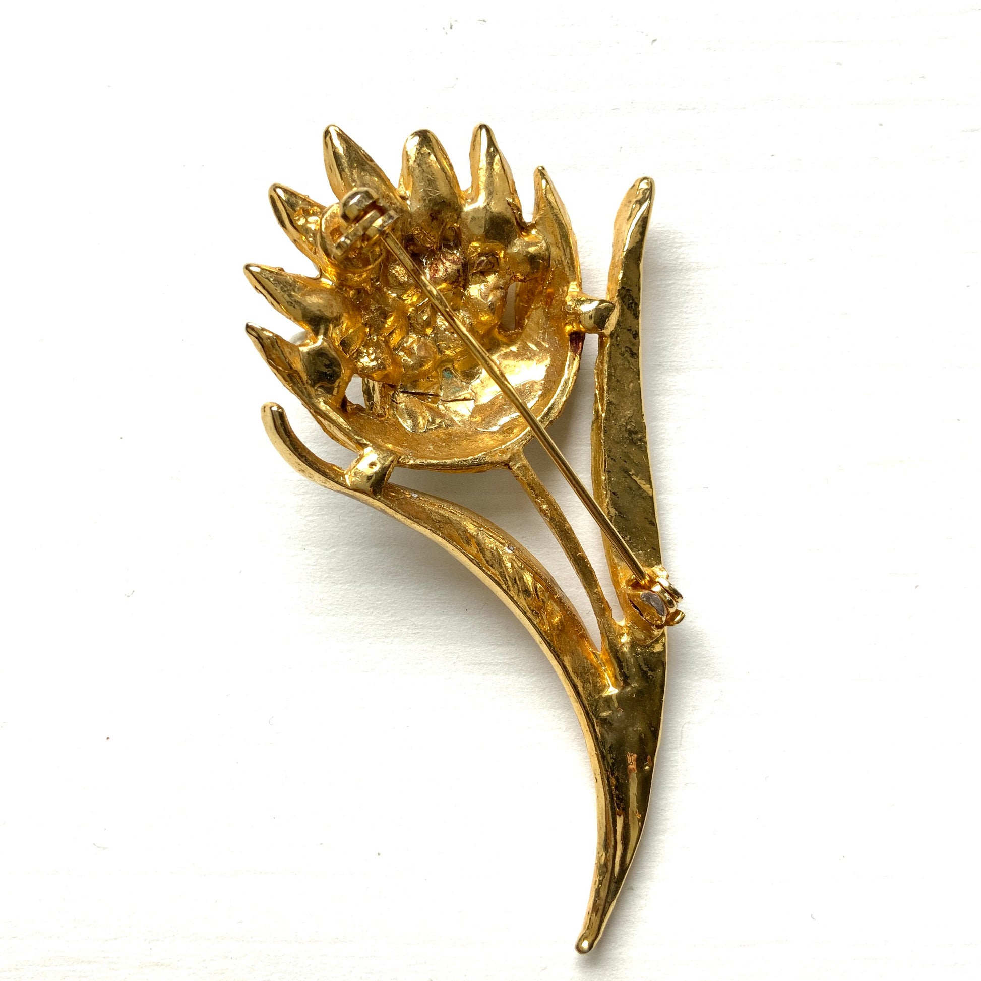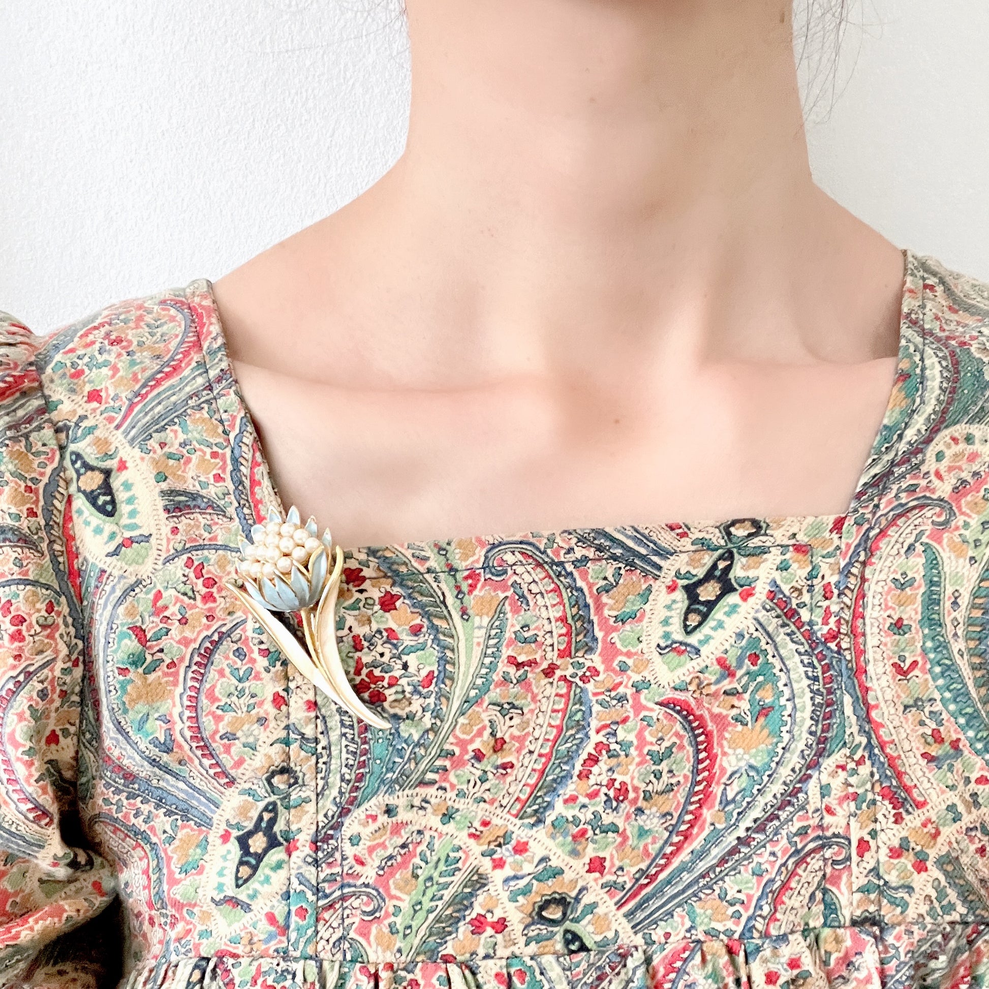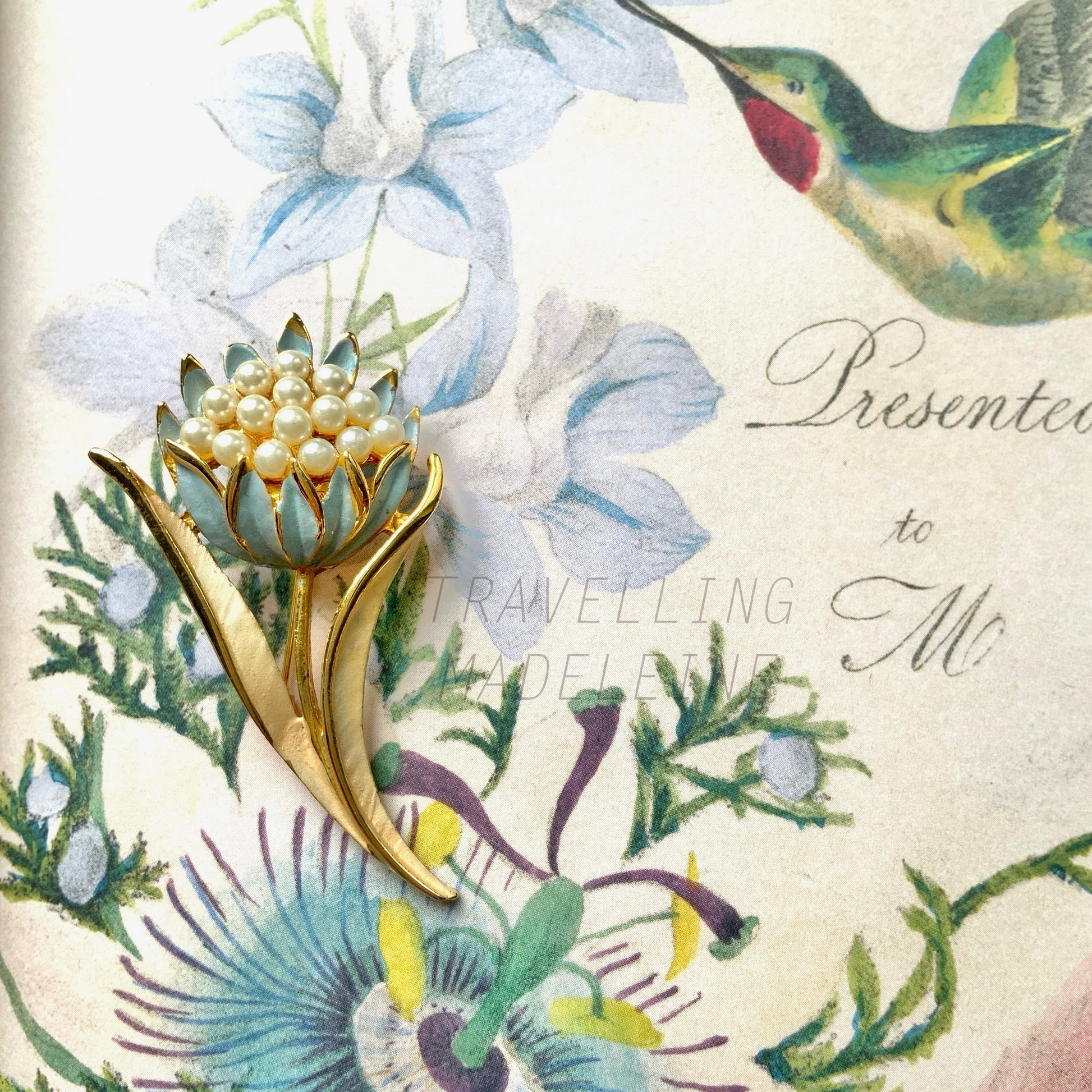 ゴールドトーンメタルのベースに、花びらはベビーブルー、葉はアイボリーのペイントが施されています。