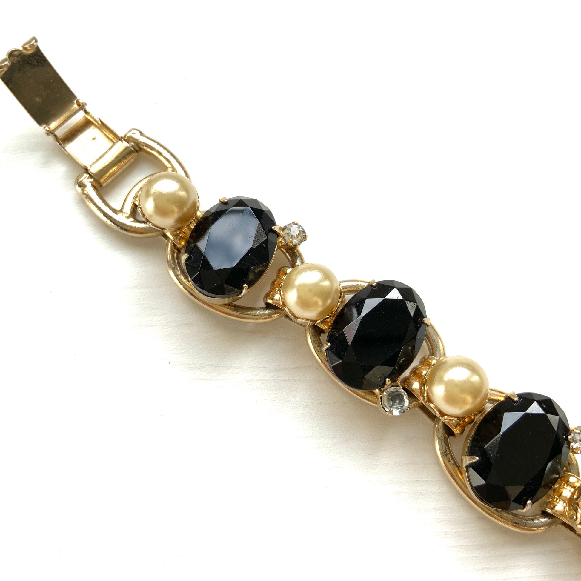 VINTAGE 1940s-50s Black Oval Glass & Glass Pearl Bracelet
