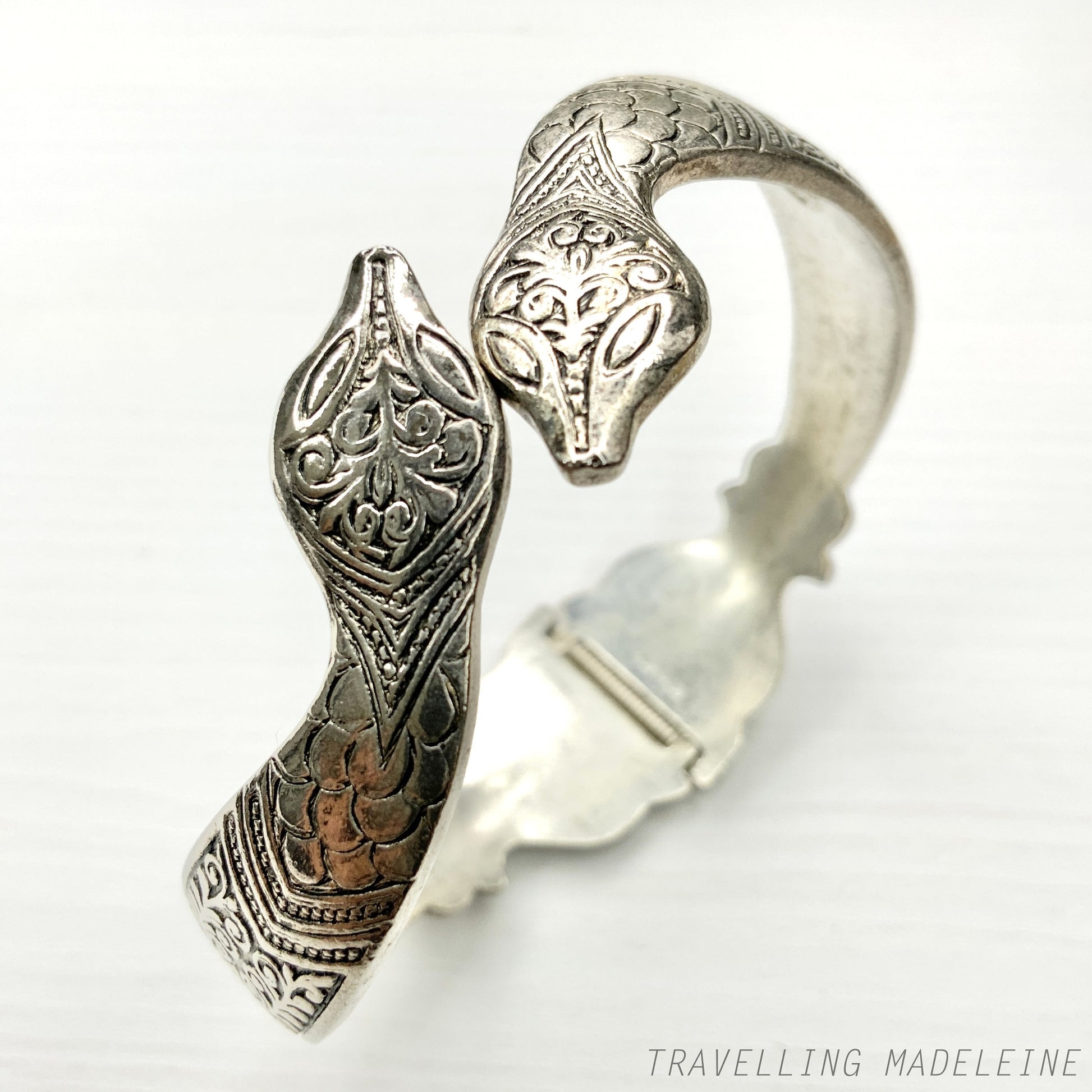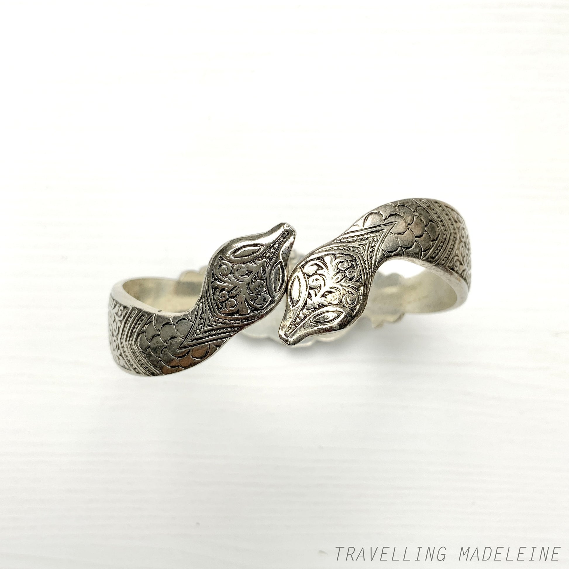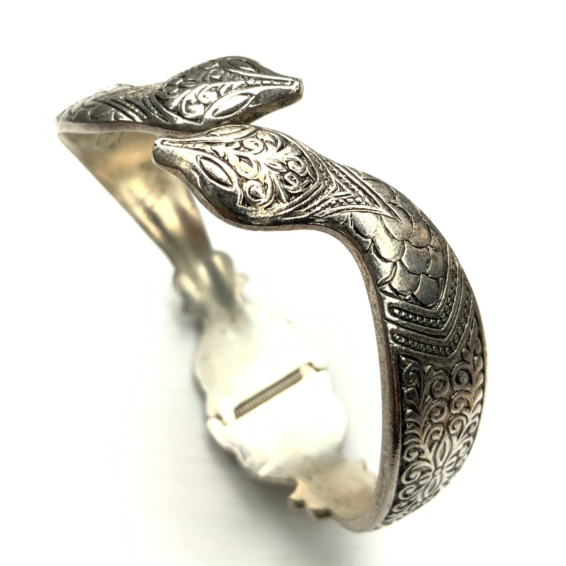 A double-headed snake bangle with beautiful engraving on silver-colored metal.
