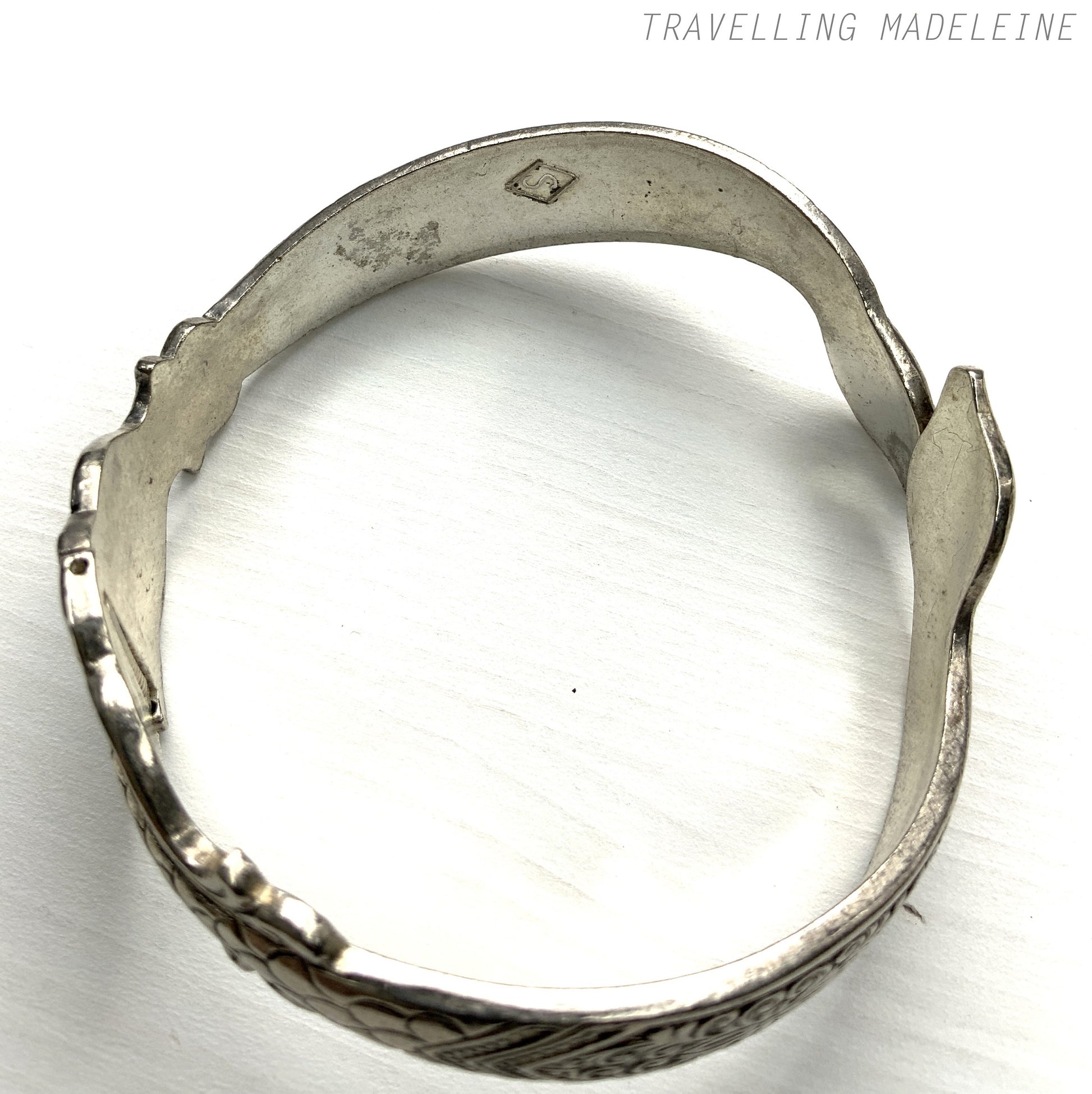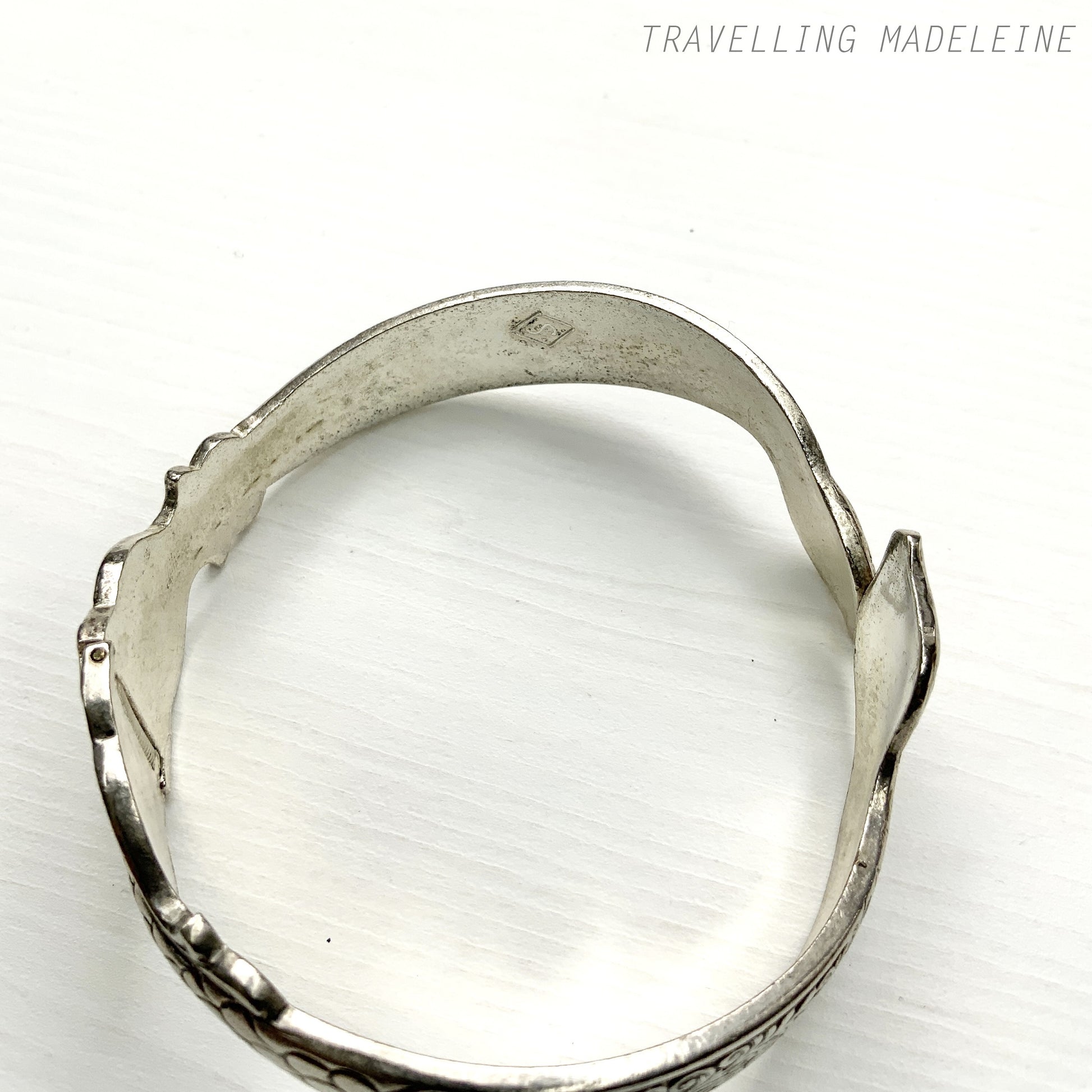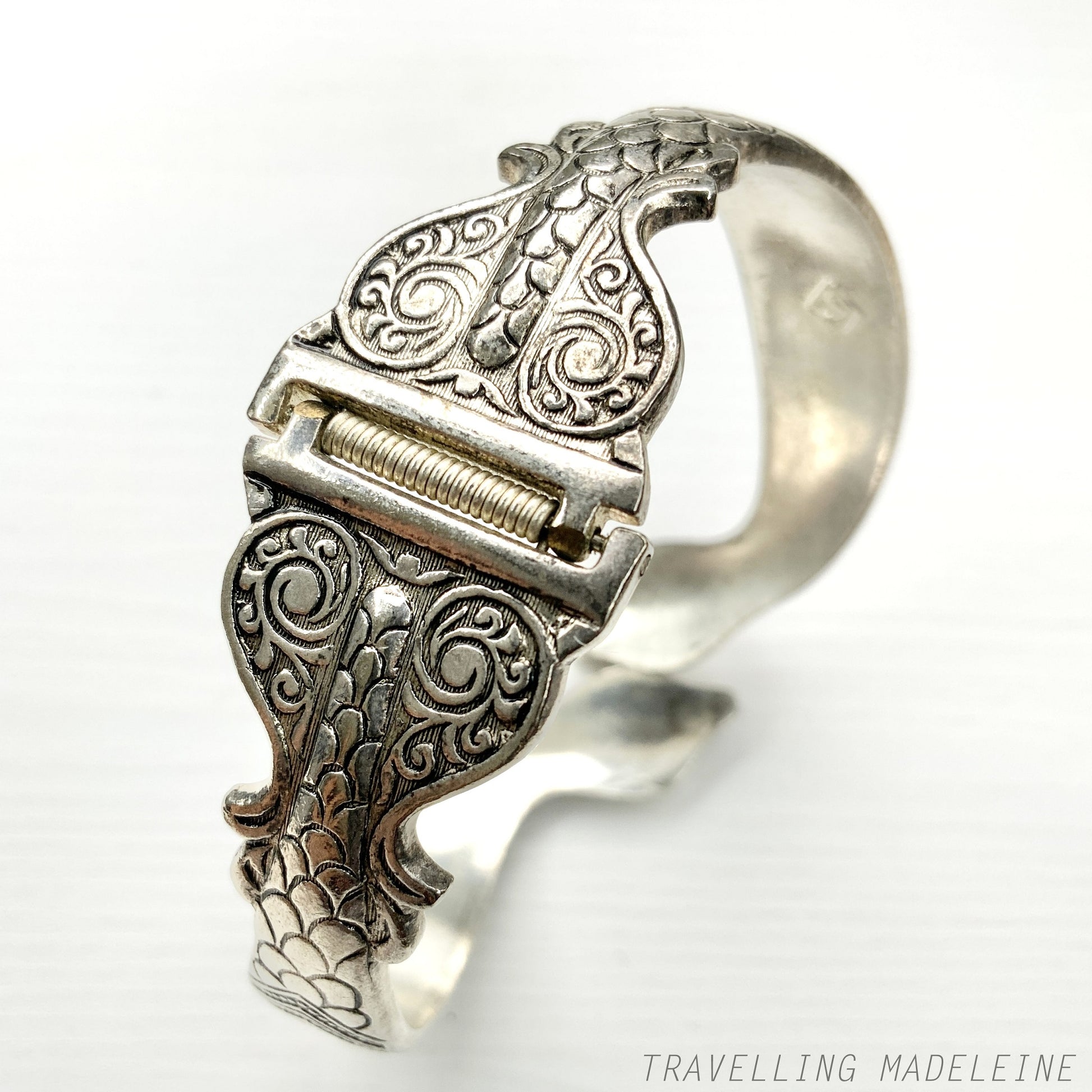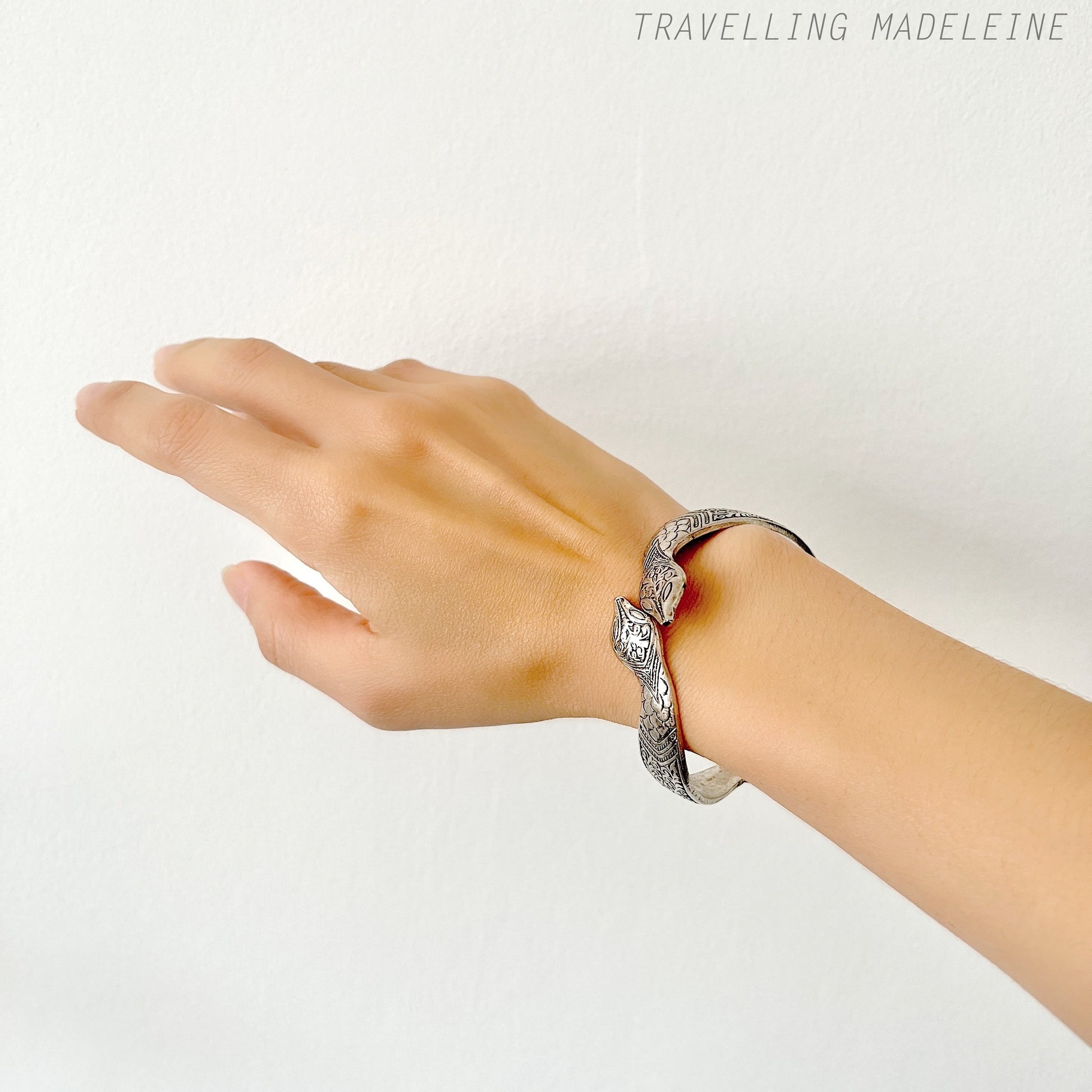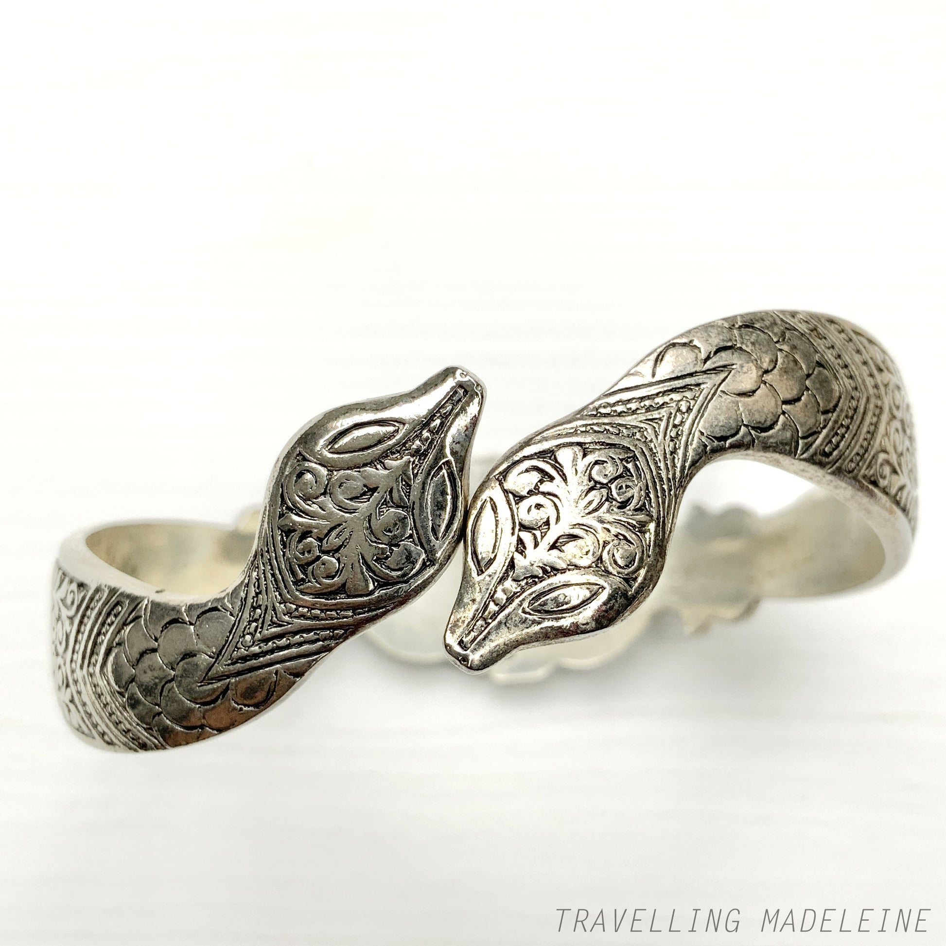 シルバーカラーメタルに美しいエングレイブが施された双頭の蛇のバングル。