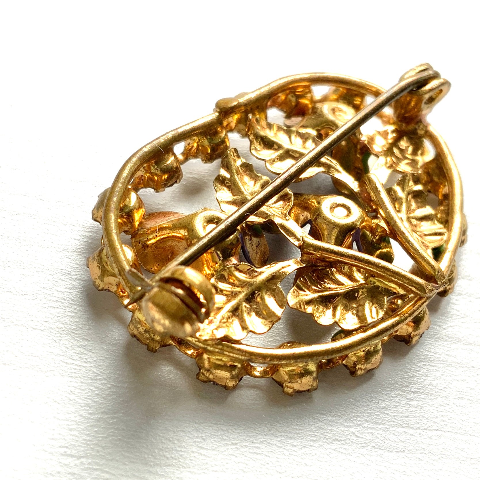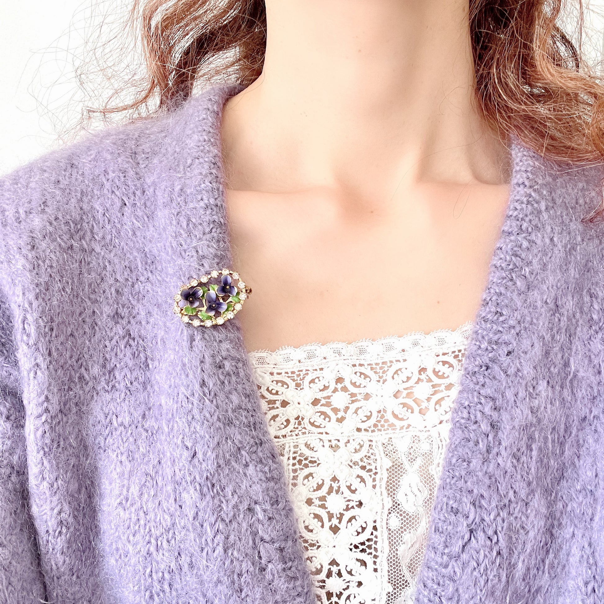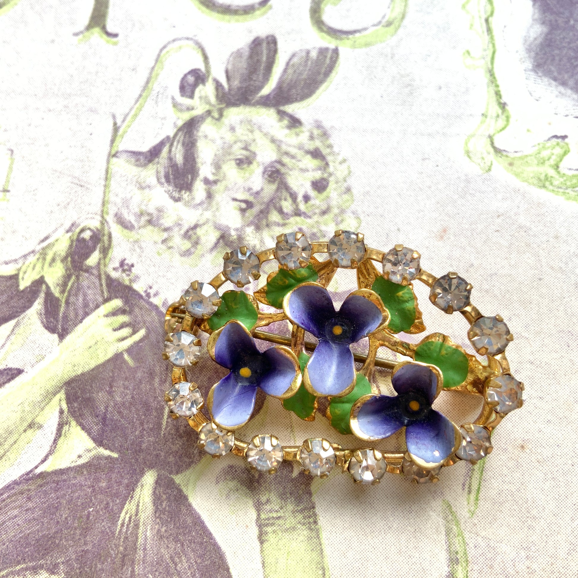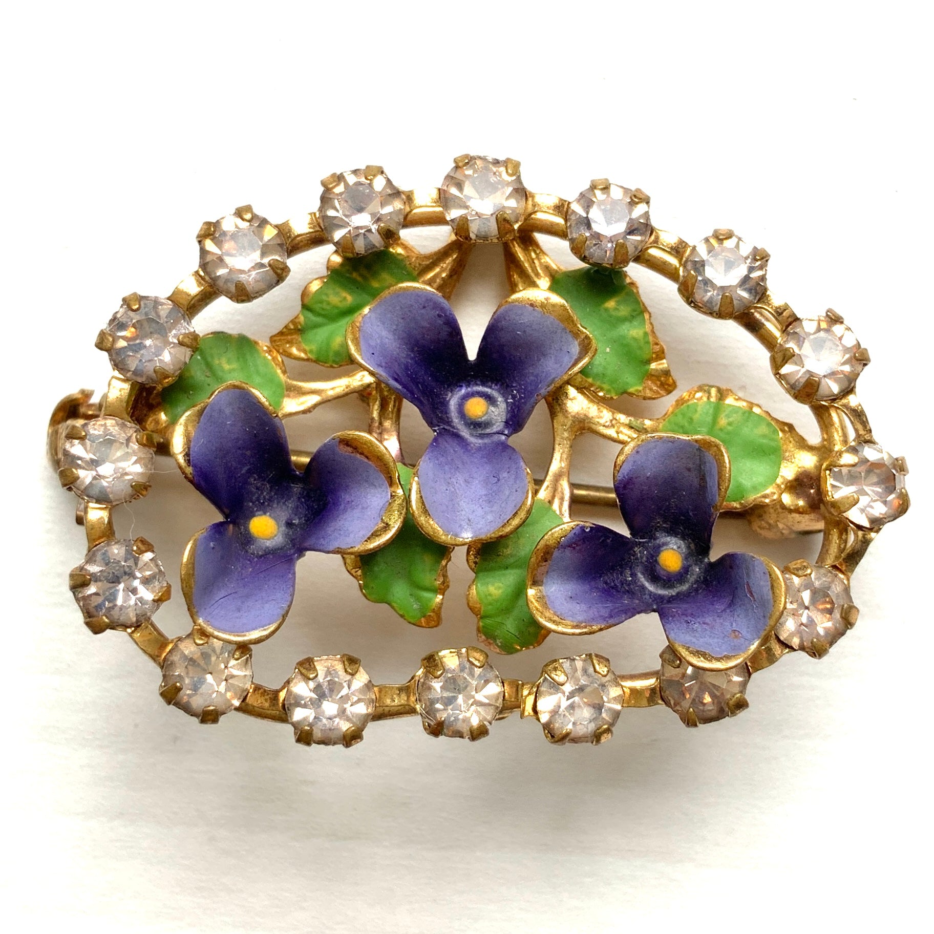 小さなエナメルのすみれをクリアラインストーンが囲んだブローチ。
