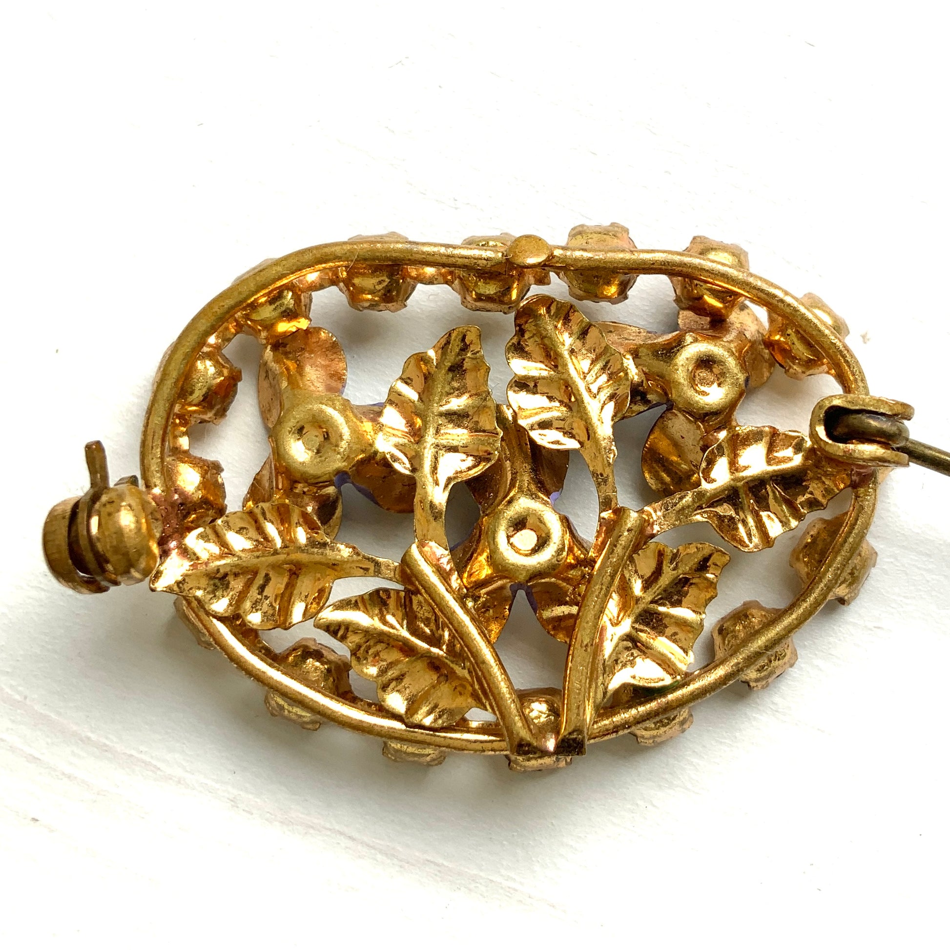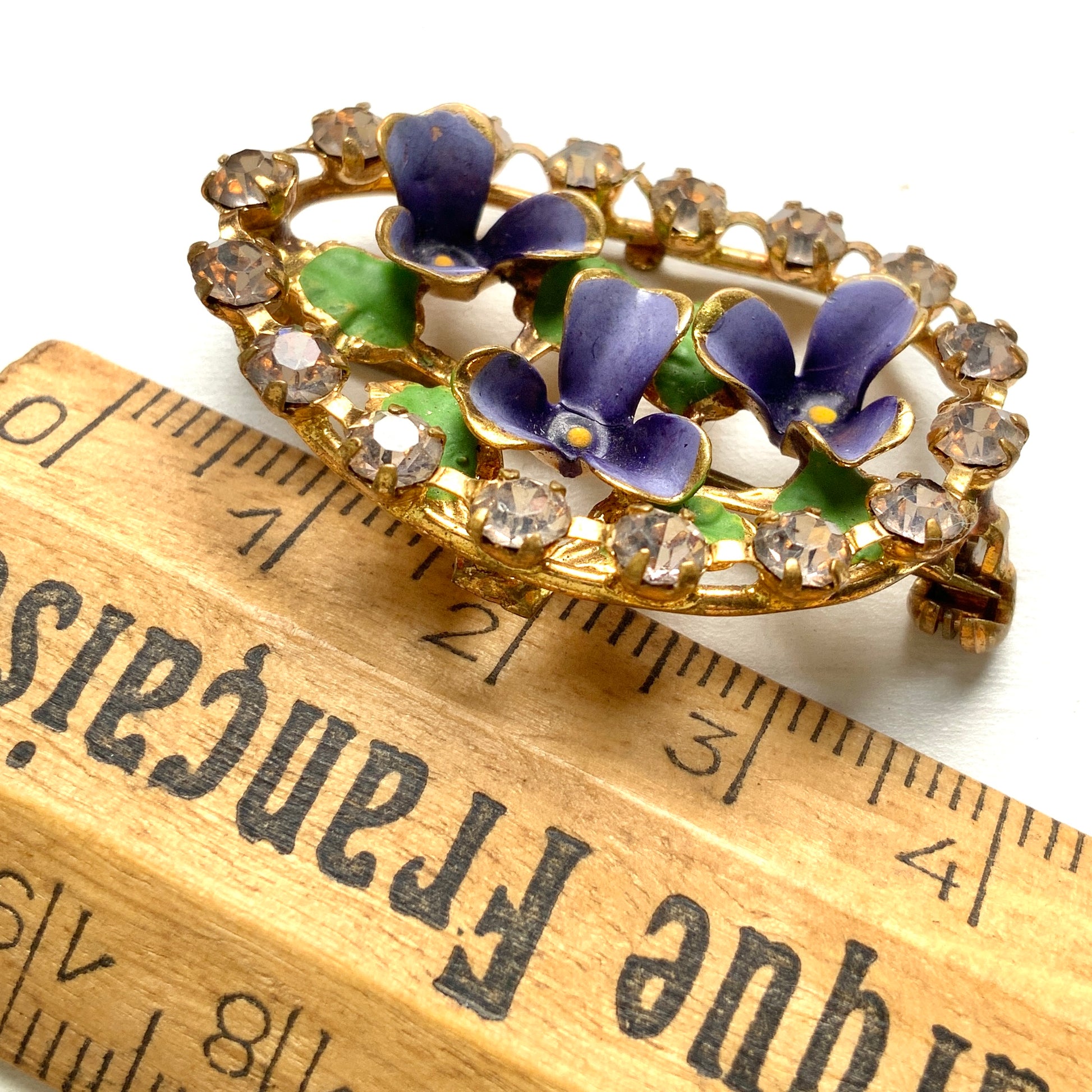 A brooch featuring small enamel violets surrounded by clear rhinestones.