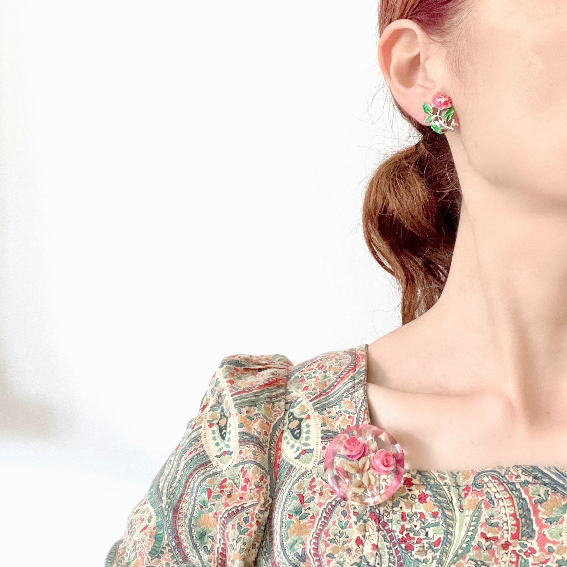 かわいらしいピンクのバラのエナメルのクリップイヤリング。