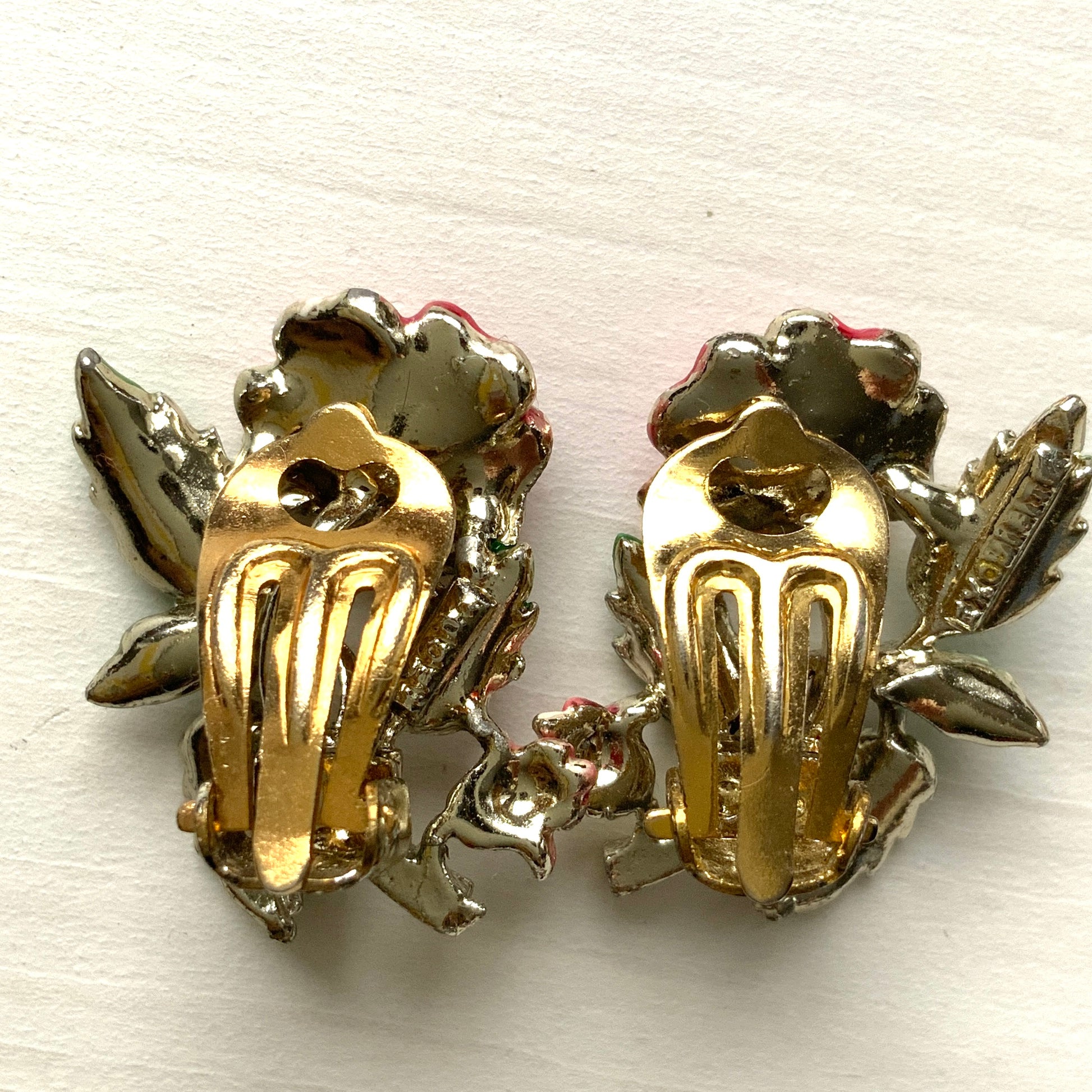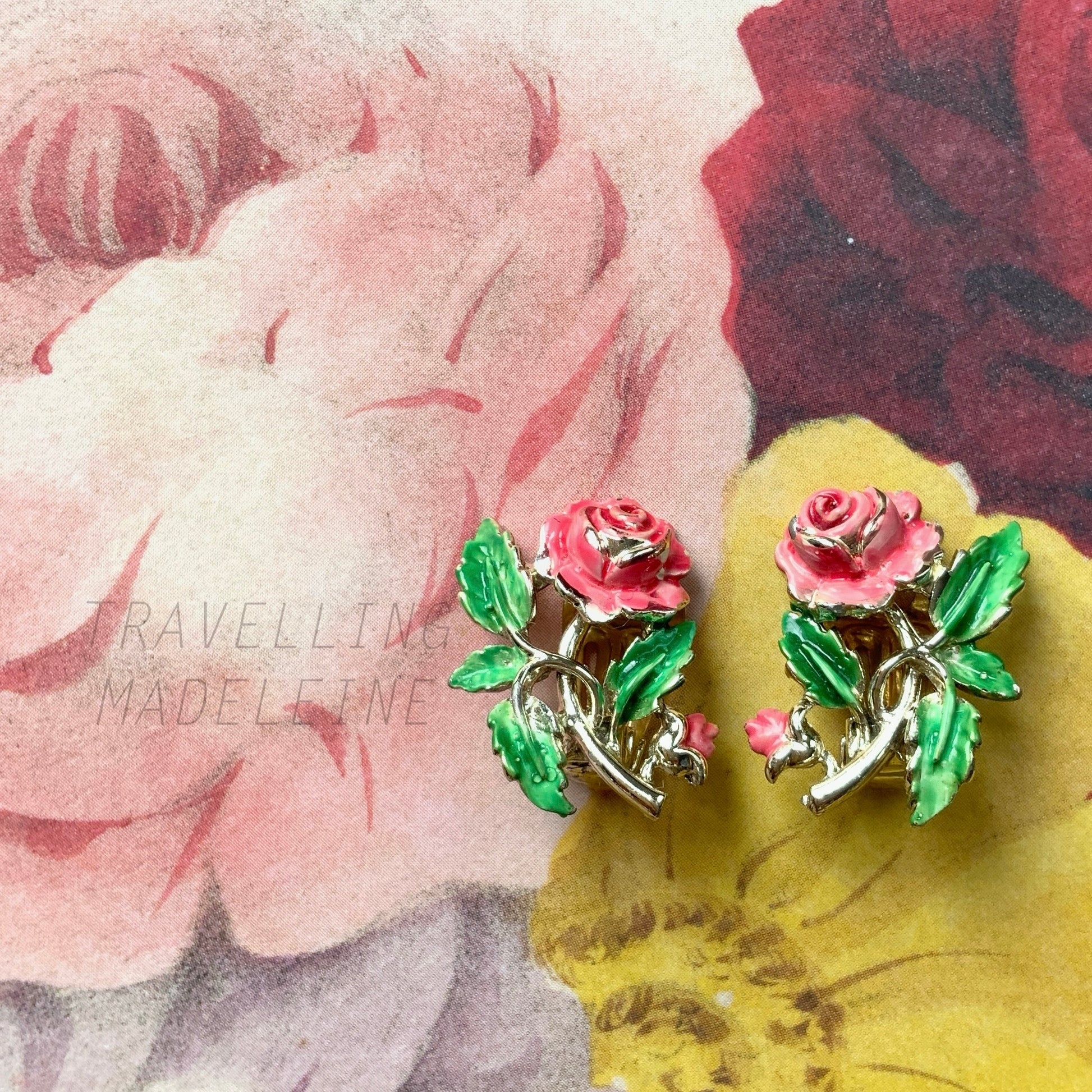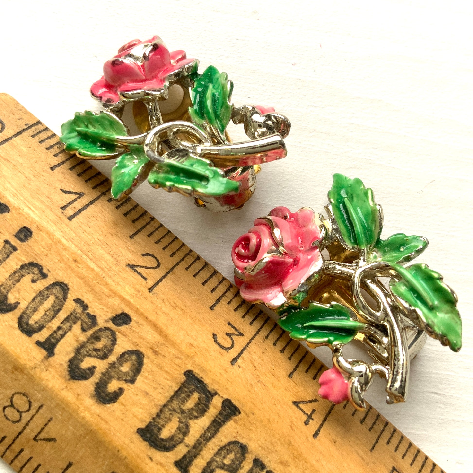 VINTAGE EXQUISITE 1950's Enamel Pink Rose Clip Earrings