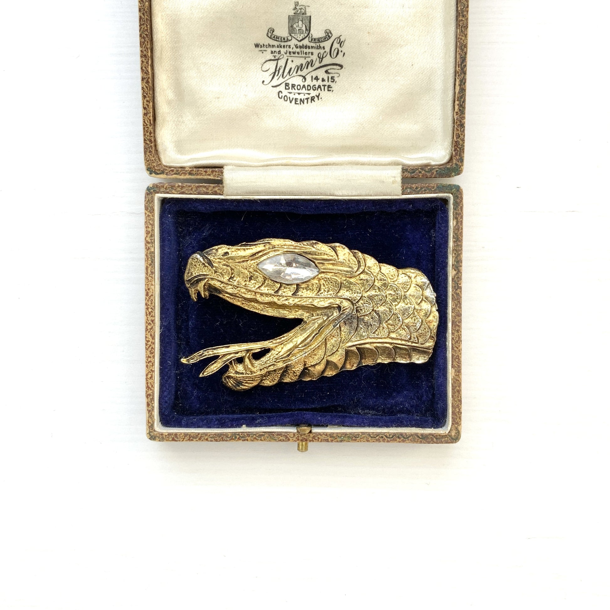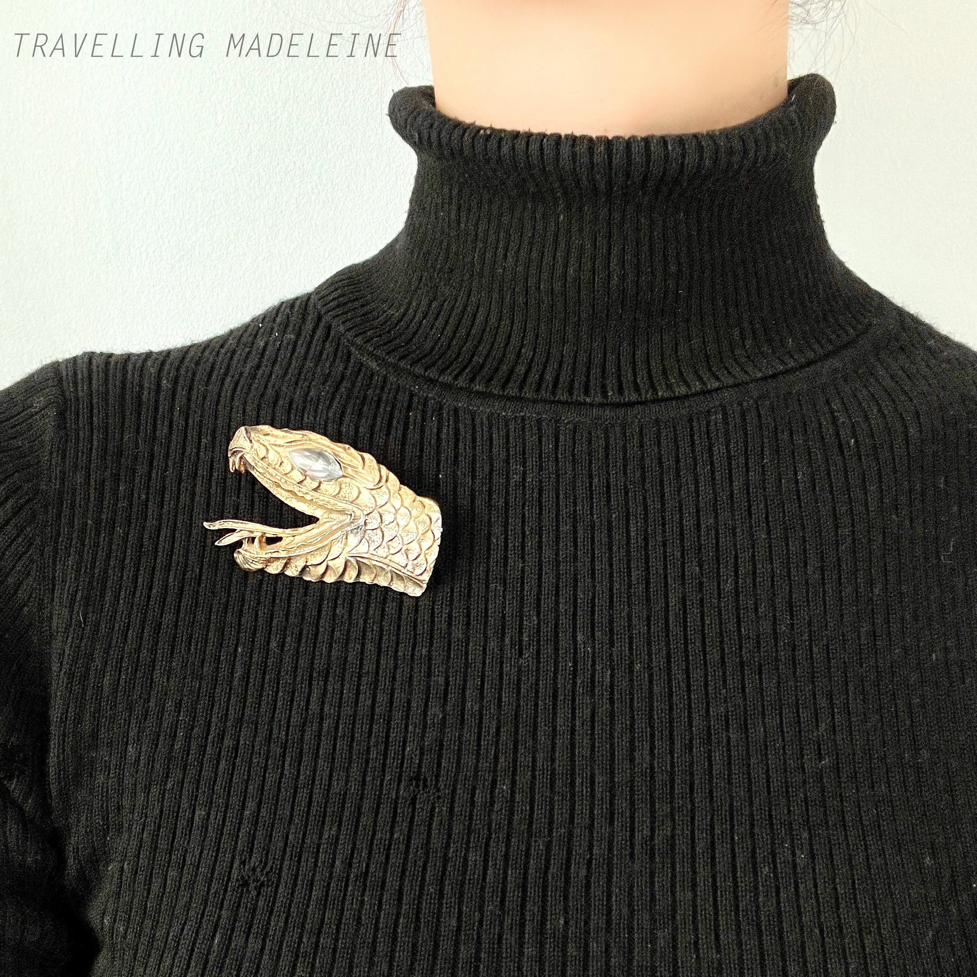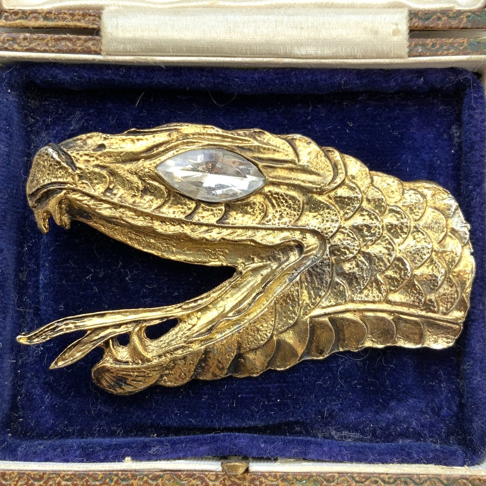 A large snake head brooch in gold-tone metal.