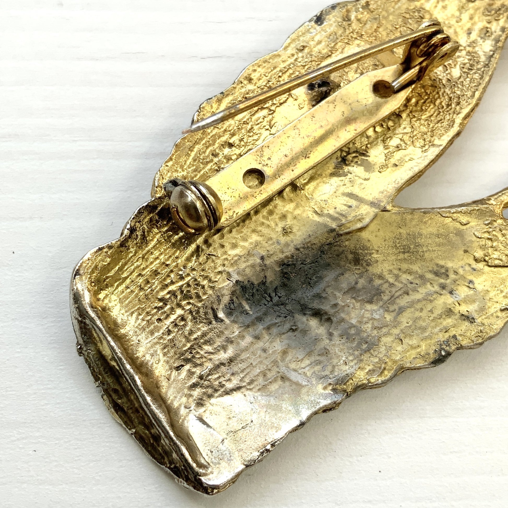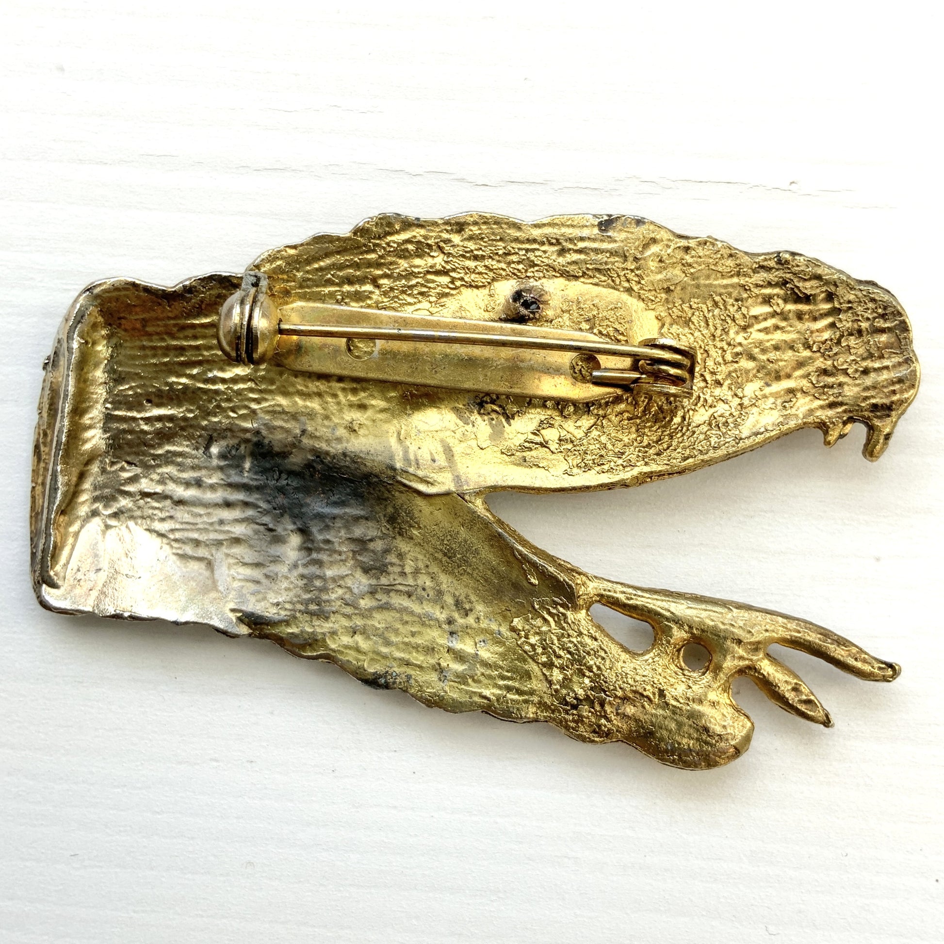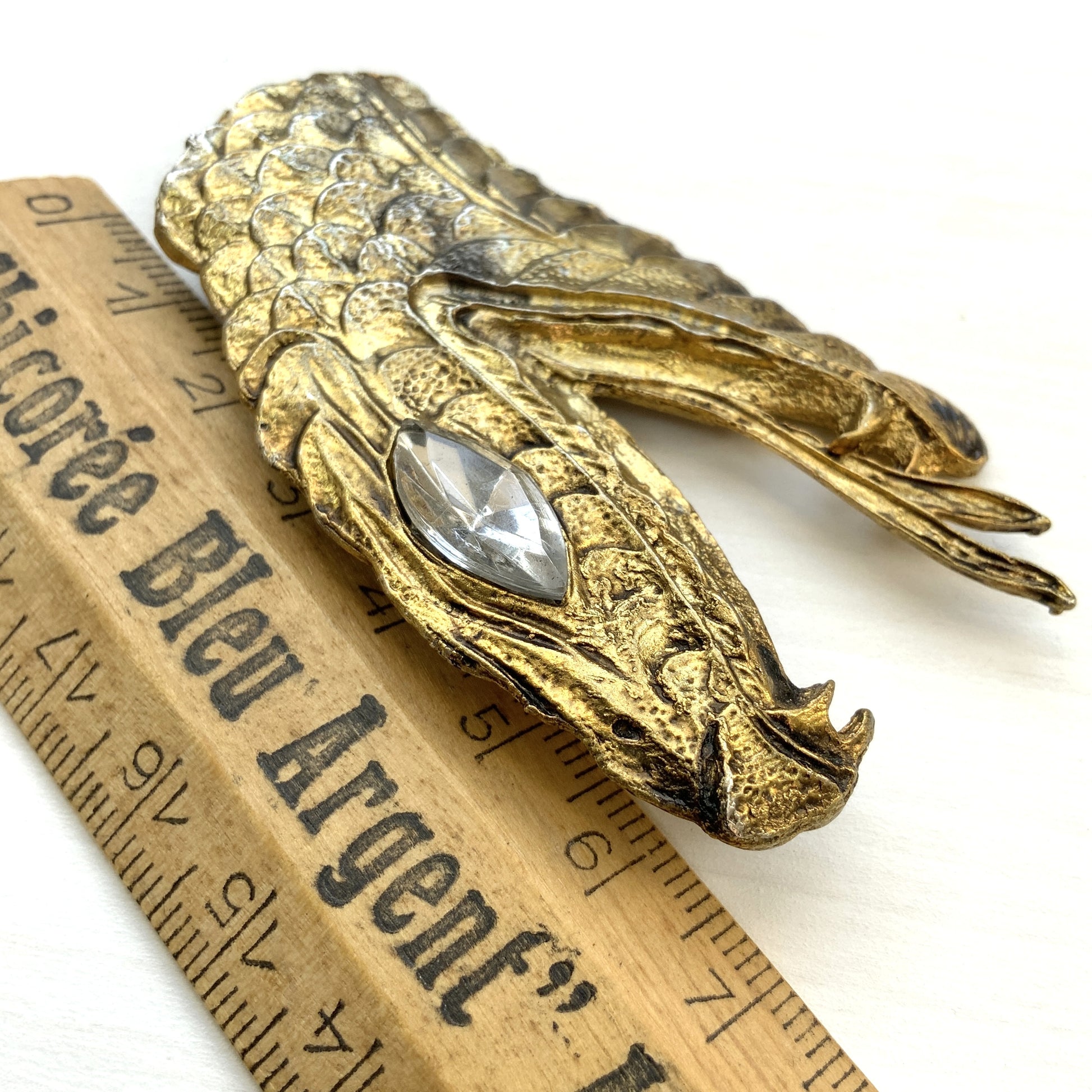 A large snake head brooch in gold-tone metal.