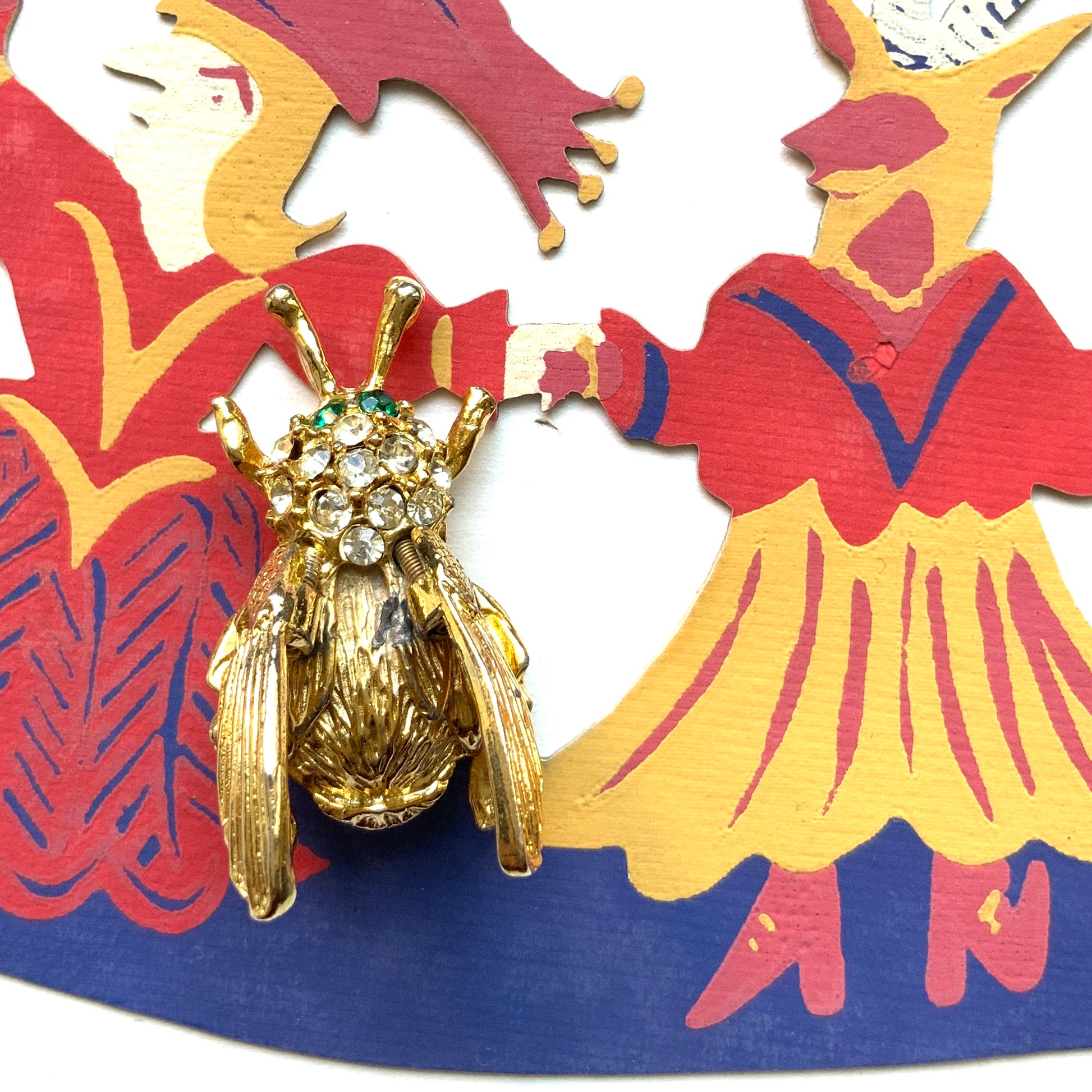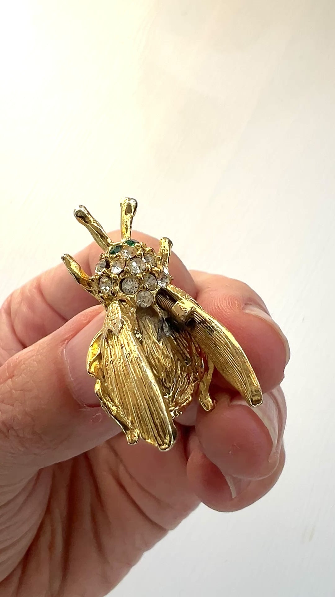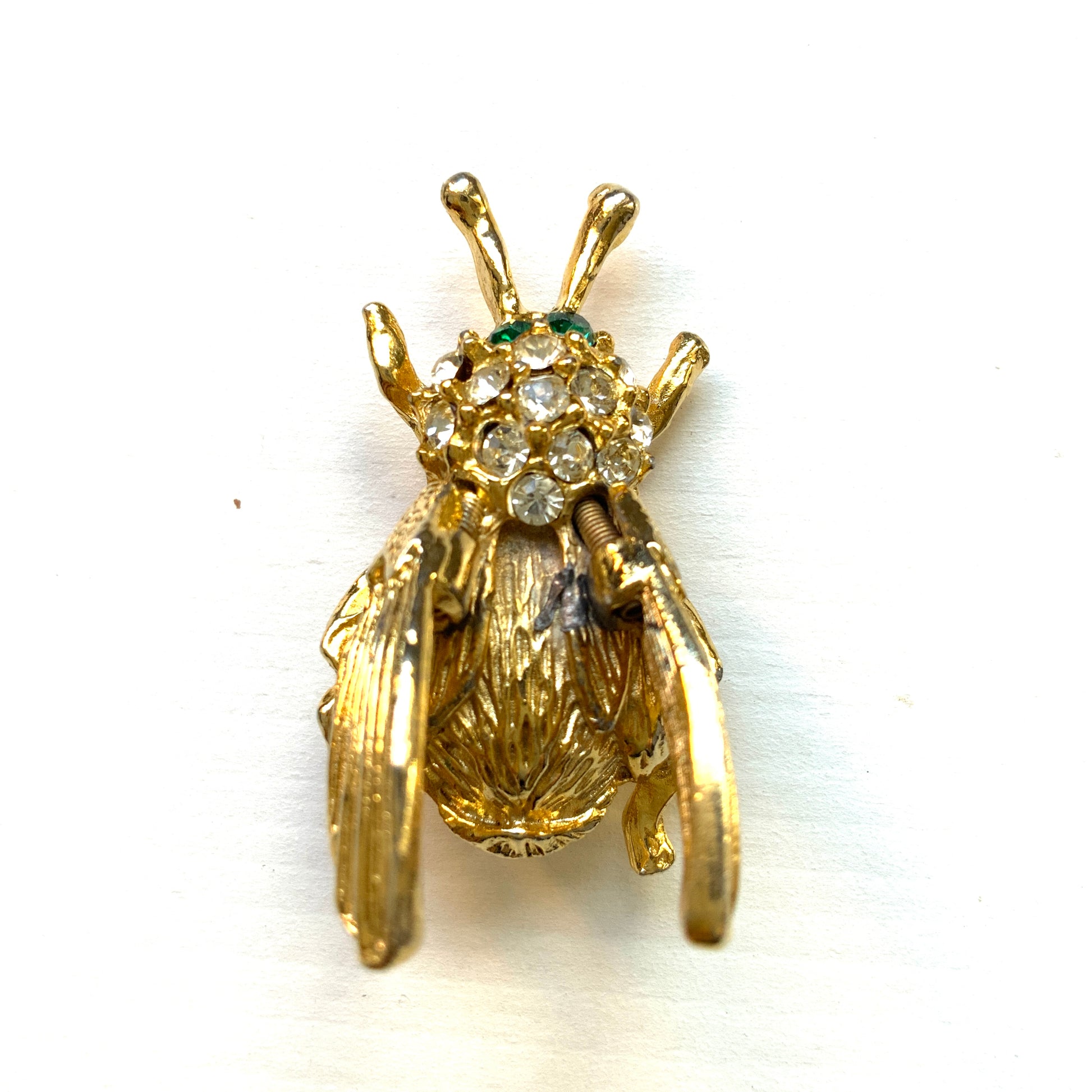 スプリングで羽が揺れる、ゴールドトーンとラインストーンの虫のブローチ。