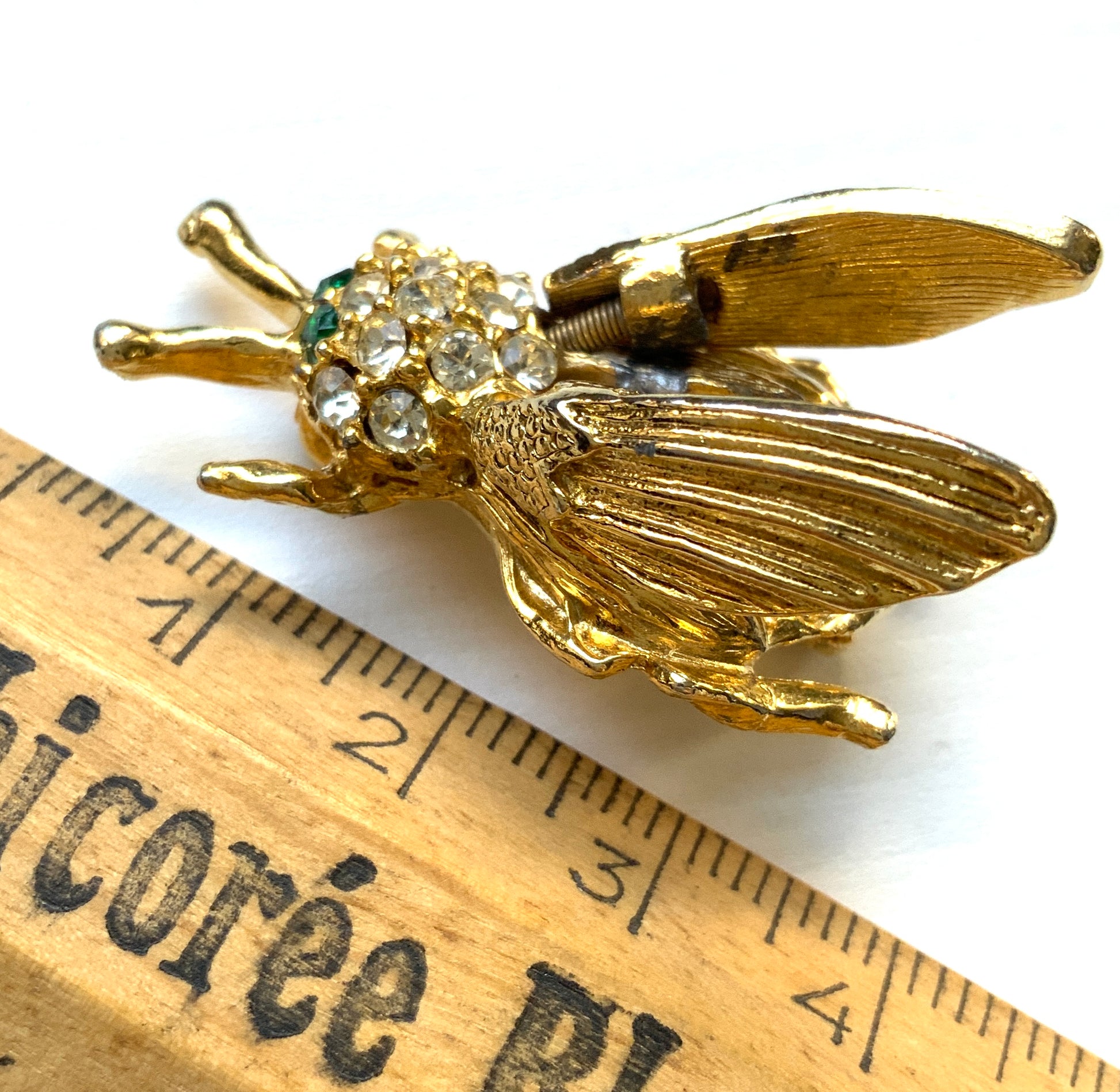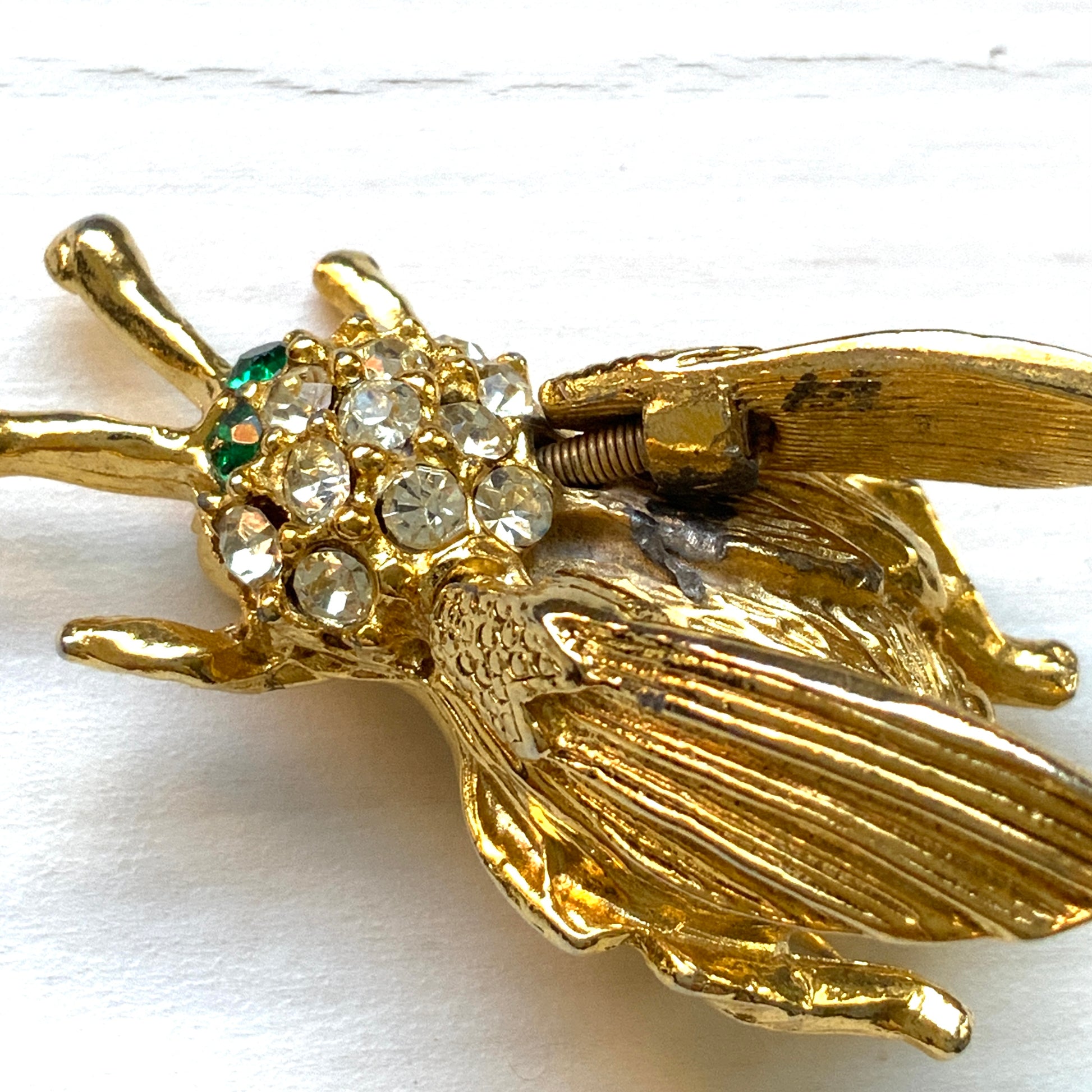 A gold-tone and rhinestone insect brooch with spring-loaded wings.
