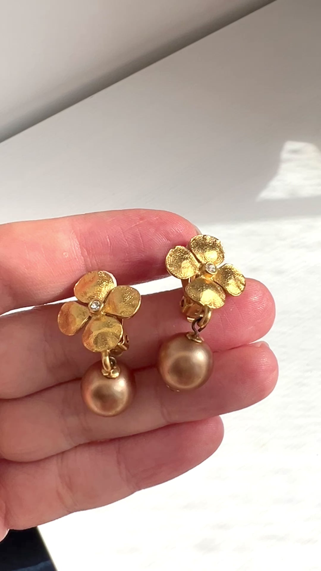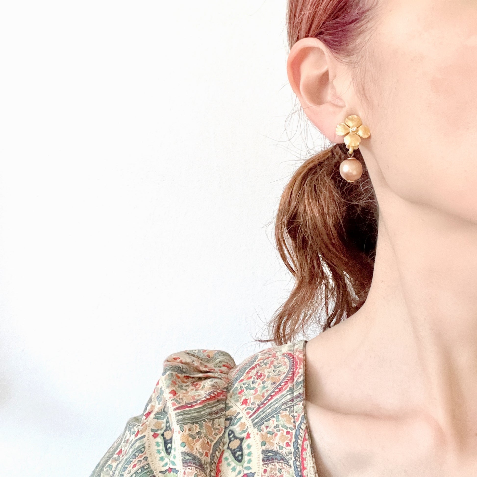 ゴールドトーンのかわいらしいハナミズキの花に、ブロンズパールが揺れるクリップイヤリング。