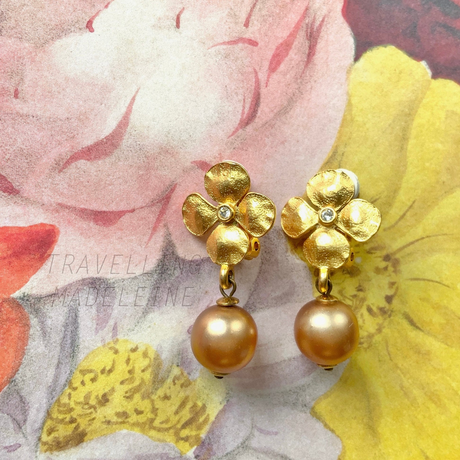 Clip earring with a cute dogwood flower in a gold-tone, with bronze faux pearls dangling. The gold-tone flower is textured with a matte finish, and a clear rhinestone shines at the center. The clip comes with silicone rubber pads pre-attached.