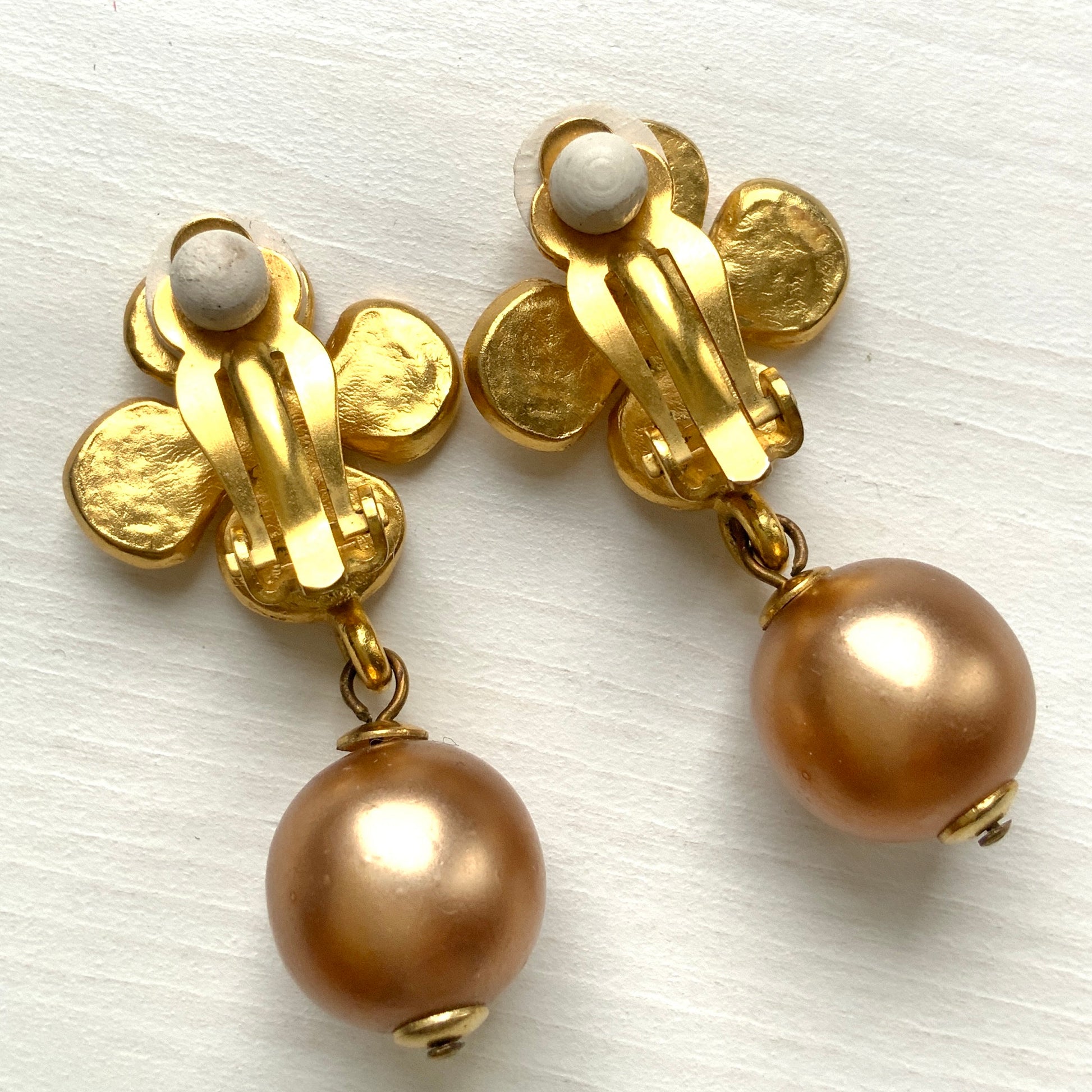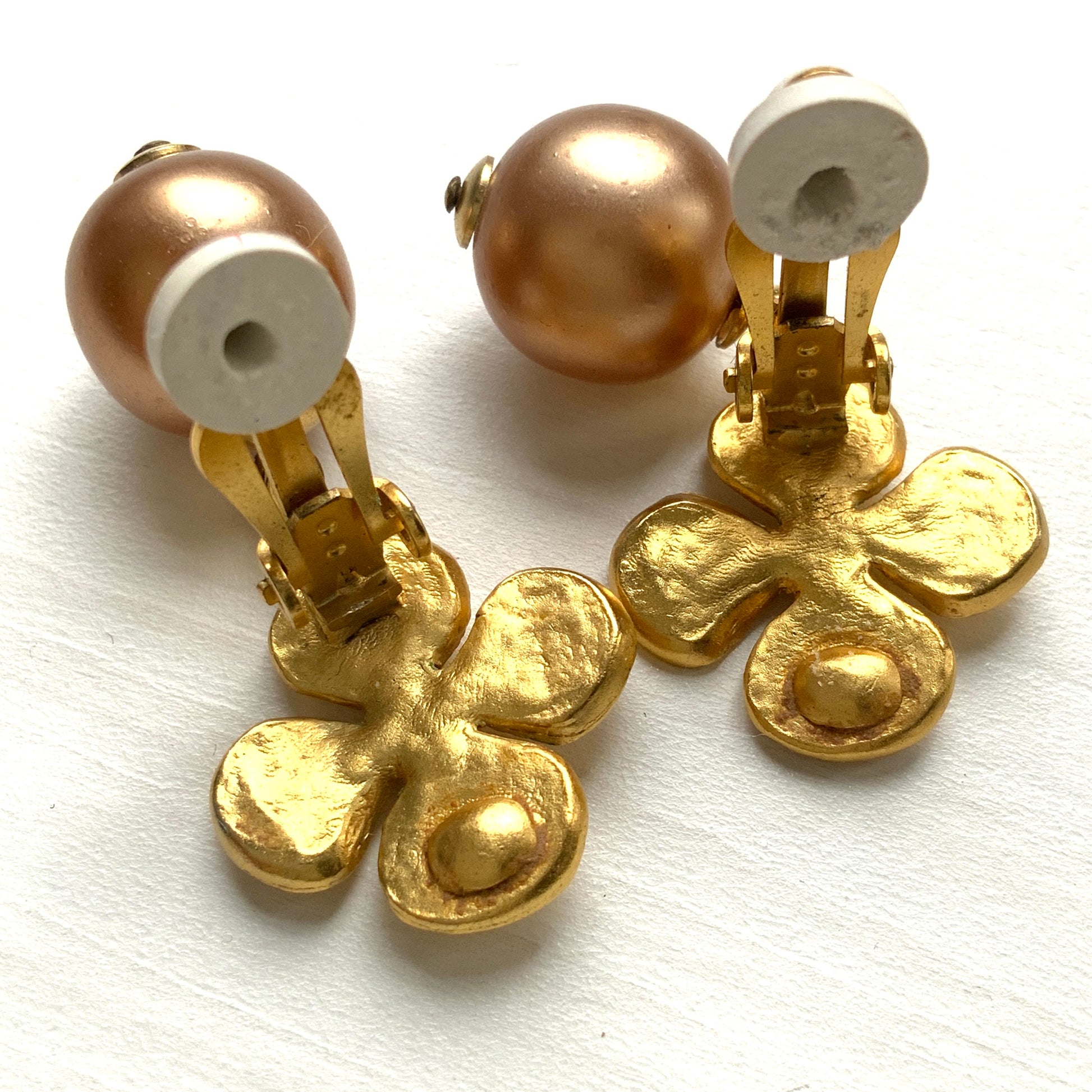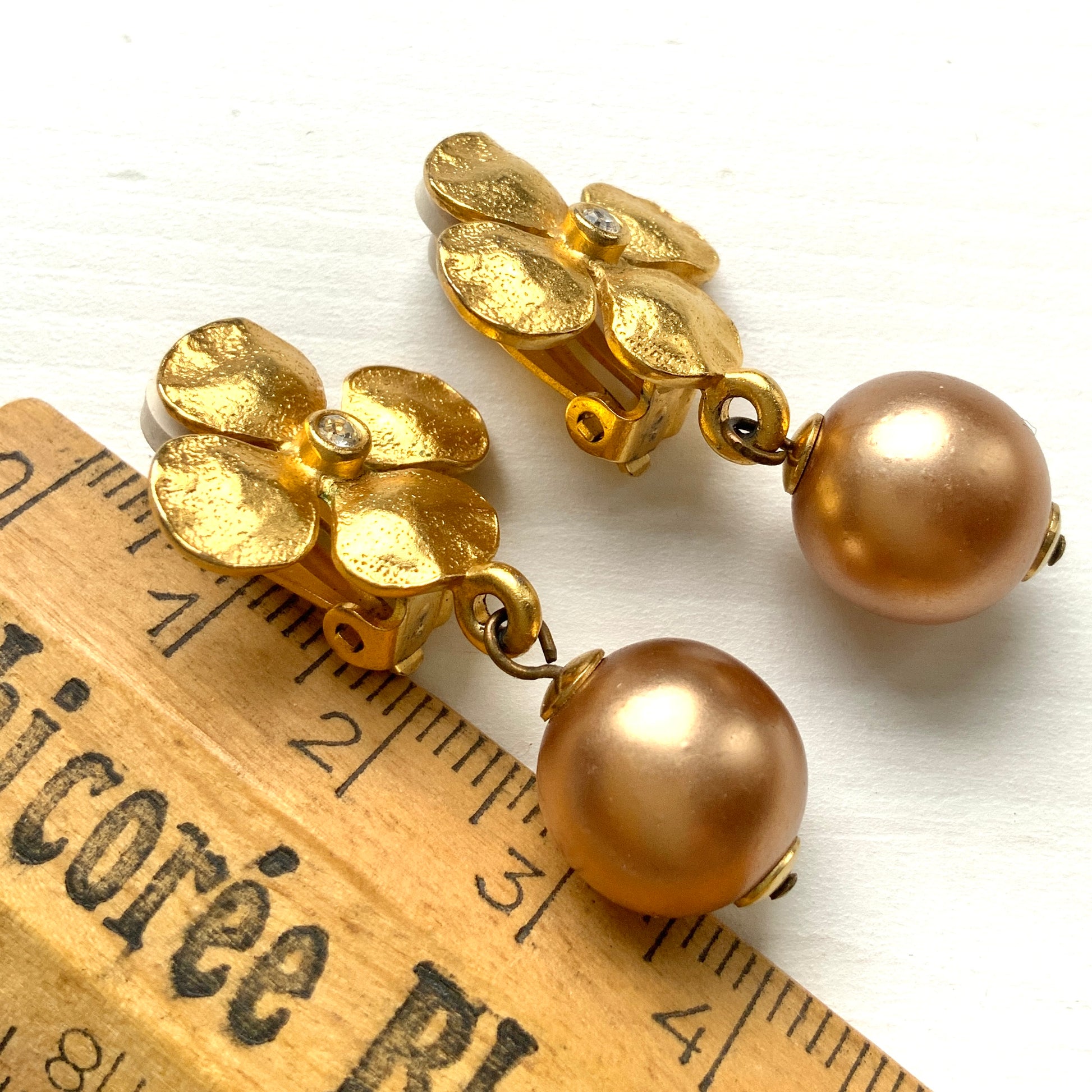 VINTAGE Gold Tone Dogwood Flower & Faux Bronze Pearl Dangle Clip Earrings