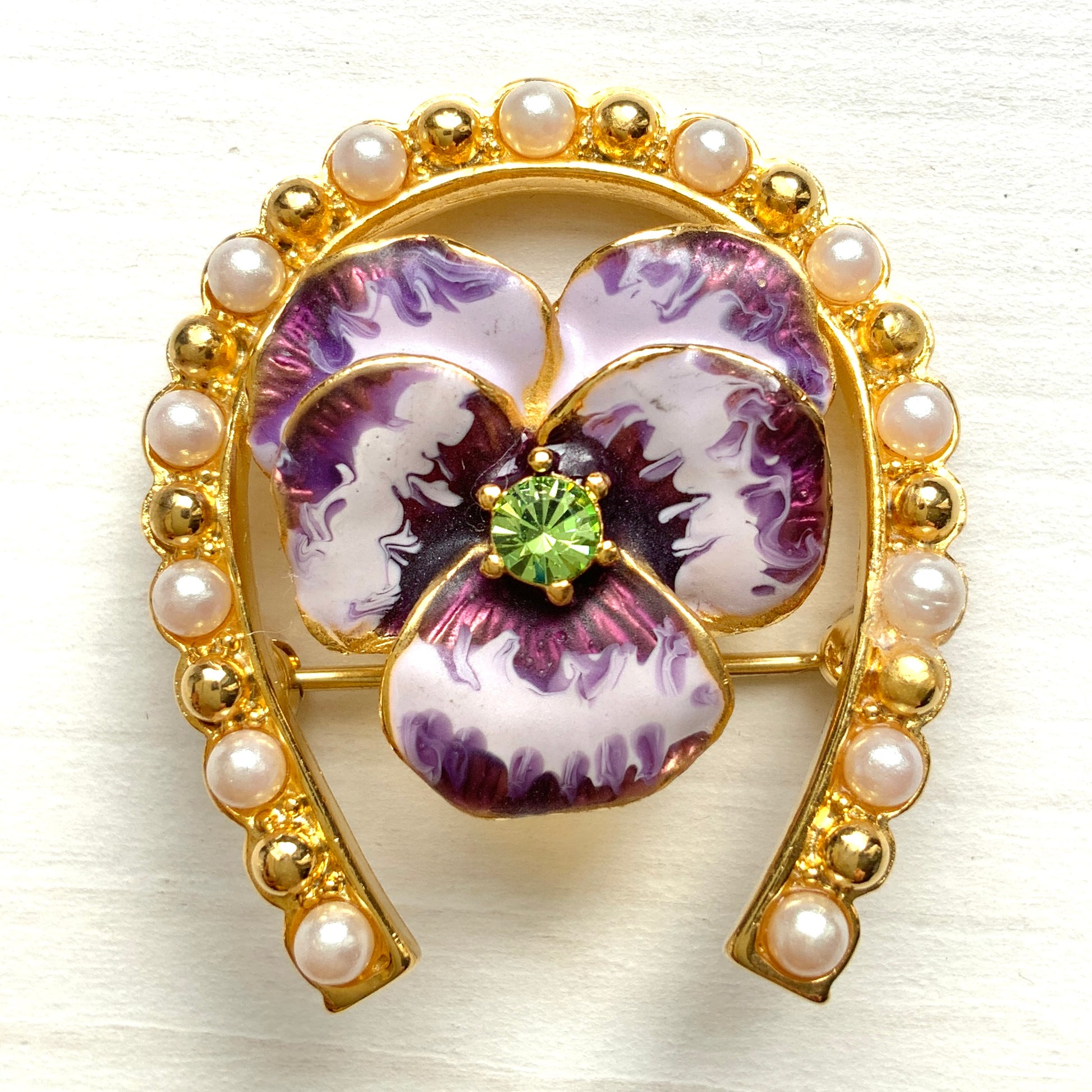 A beautiful enamel pansy brooch adorned with a lucky horseshoe motif.