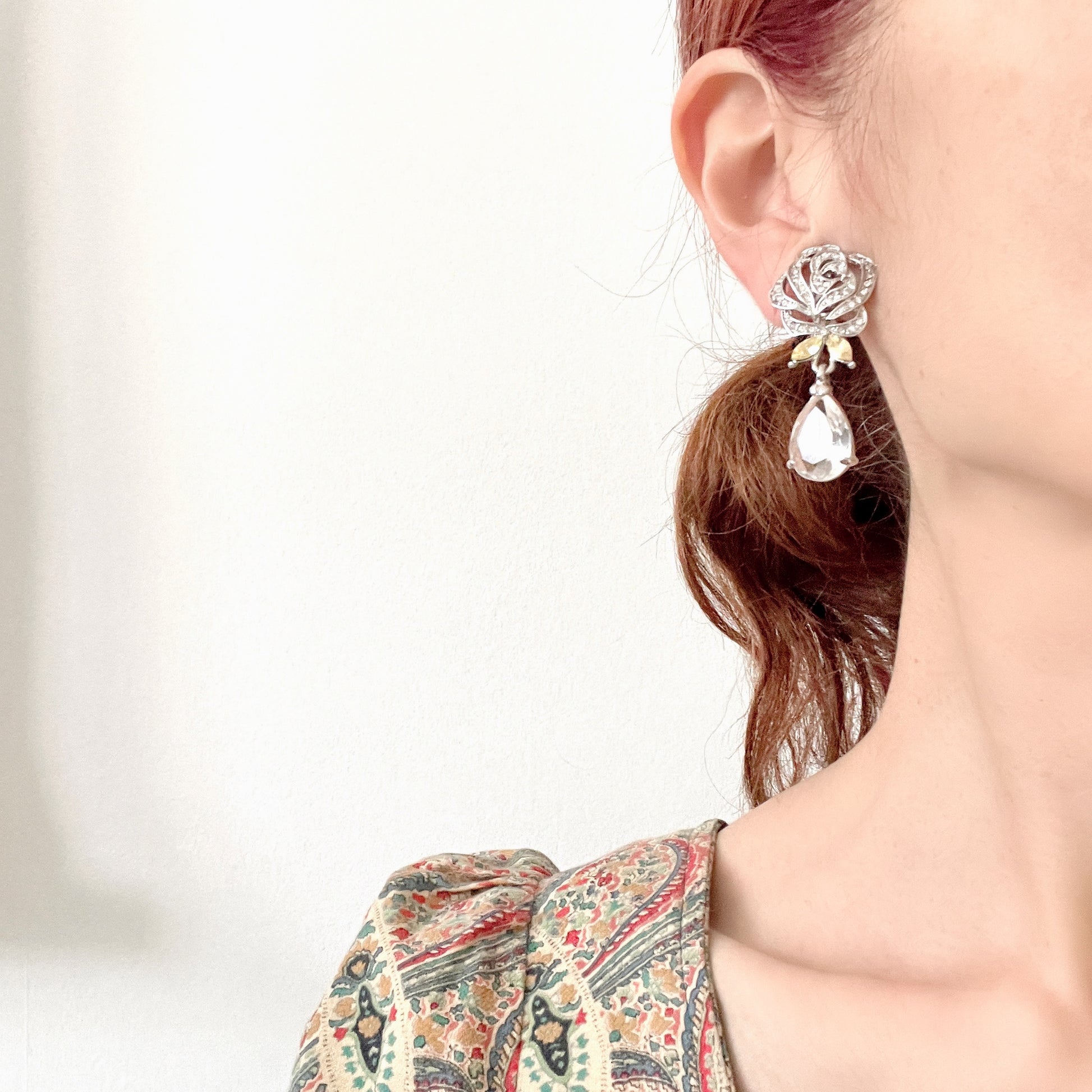 クリアラインストーンのバラに、クリアガラスのティアドロップが揺れるクリップイヤリング。