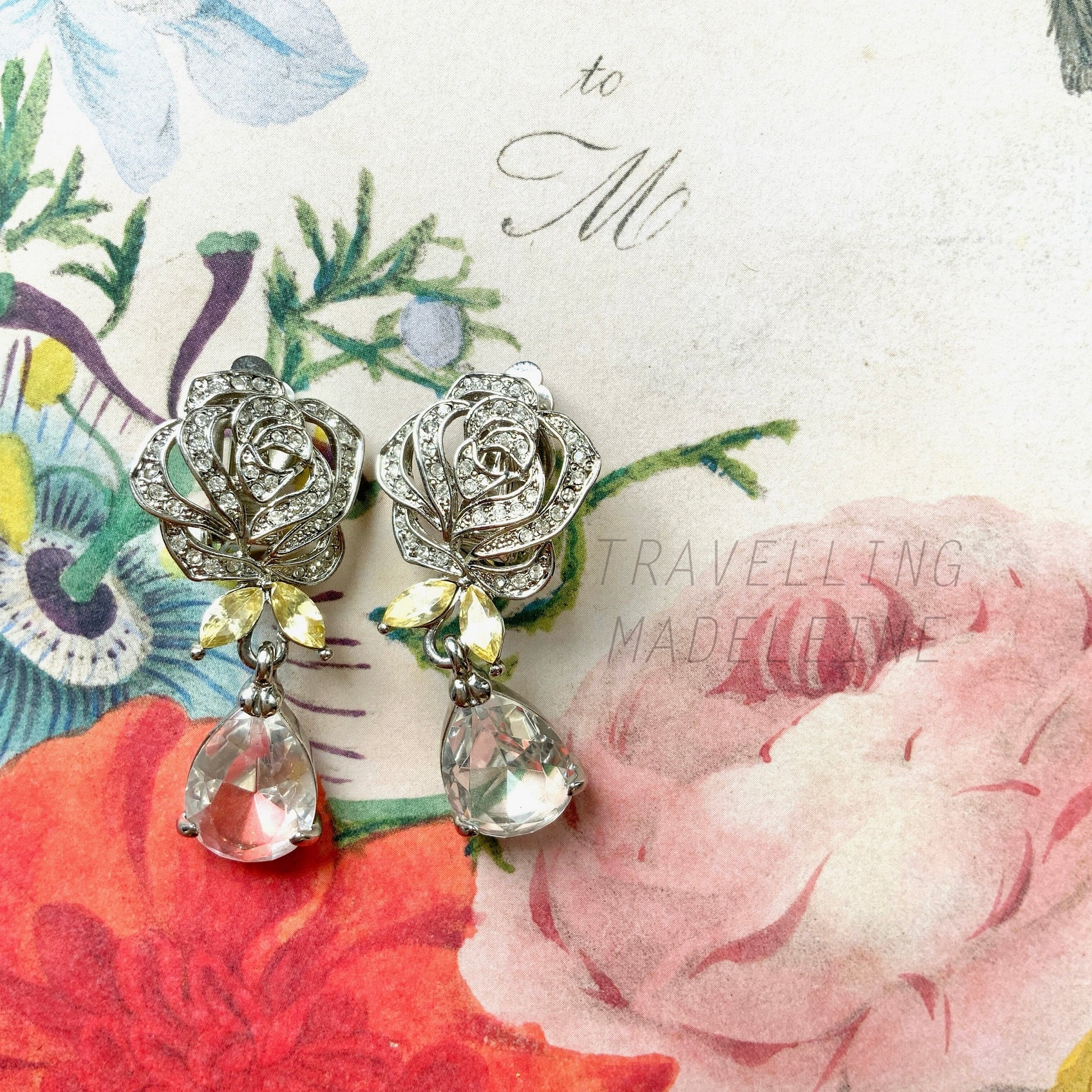 Clip earrings with clear rhinestone roses and clear glass teardrops.