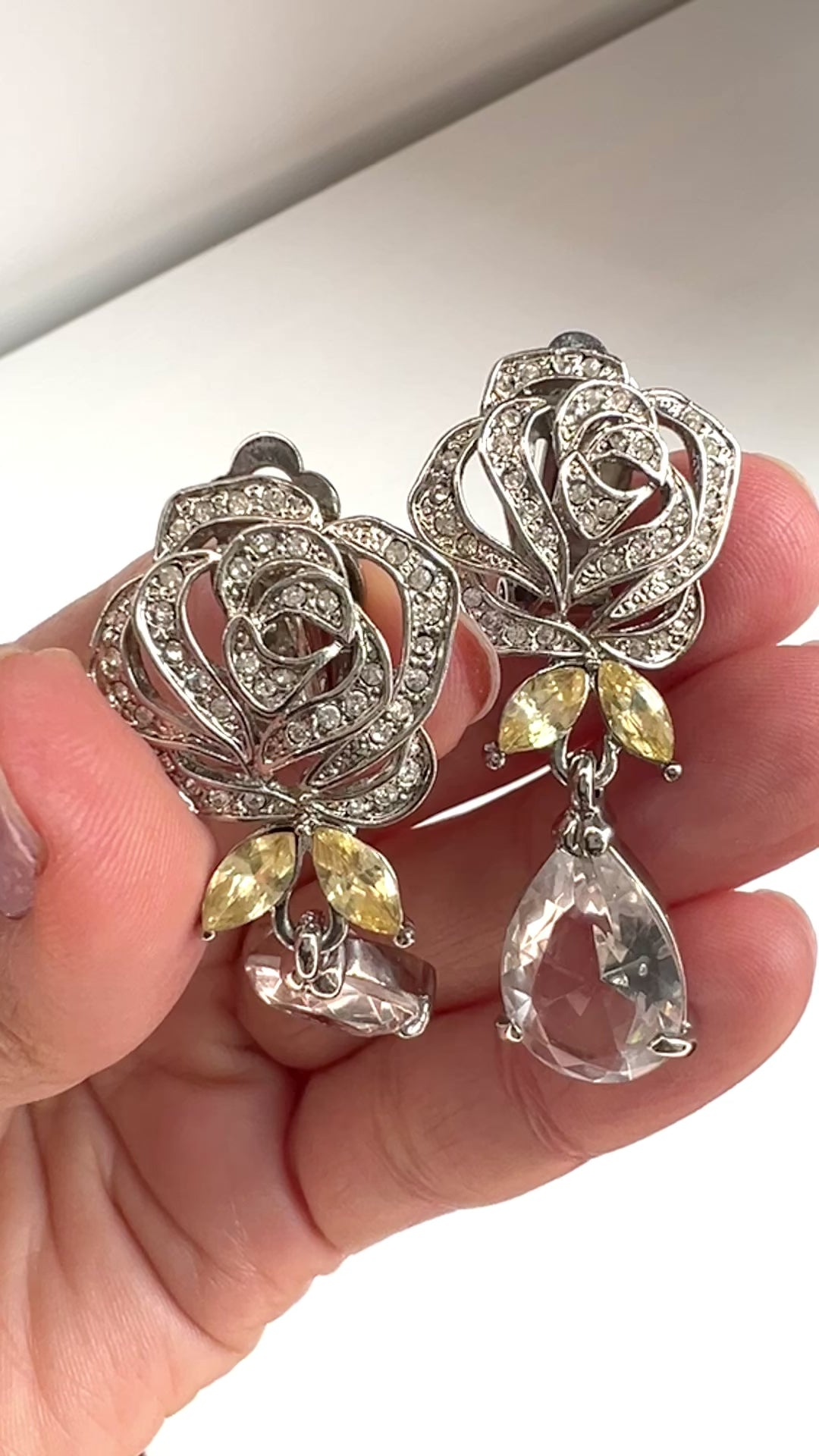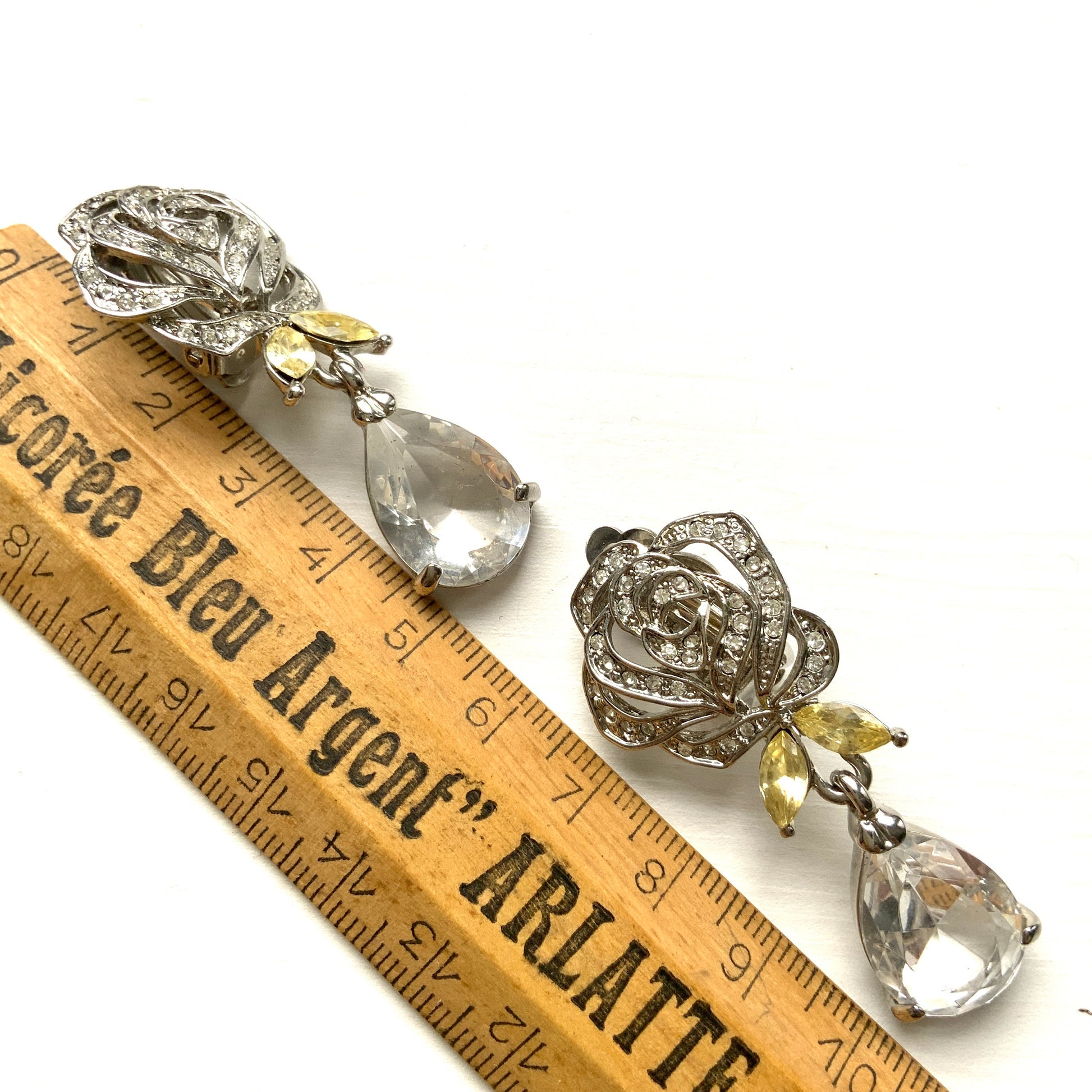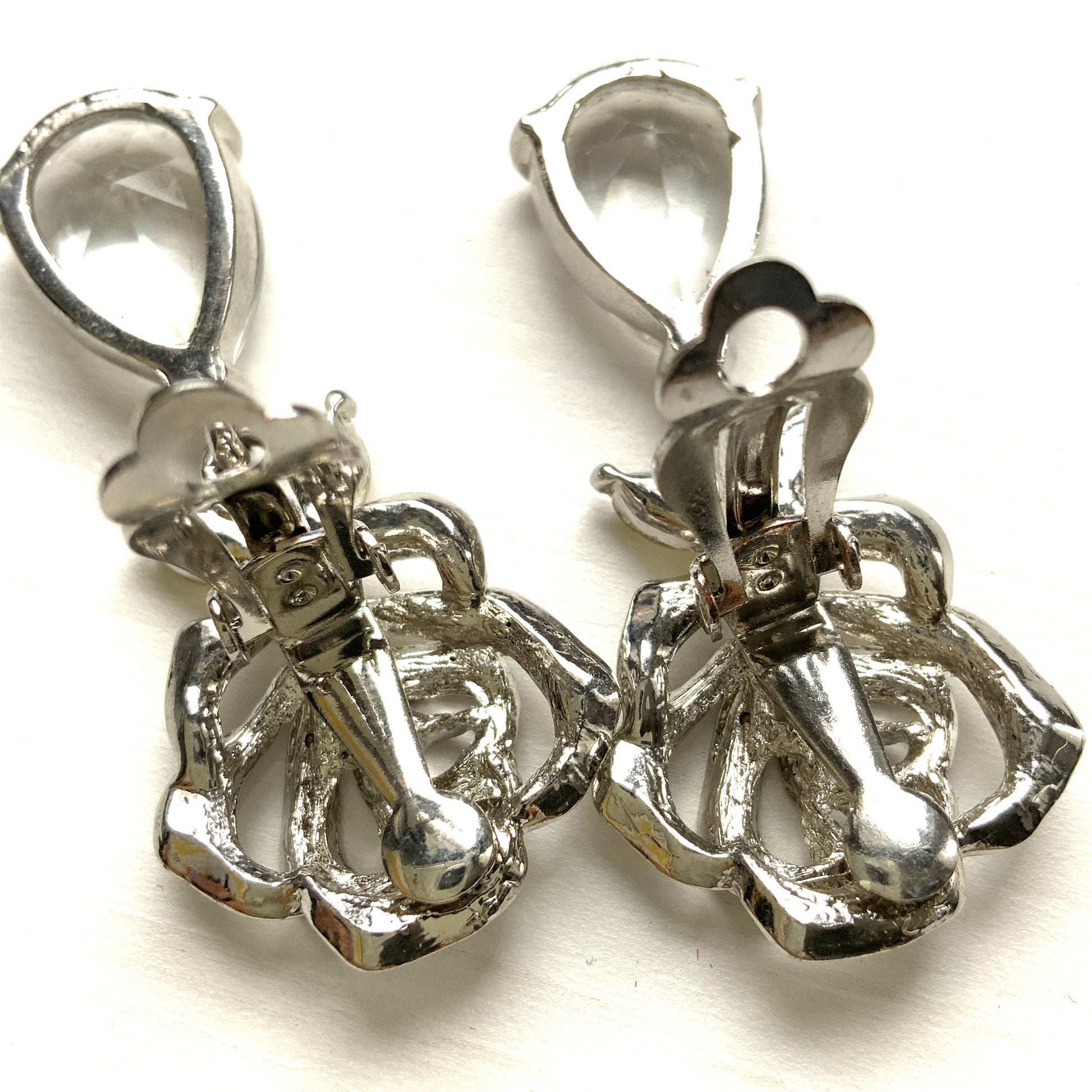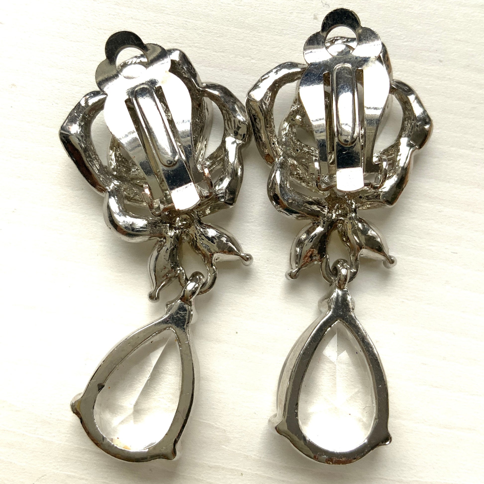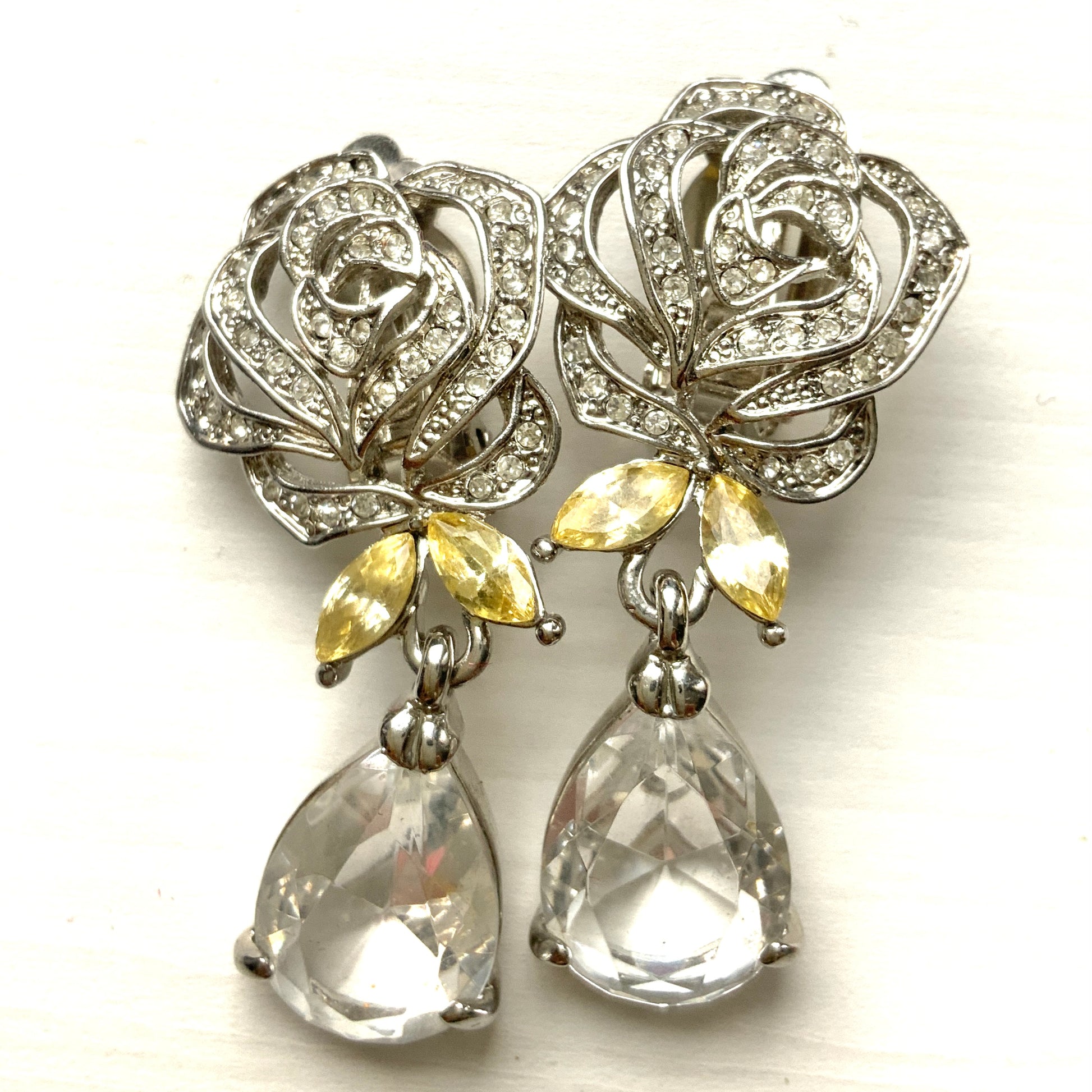 VINTAGE Rhinestone Rose & Clear Teardrop Dangle Clip Earrings