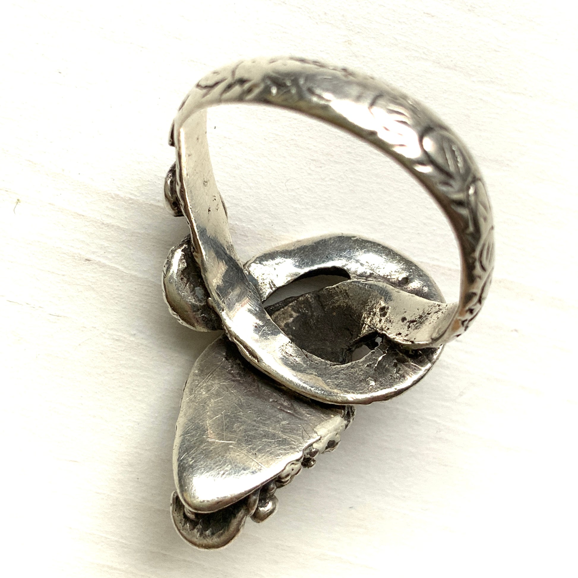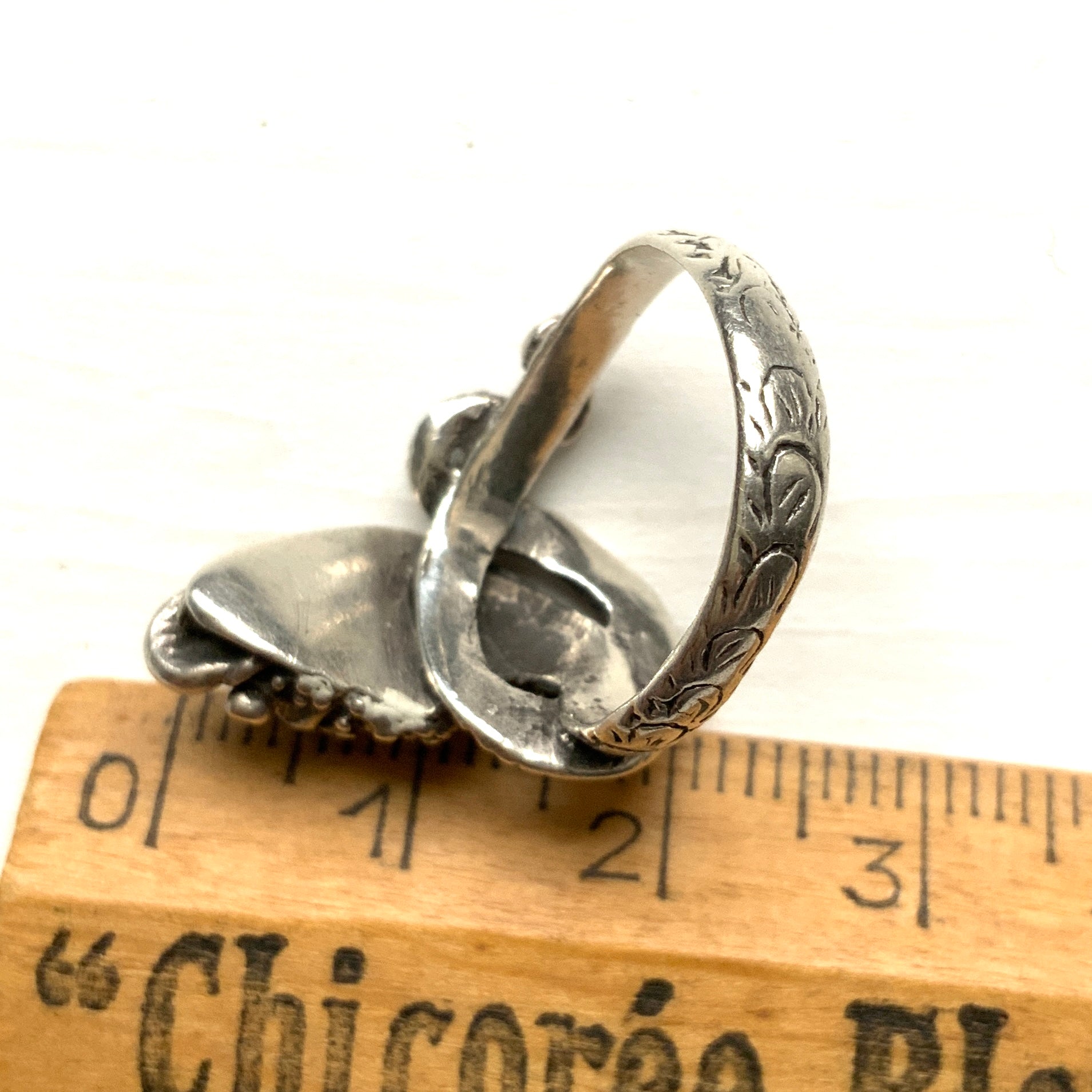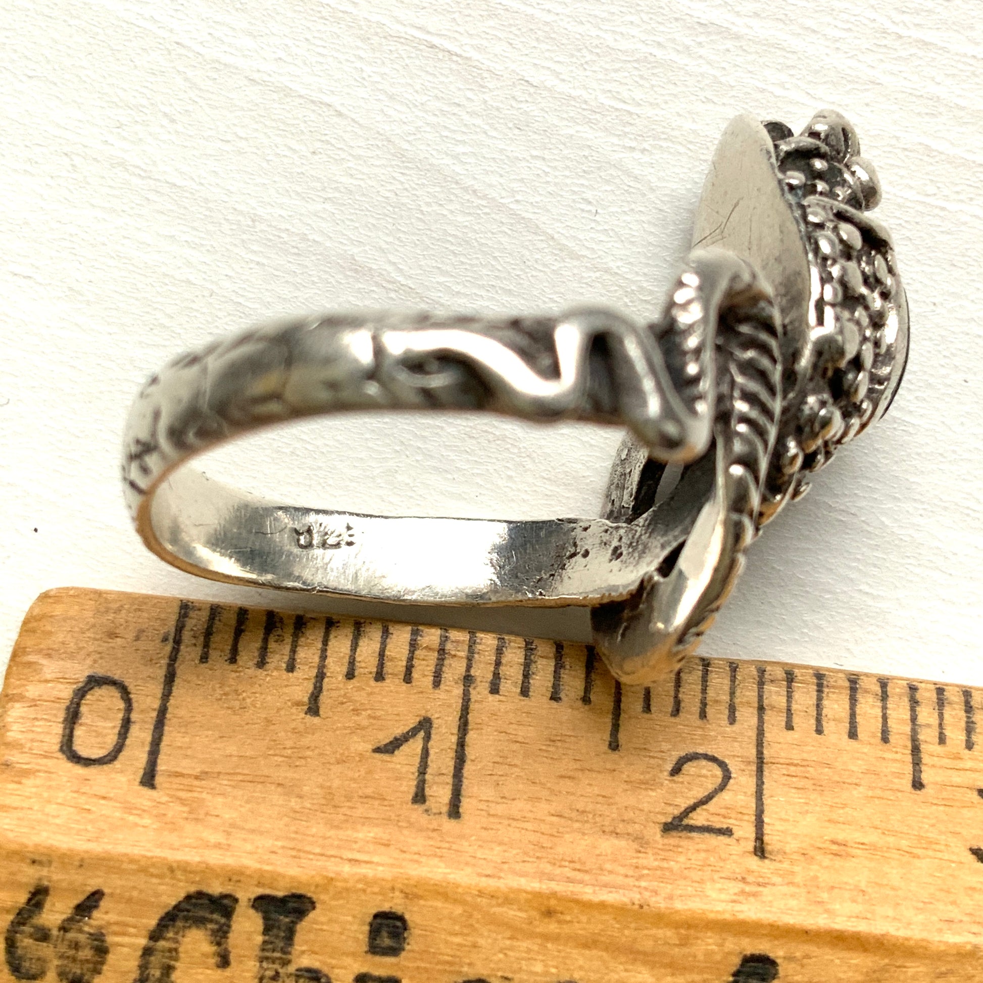 オニキスの周りのぶつぶつや、リング自体にも模様が彫られていて凝ったデザインです。