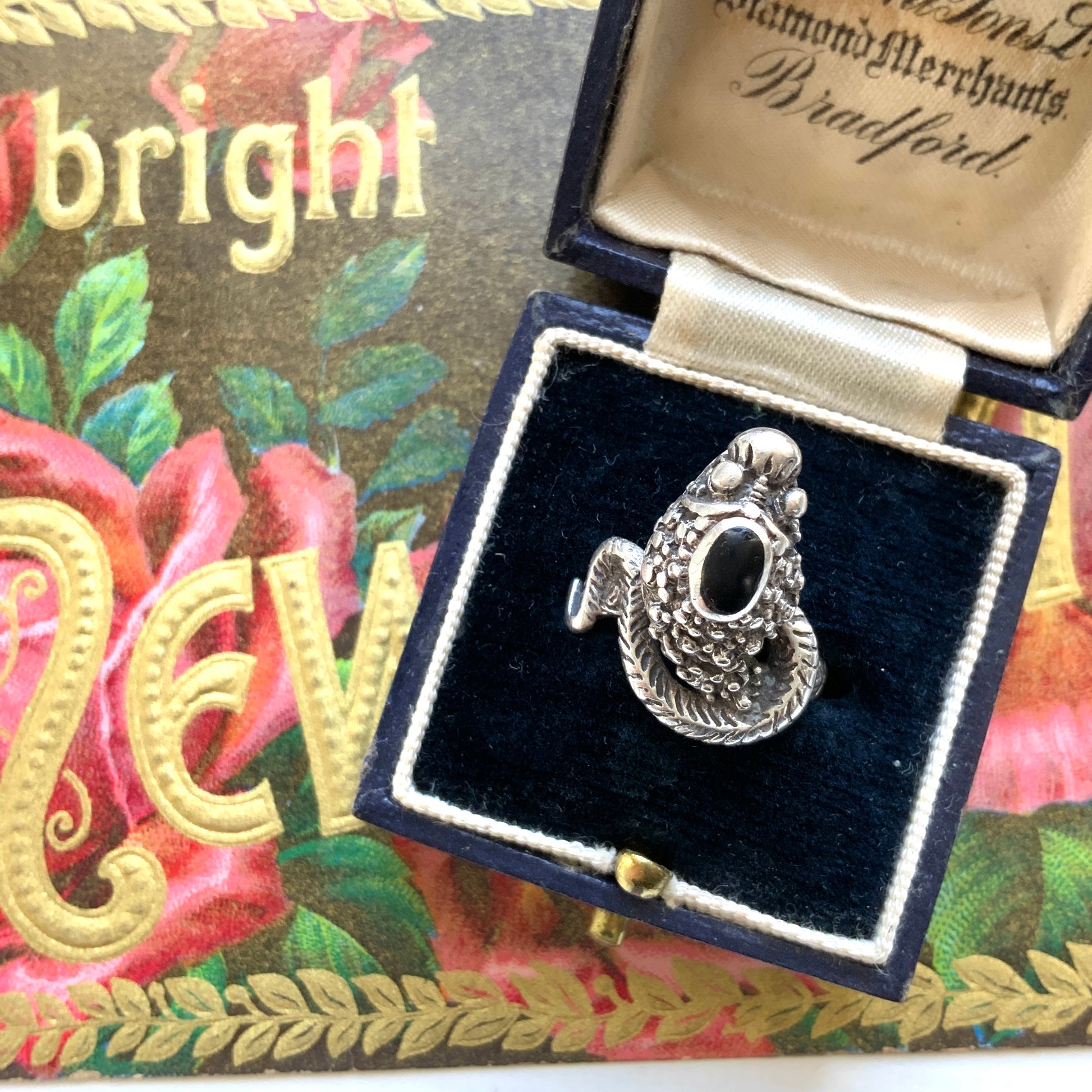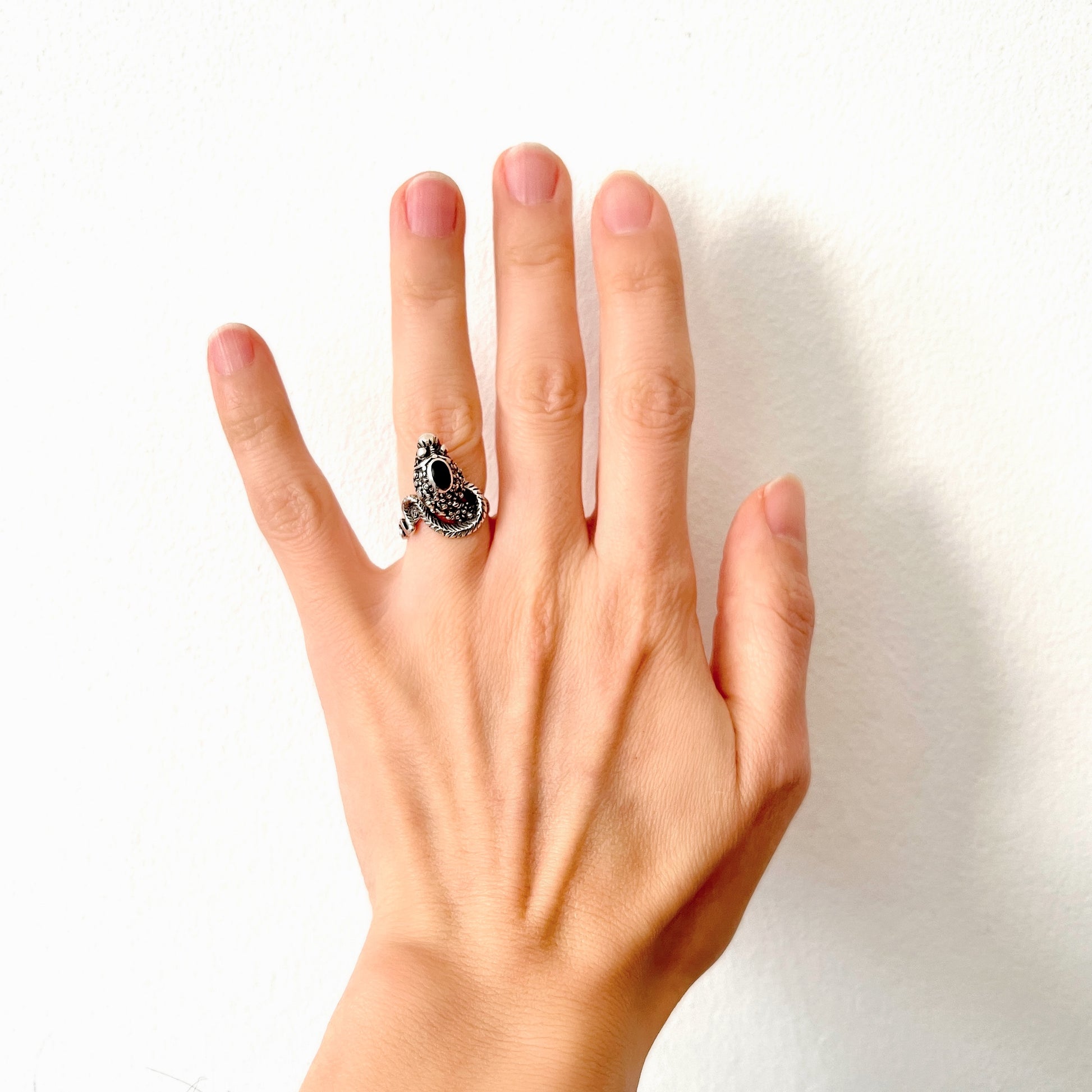頭部に楕円型のオニキスが据えられたコブラスネークのリング。