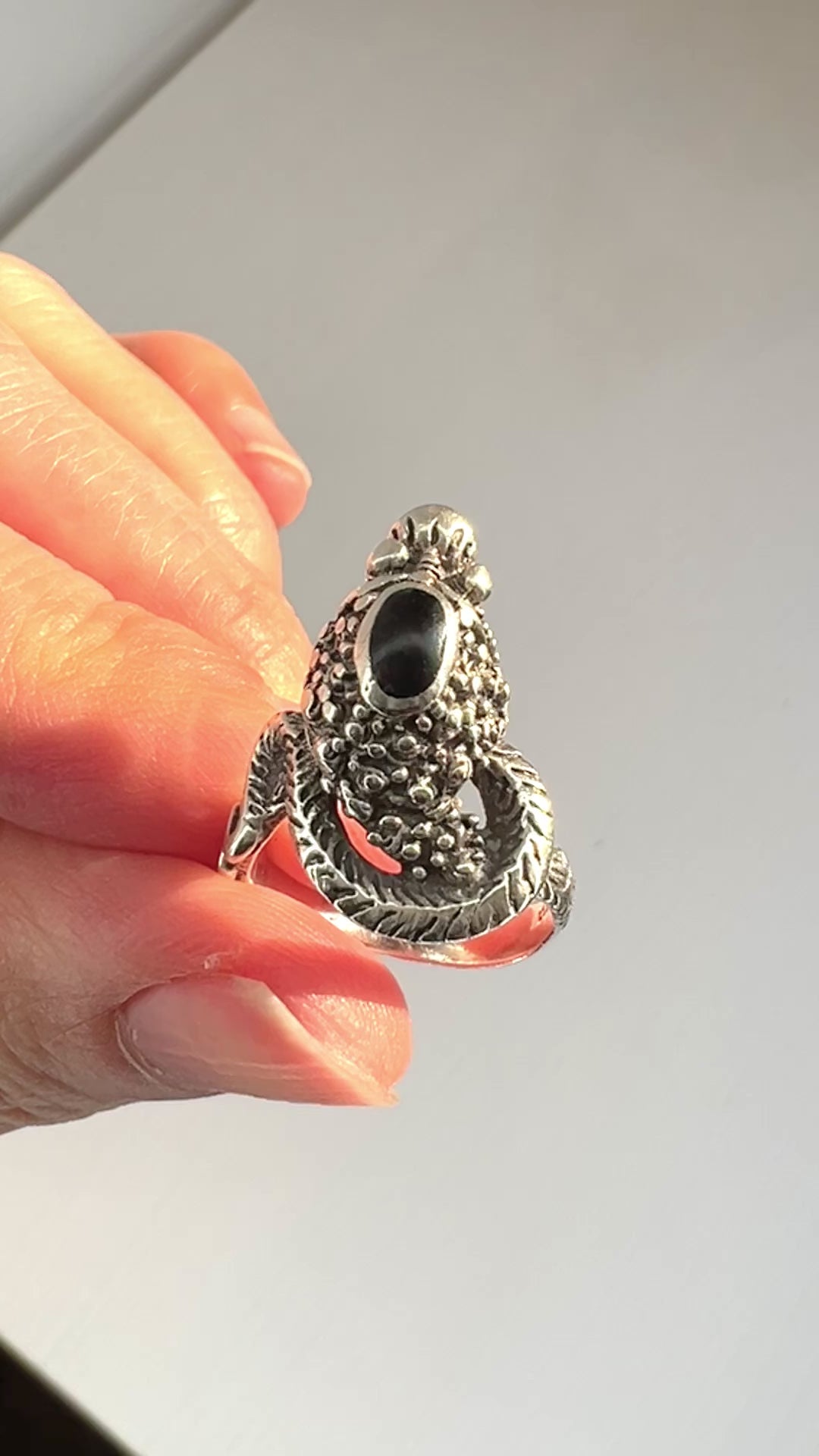 The bumps around the onyx and the ring itself are carved with patterns, creating an intricate design.