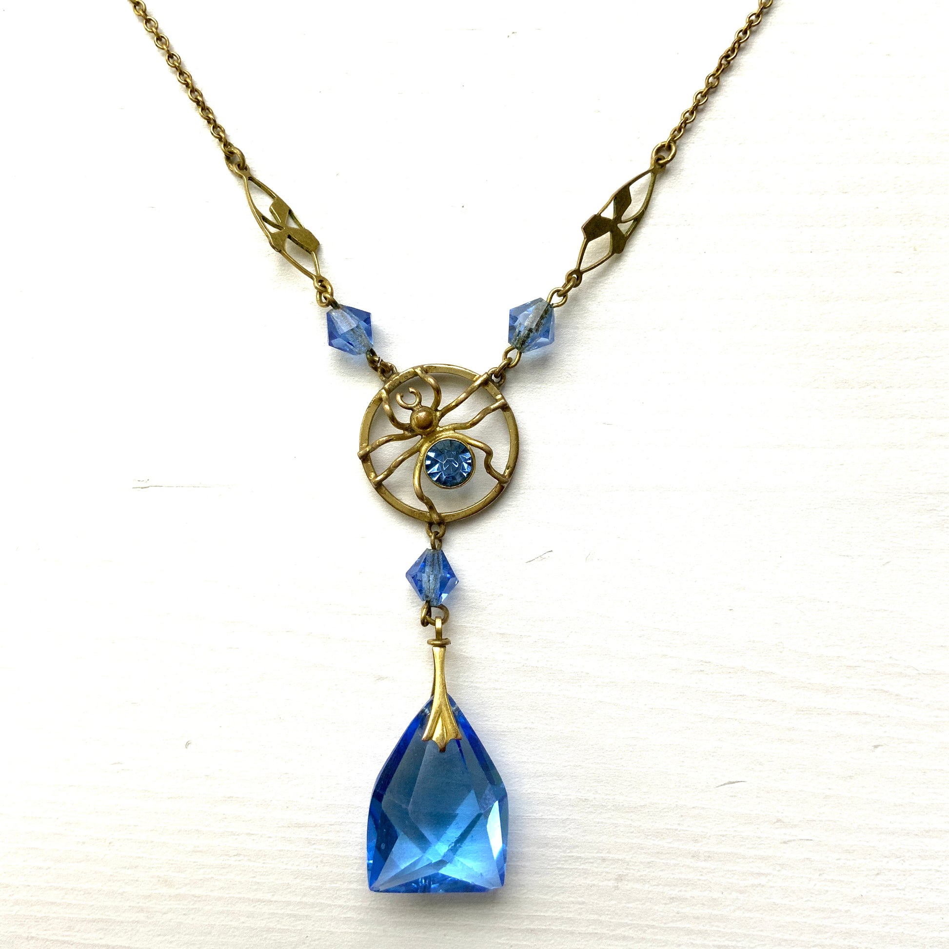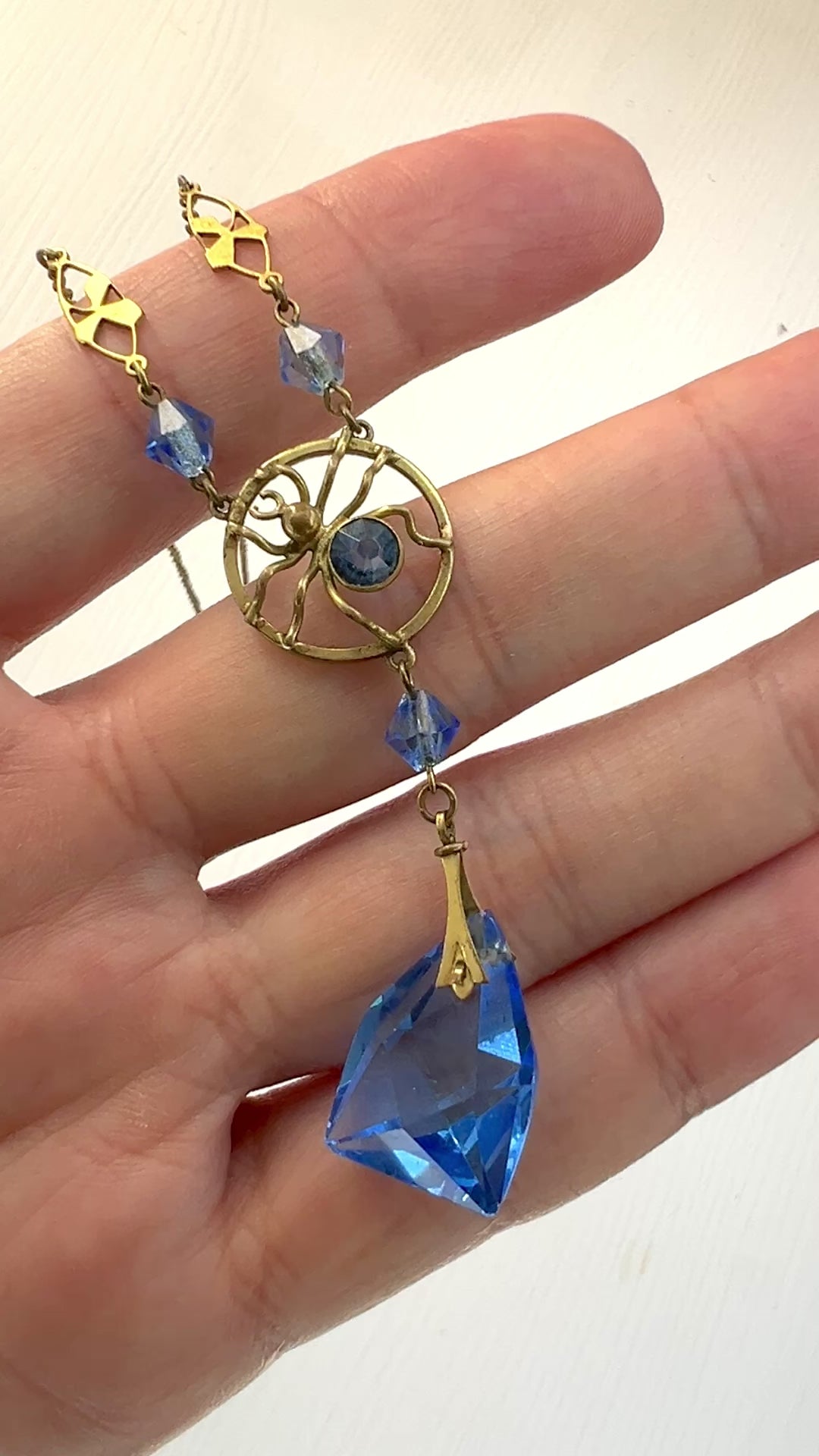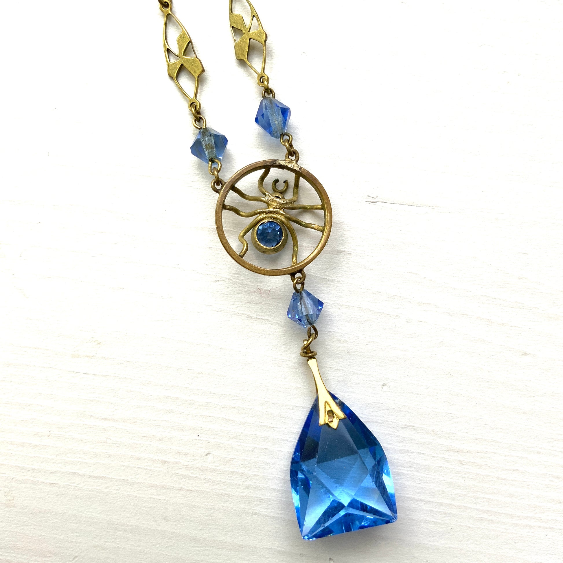 VINTAGE ART DEOCO WARD BROTHERS Blue Glass Spider Necklace