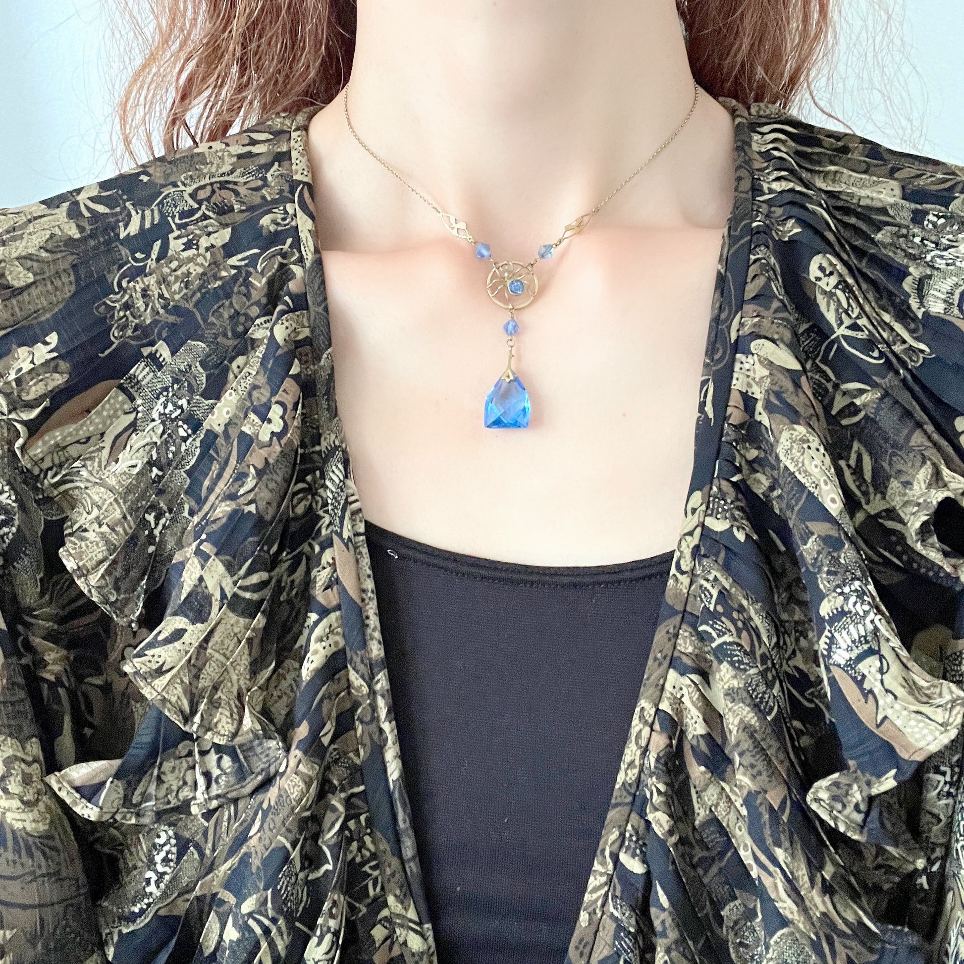 美しいブルーグラスに、ゴールドトーンの小さな蜘蛛がついたネックレス。