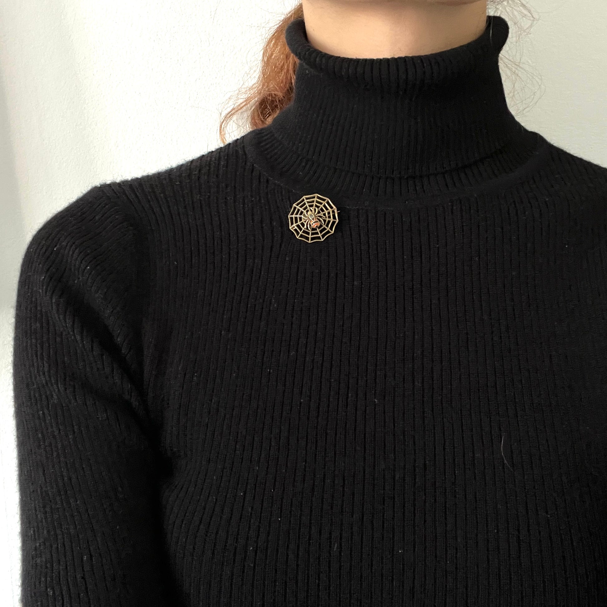 赤と黒のエナメル の小さな蜘蛛がついた、ゴールドトーンの蜘蛛の巣のミニブローチ。