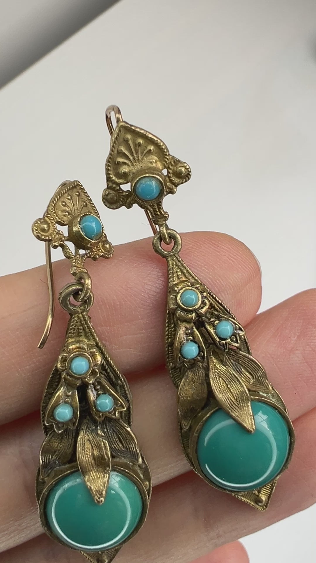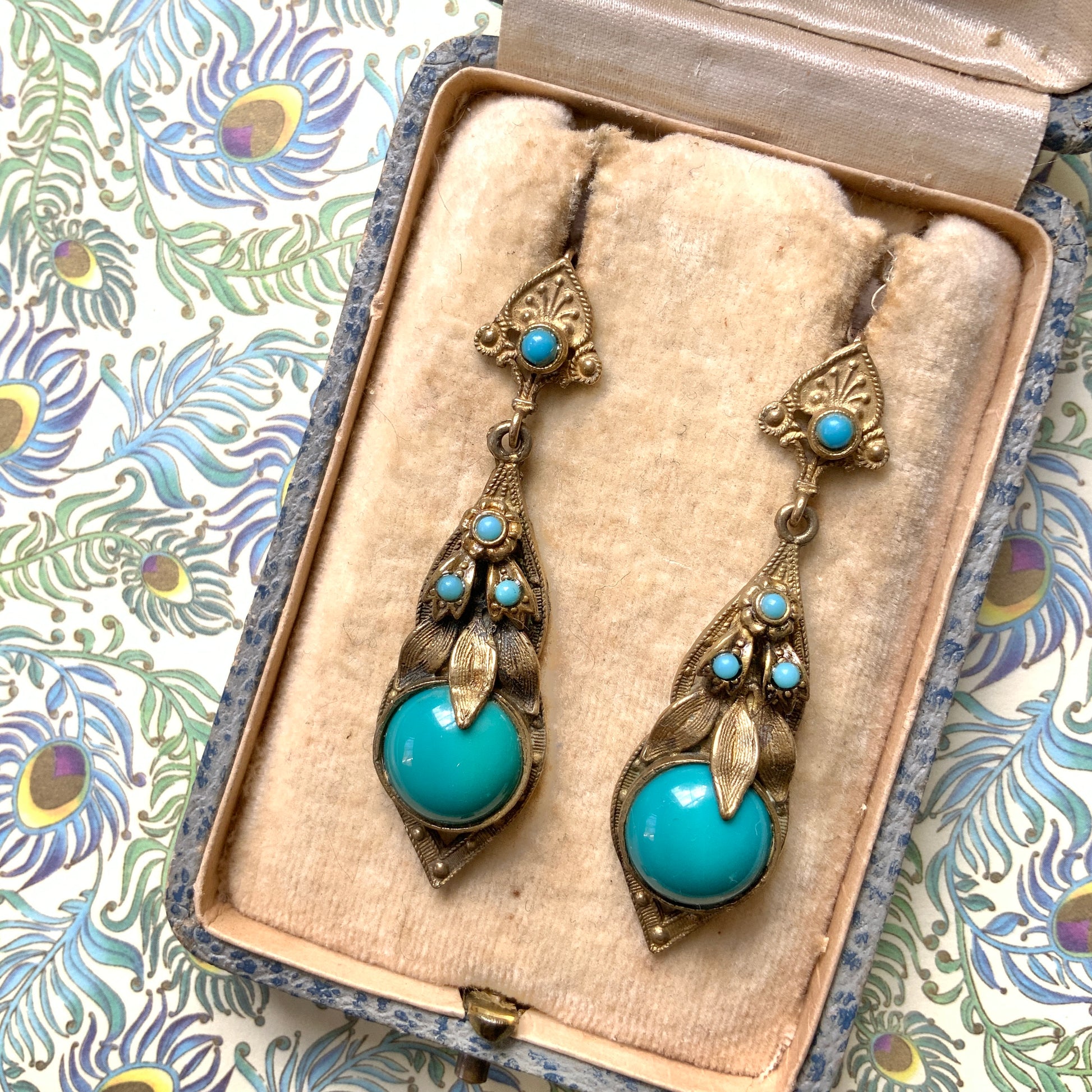 These earrings have a beautiful contrast between gold tones and vibrant turquoise blue.