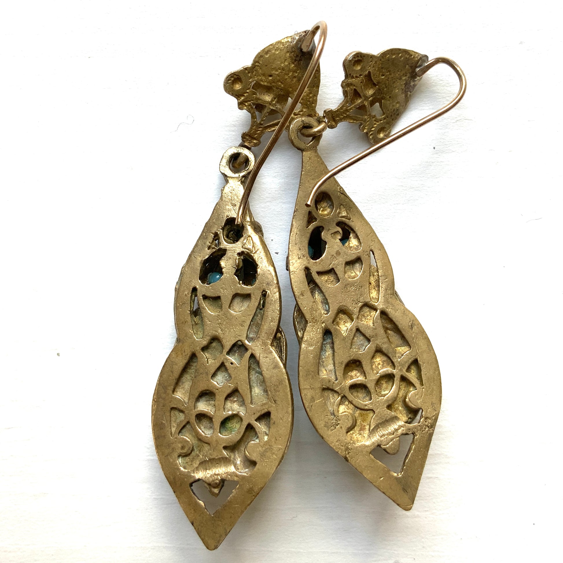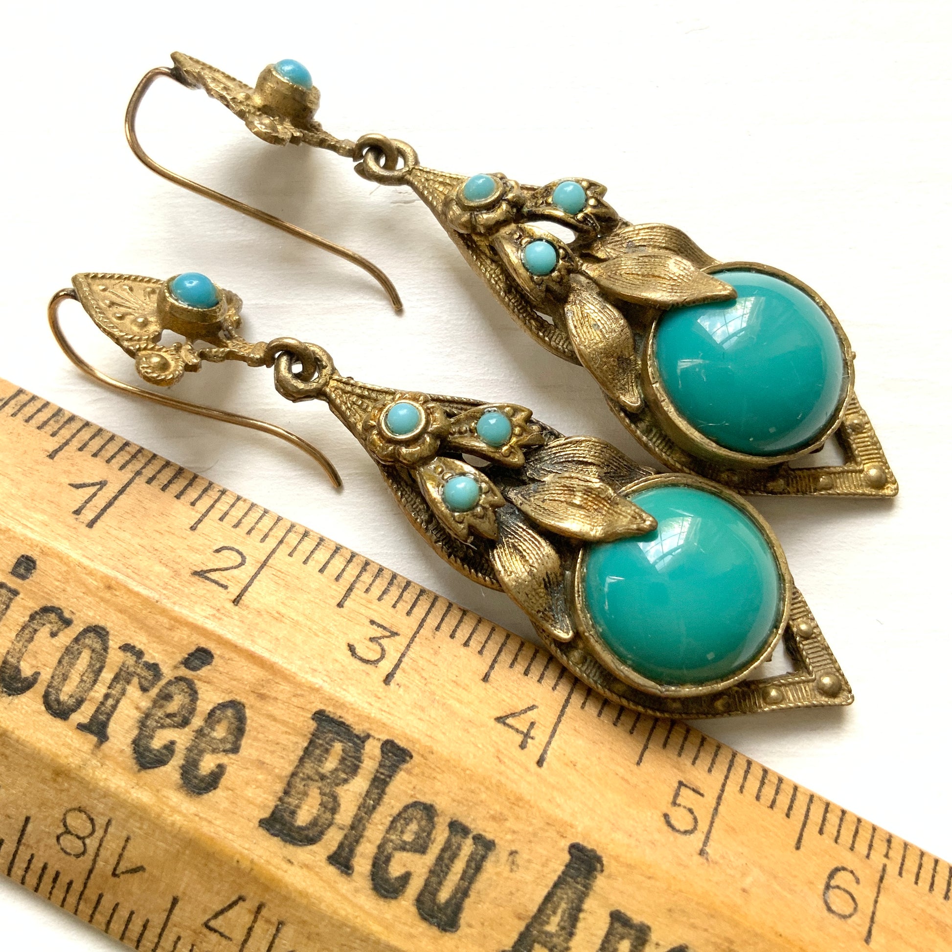 VINTAGE ART DECO Gold Tone Filigree & Turquoise Glass Pierced Earrings