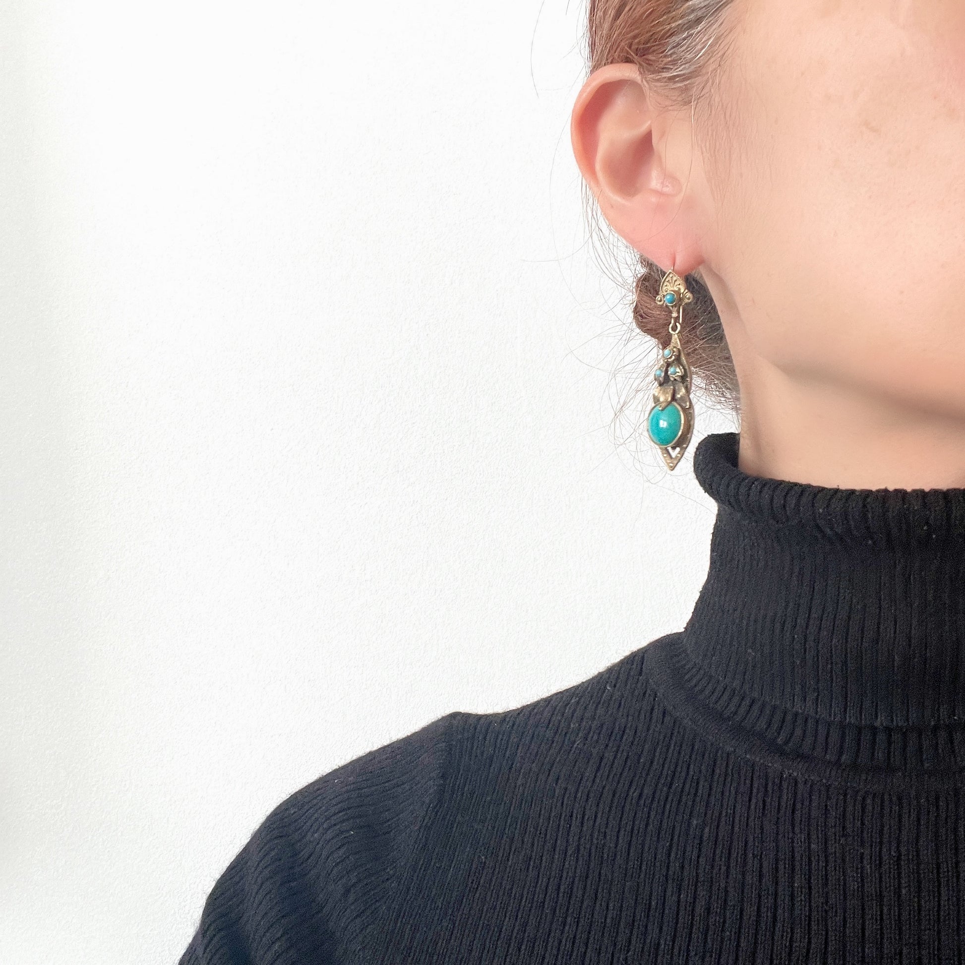 ゴールドトーンと鮮やかなターコイズブルーのコントラストが美しいピアス。
