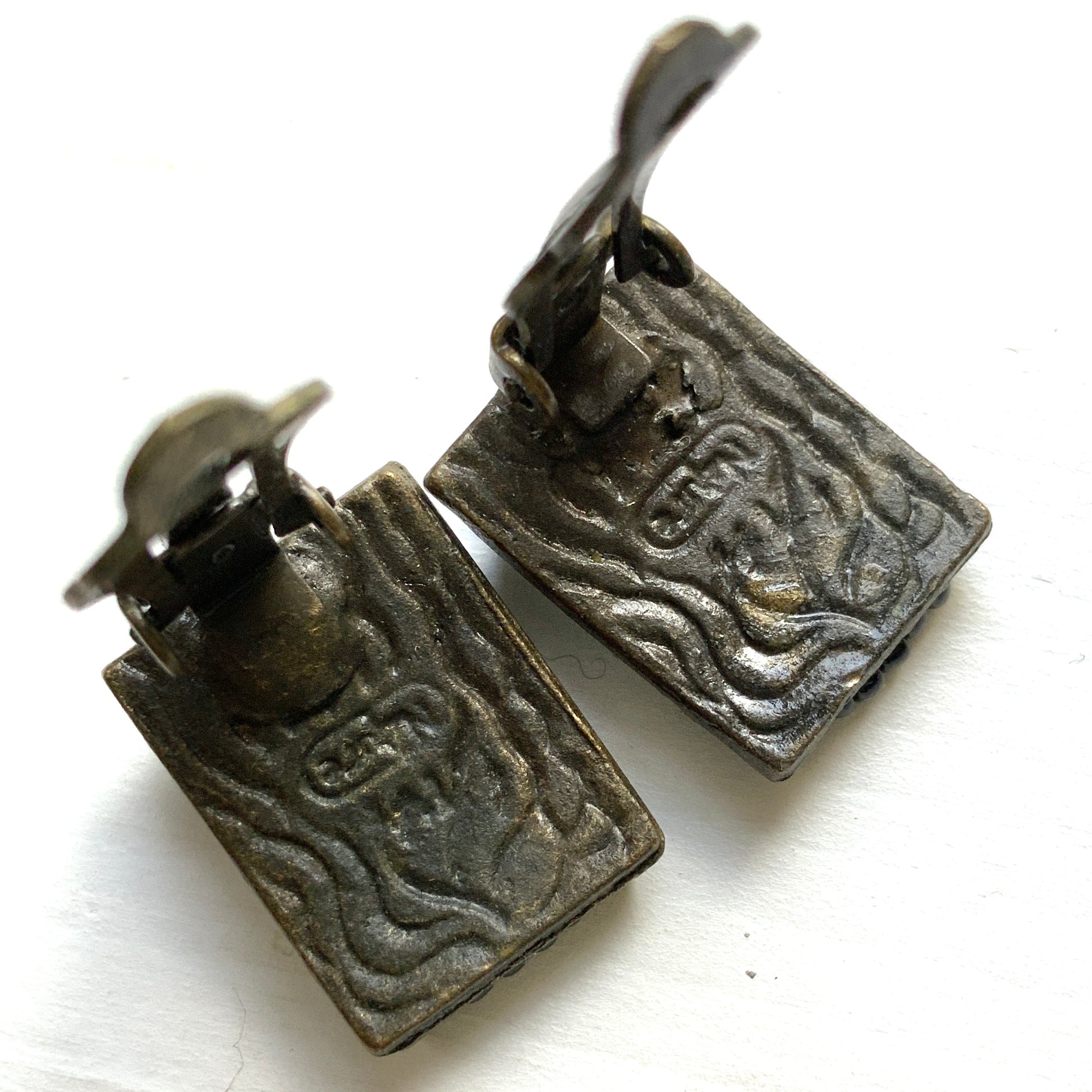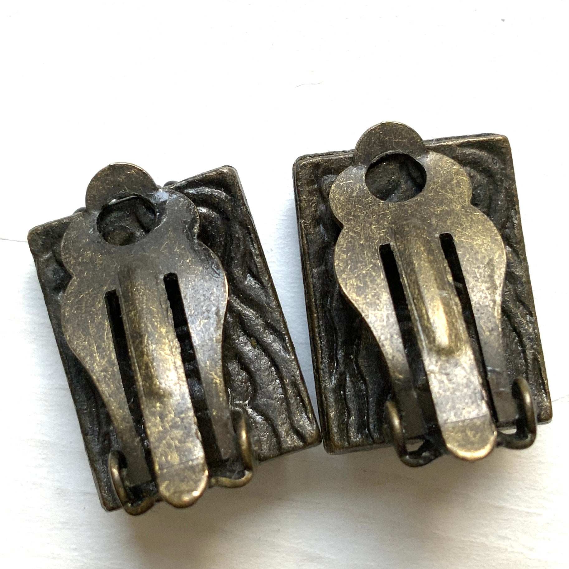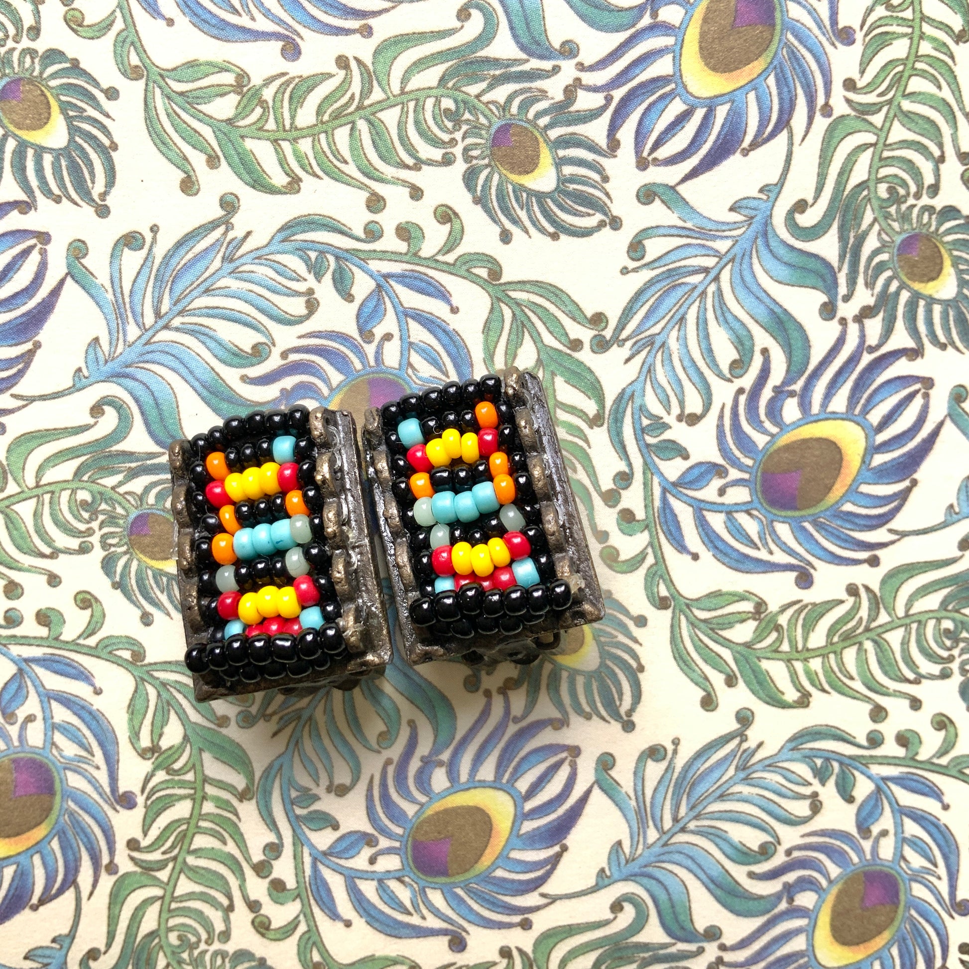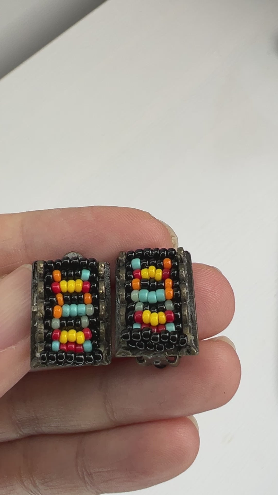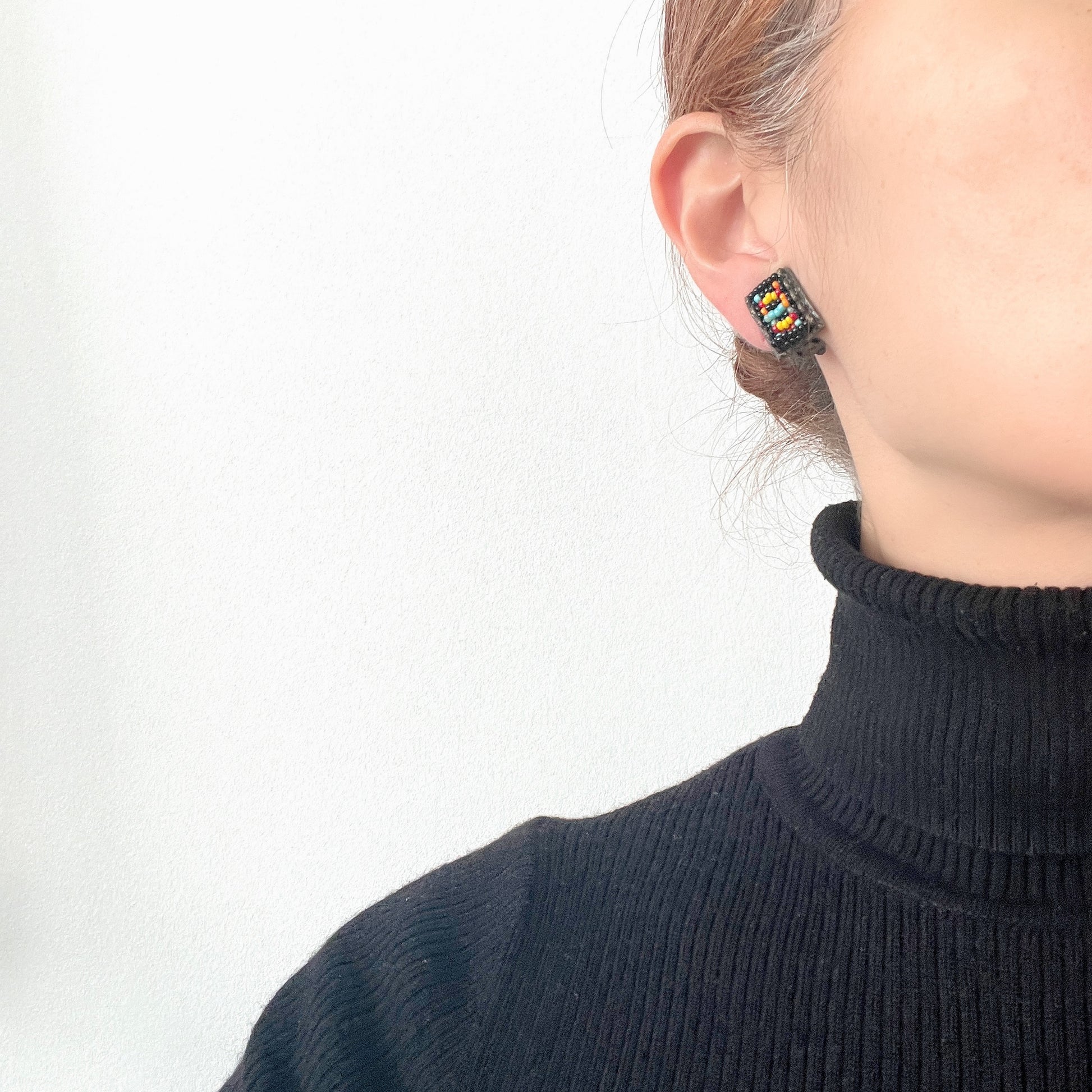 カラフルな小さいビーズが編み込まれた長方形のクリップイヤリング。