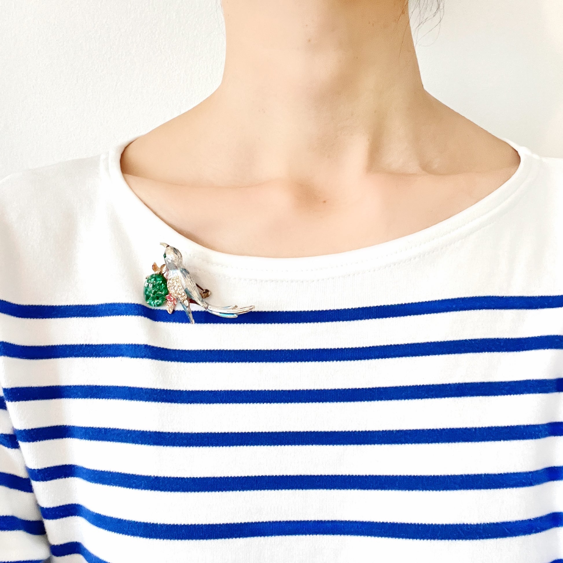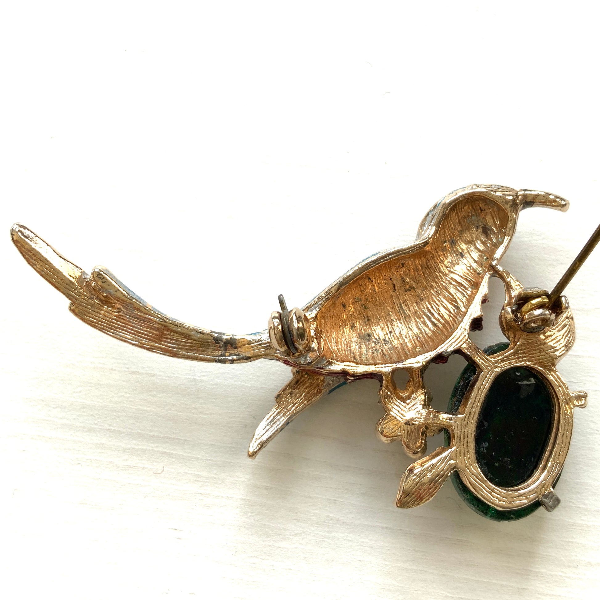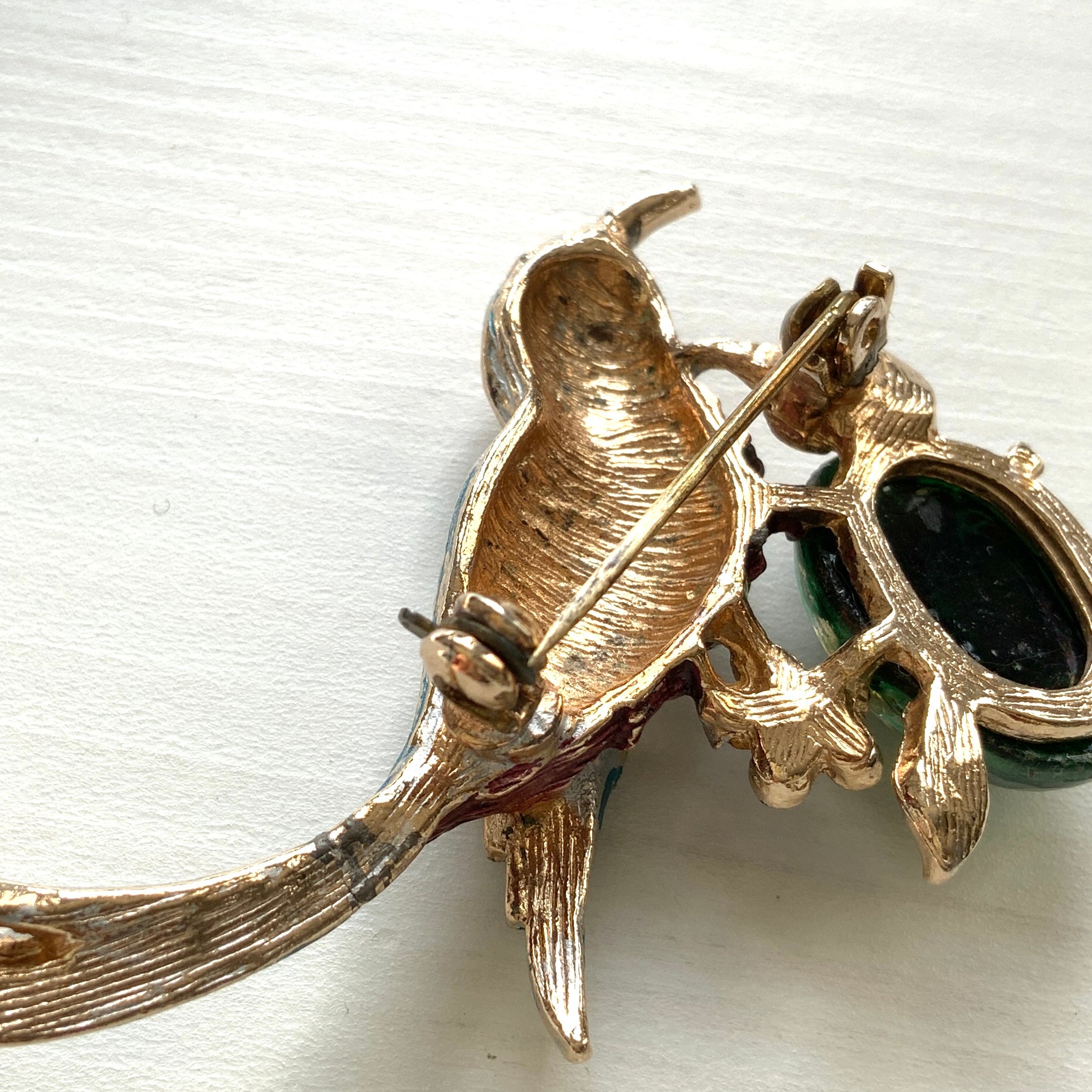 エナメルの青い鳥がグリーンのフォイルカボショングラスのついた枝にとまっているブローチ。