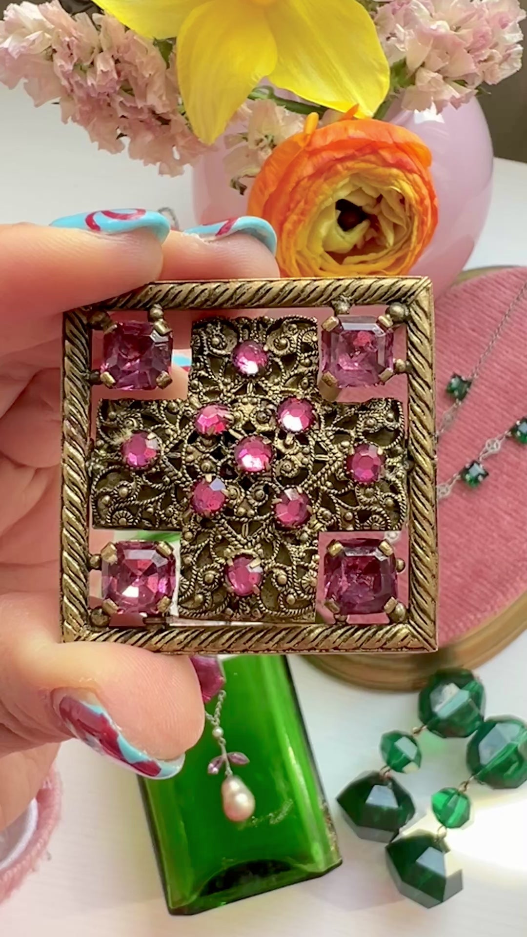 VINTAGE 1930s Square Filigree Reversible Brooch with Pink Rhinestones