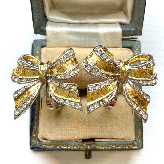 VINTAGE 1980s Gold & Rhinestone Bow Clip-On Earrings