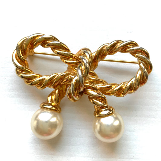 VINTAGE 1980s Gold Twisted Rope & Pearl Bow Brooch